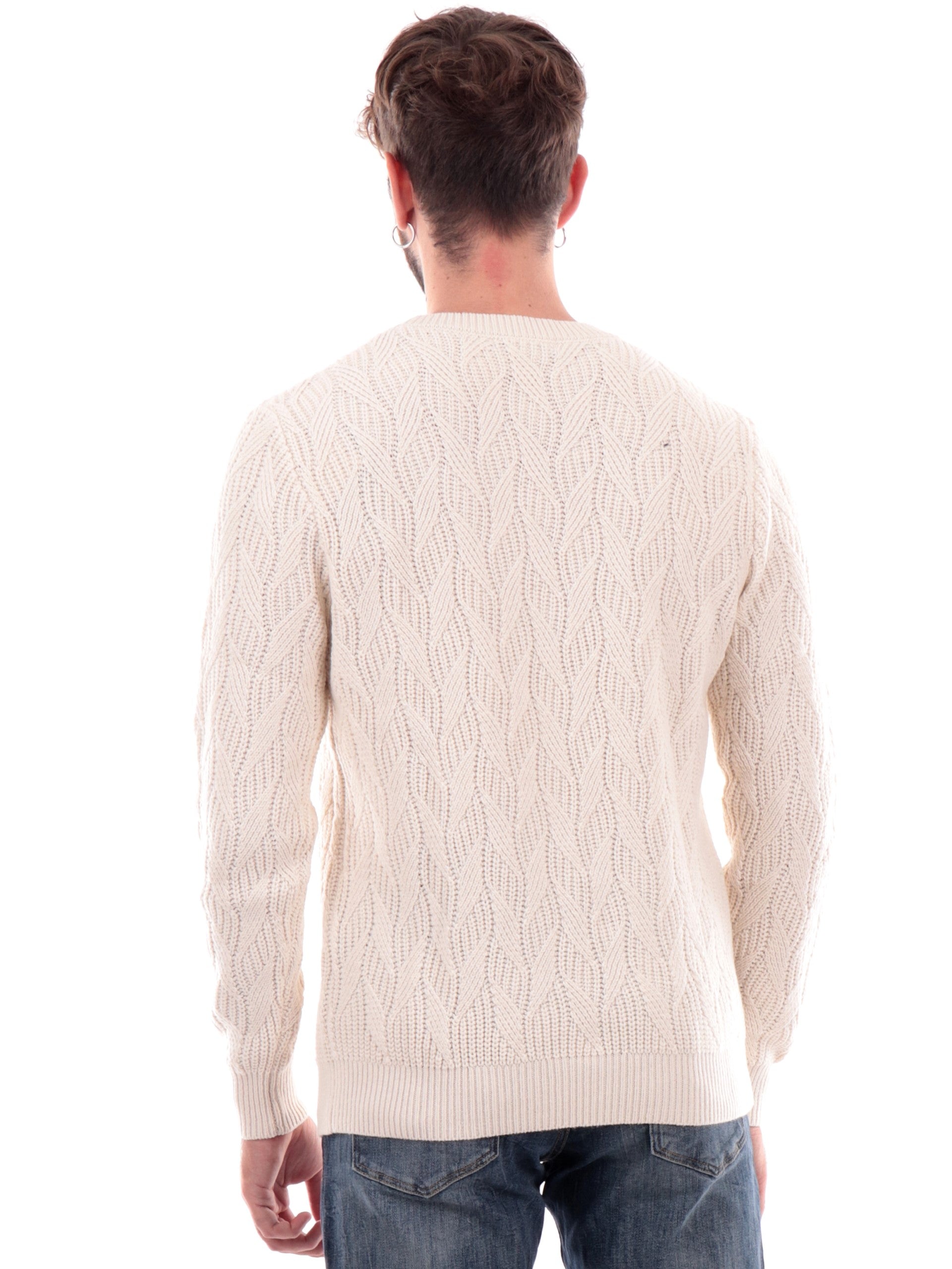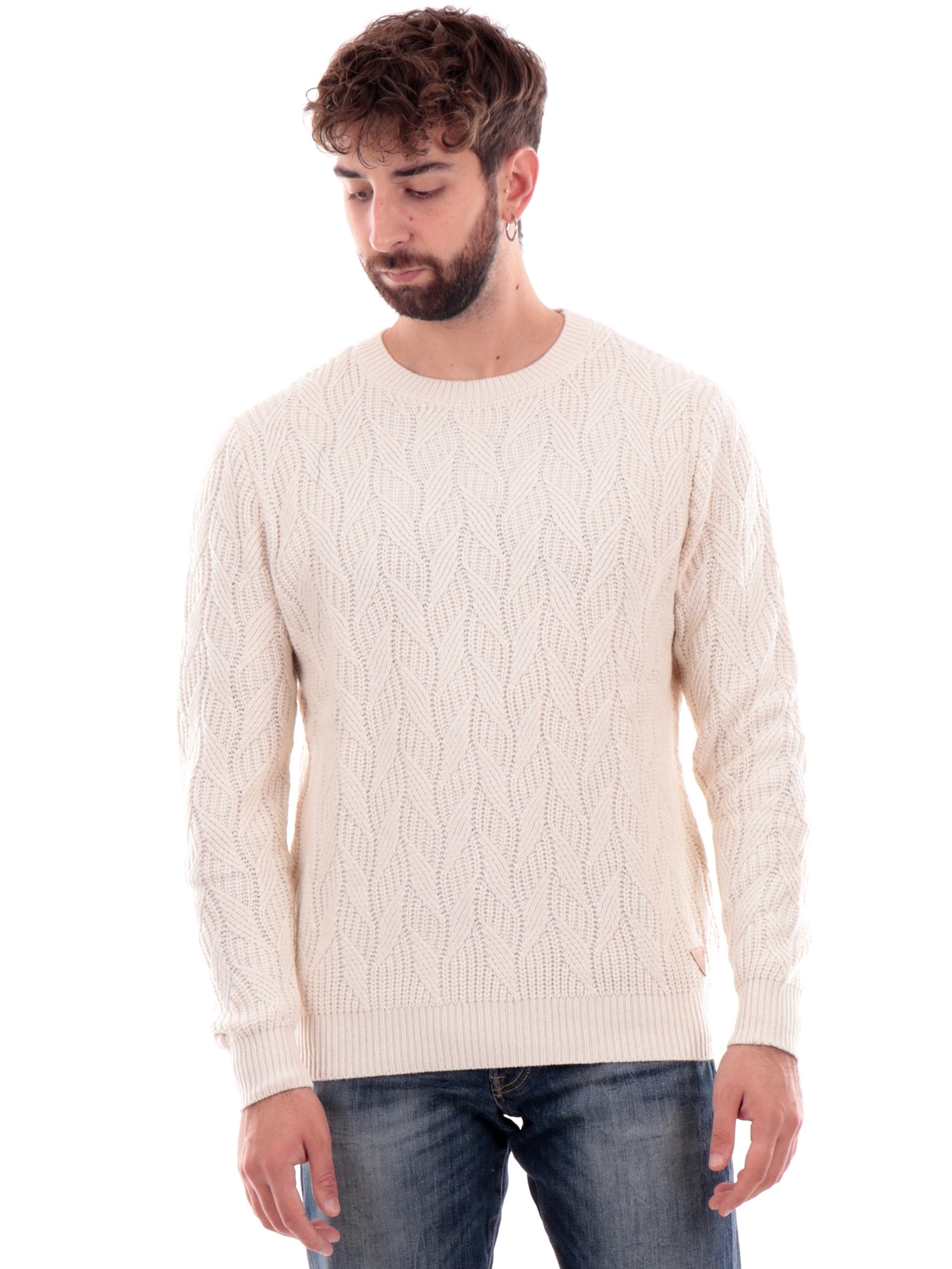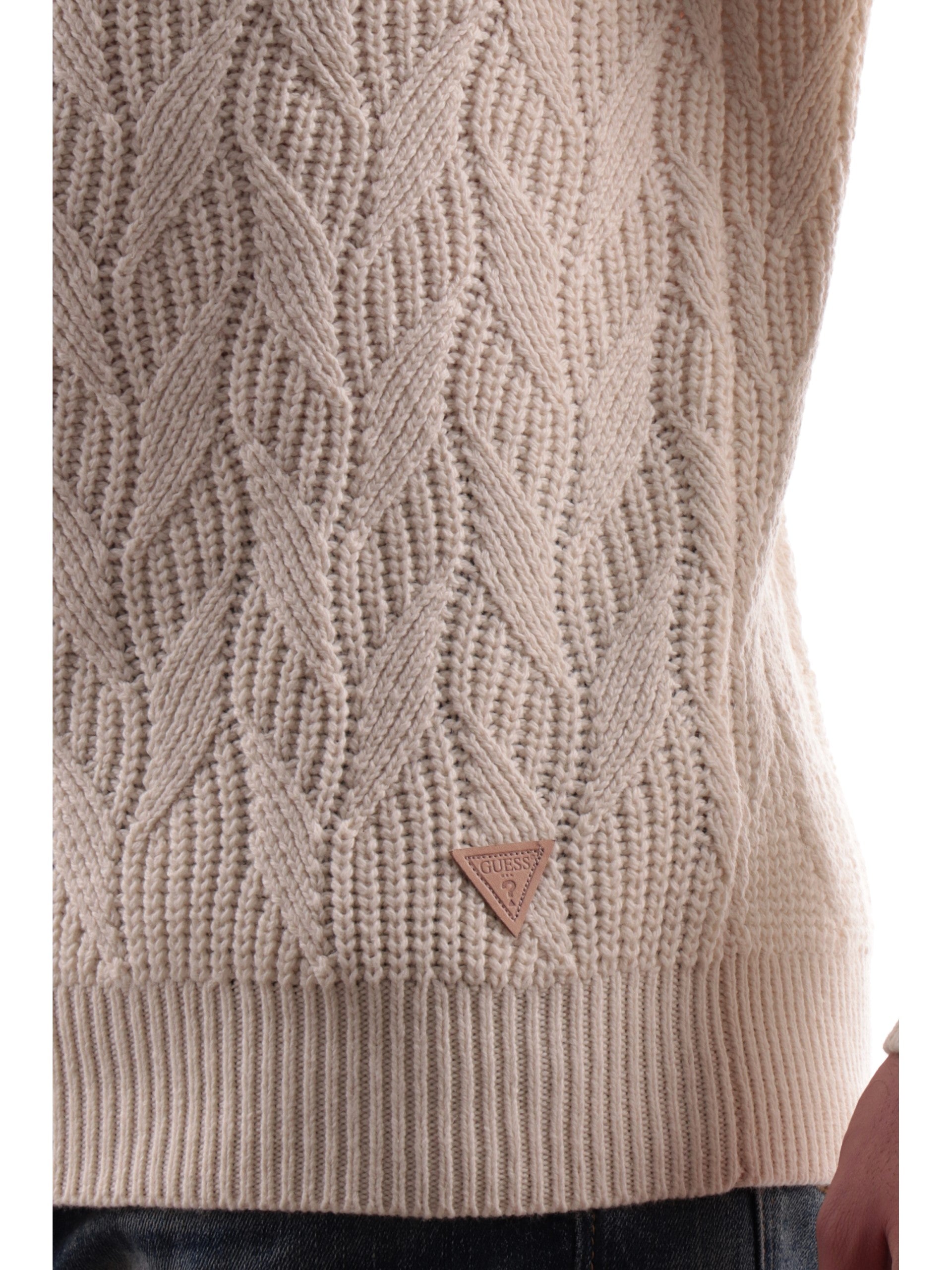 Maglione girocollo Guess bianco da uomo Evander M4BR19Z3HD1. Questo maglione Guess bianco girocollo lavorato a nodi ha il patch del brand cucito sul fondo a contrasto colore, polsini e fondo elasticizzati a costine.