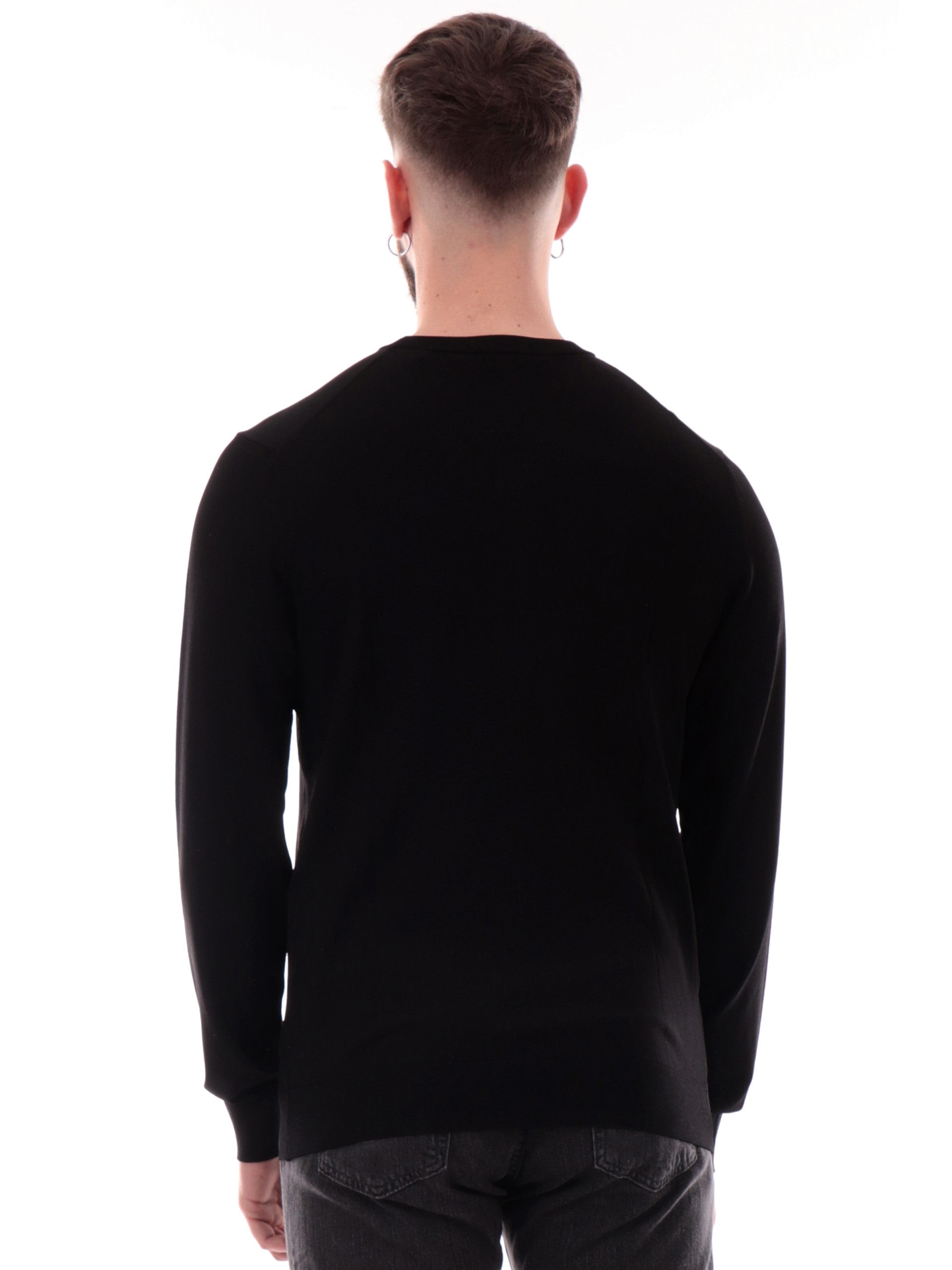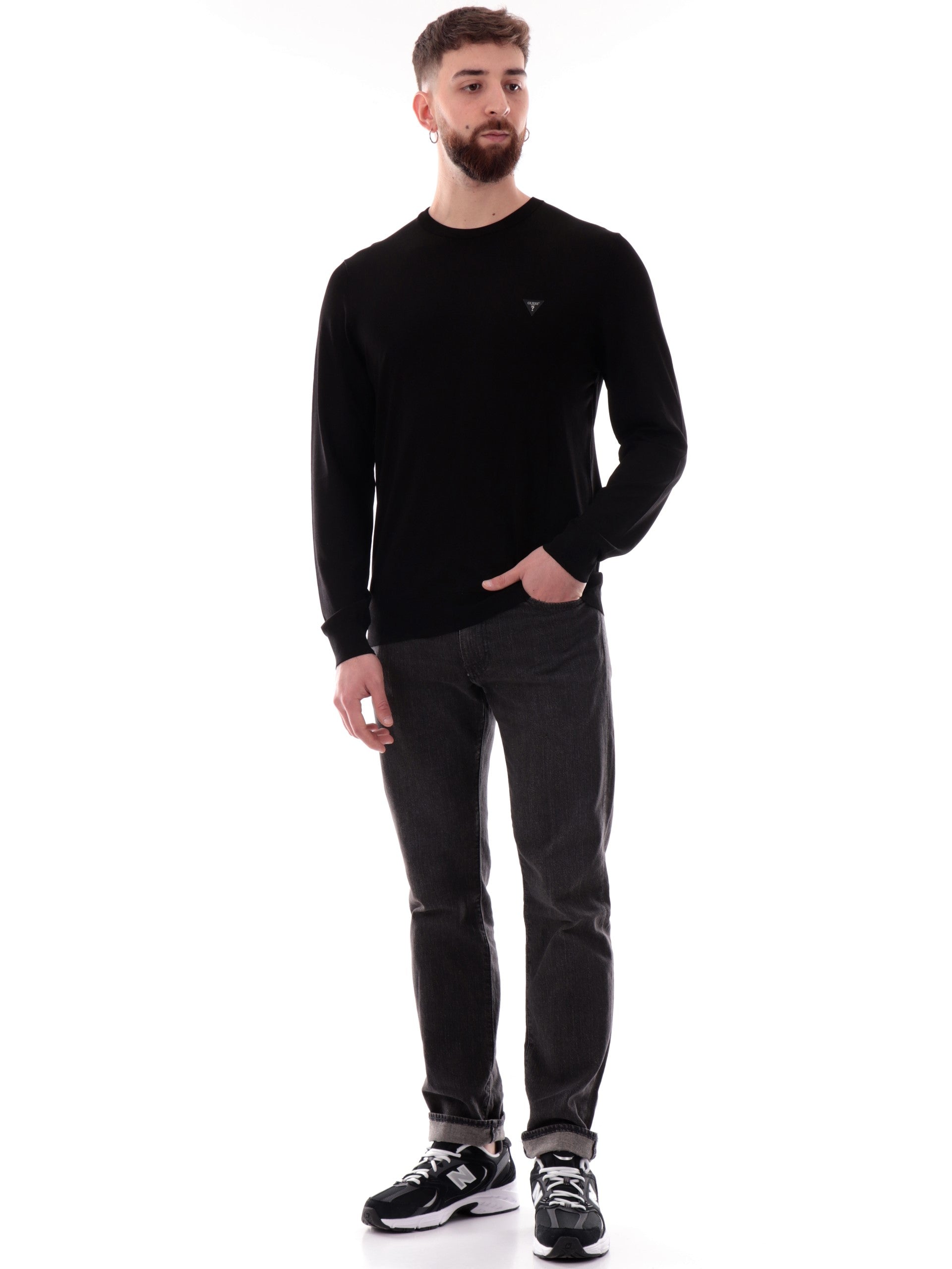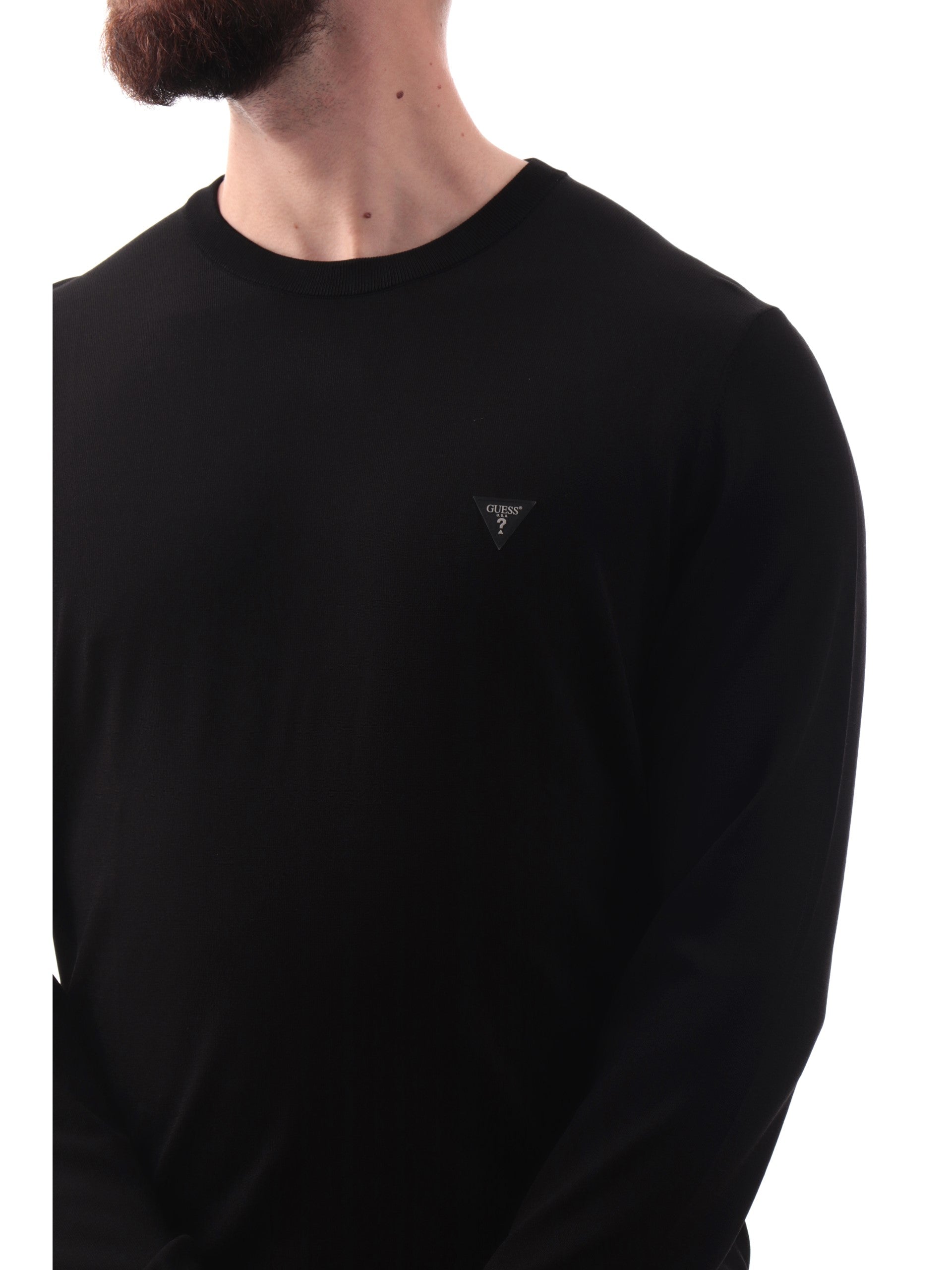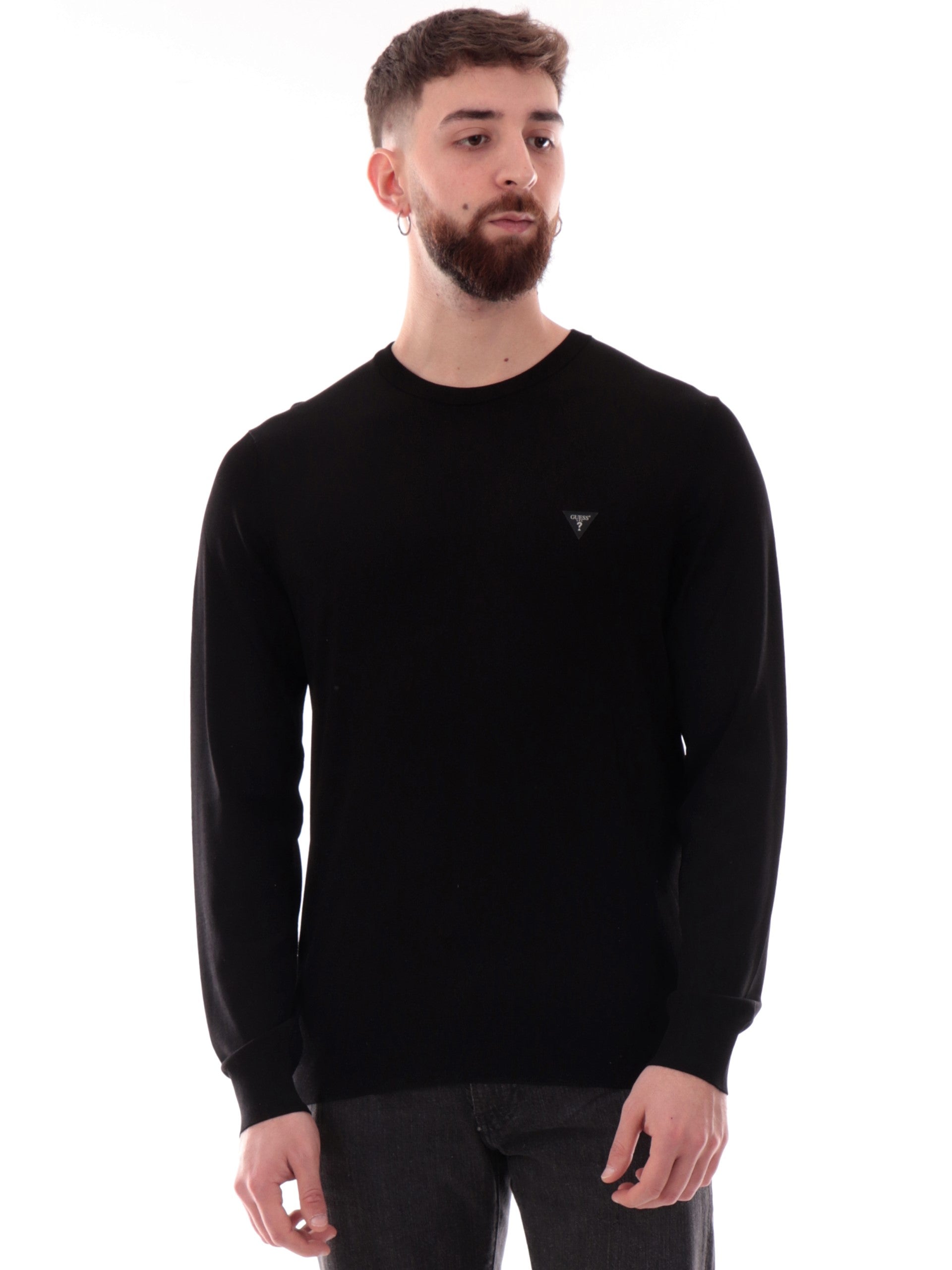 Maglione Guess Dane Tech nero da uomo patch Guess gommato M4YR29Z3DM0, realizzato in viscosa. Questo maglione uomo Guess nero girocollo ha le maniche lunghe, il patch Guess gommato applicato lato cuore, polsini e fondo elasticizzati.