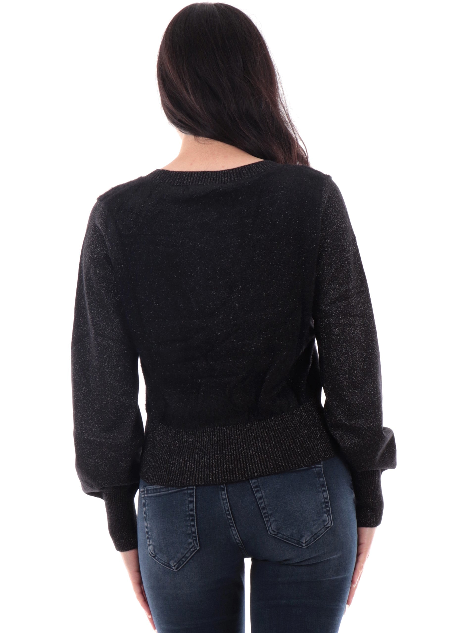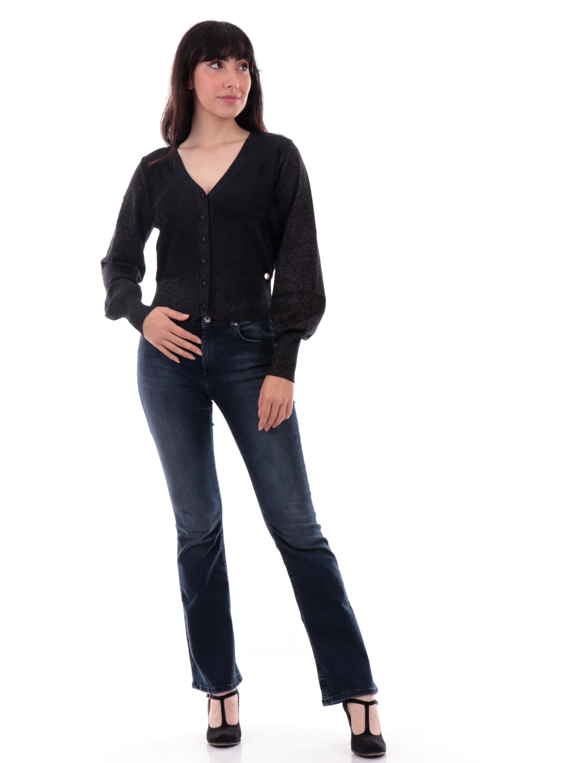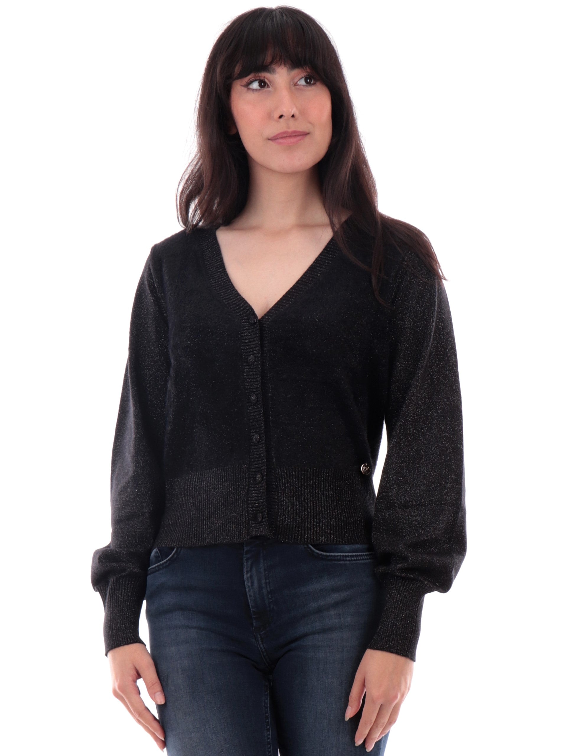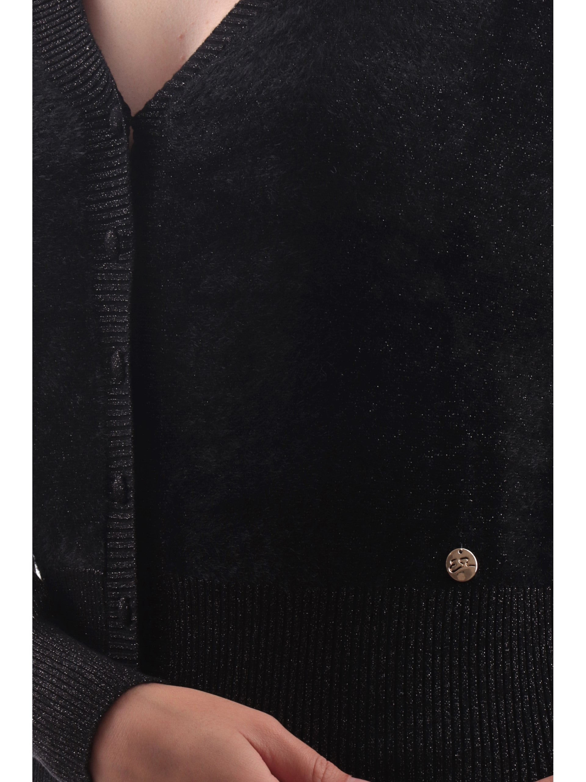 Cardigan Yes Zee nero da donna in lurex e pelliccia eco M092IS000. Questo cardigan donna Yes Zee nero ha lo scollo a V, la chiusura con bottoni, polsini e fondo elasticizzati a costine.