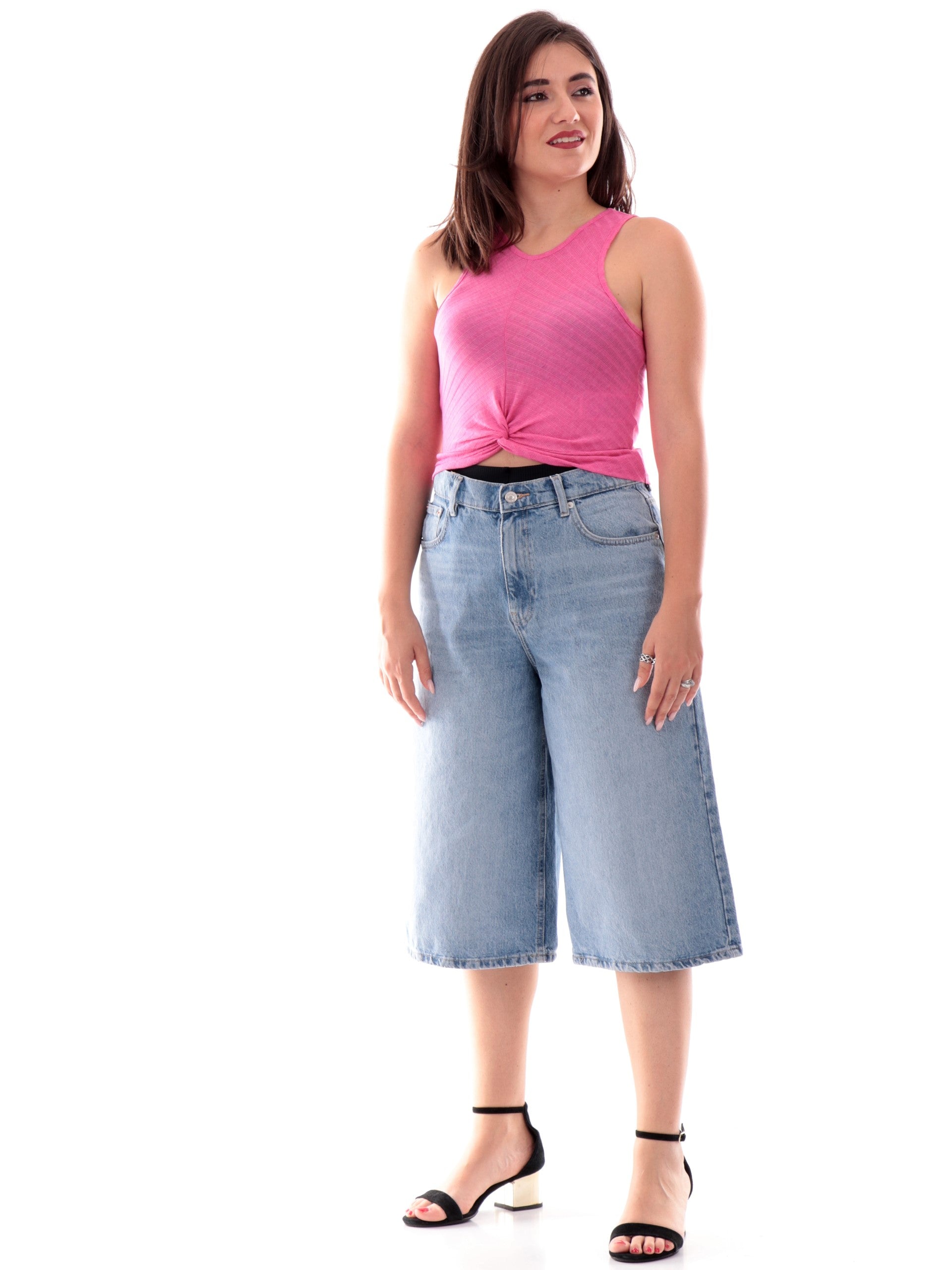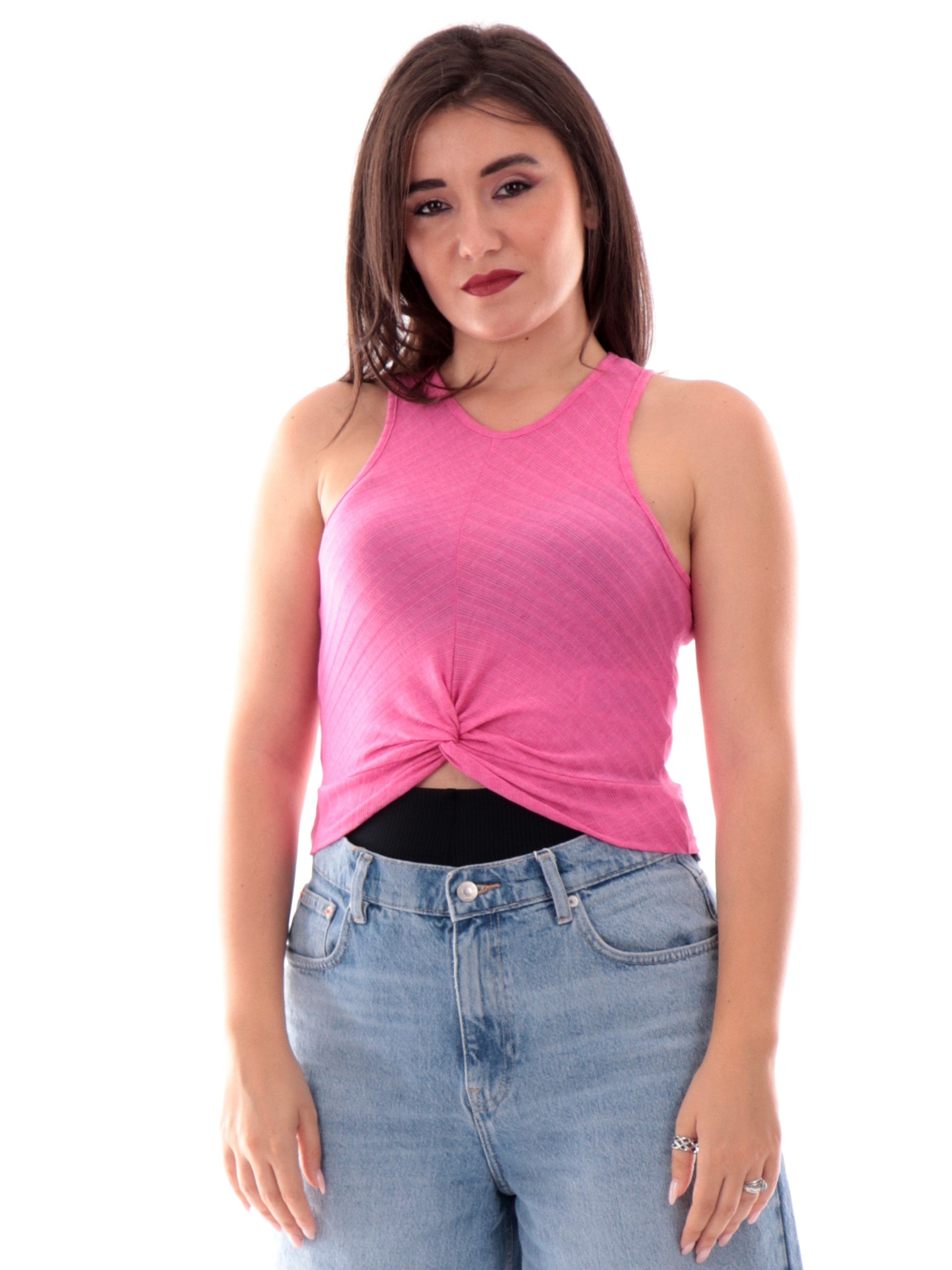 Crop Top Fucsia Only da donna è caratterizzato da nodo sul davanti e costine. Questo top Crop donna rosa è realizzato in tessuto leggero elasticizzato perfetto per l'estate.