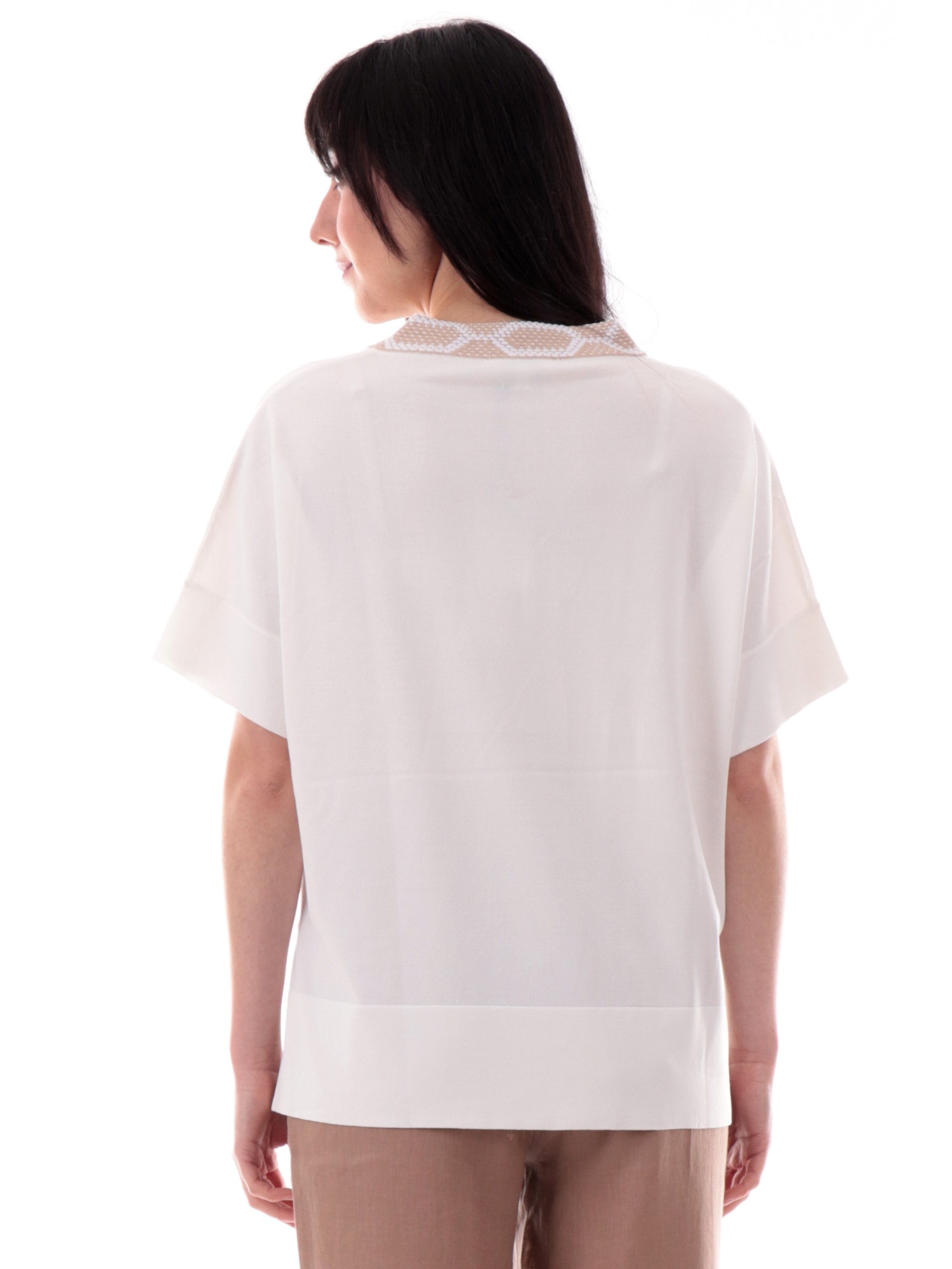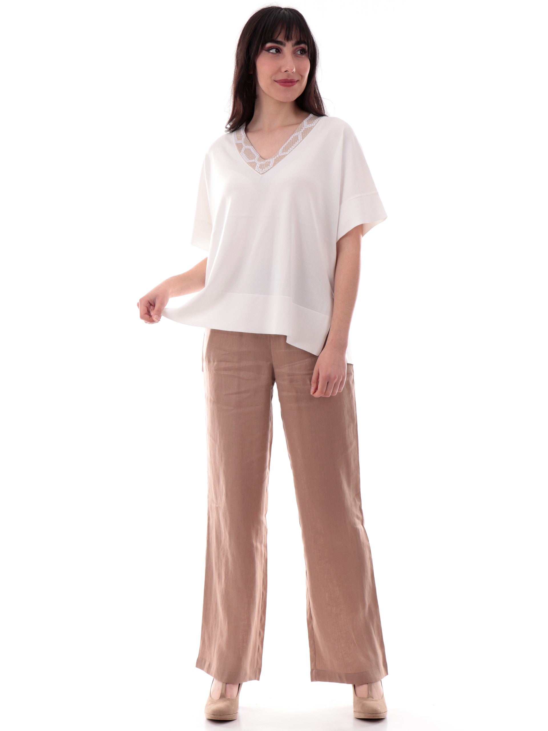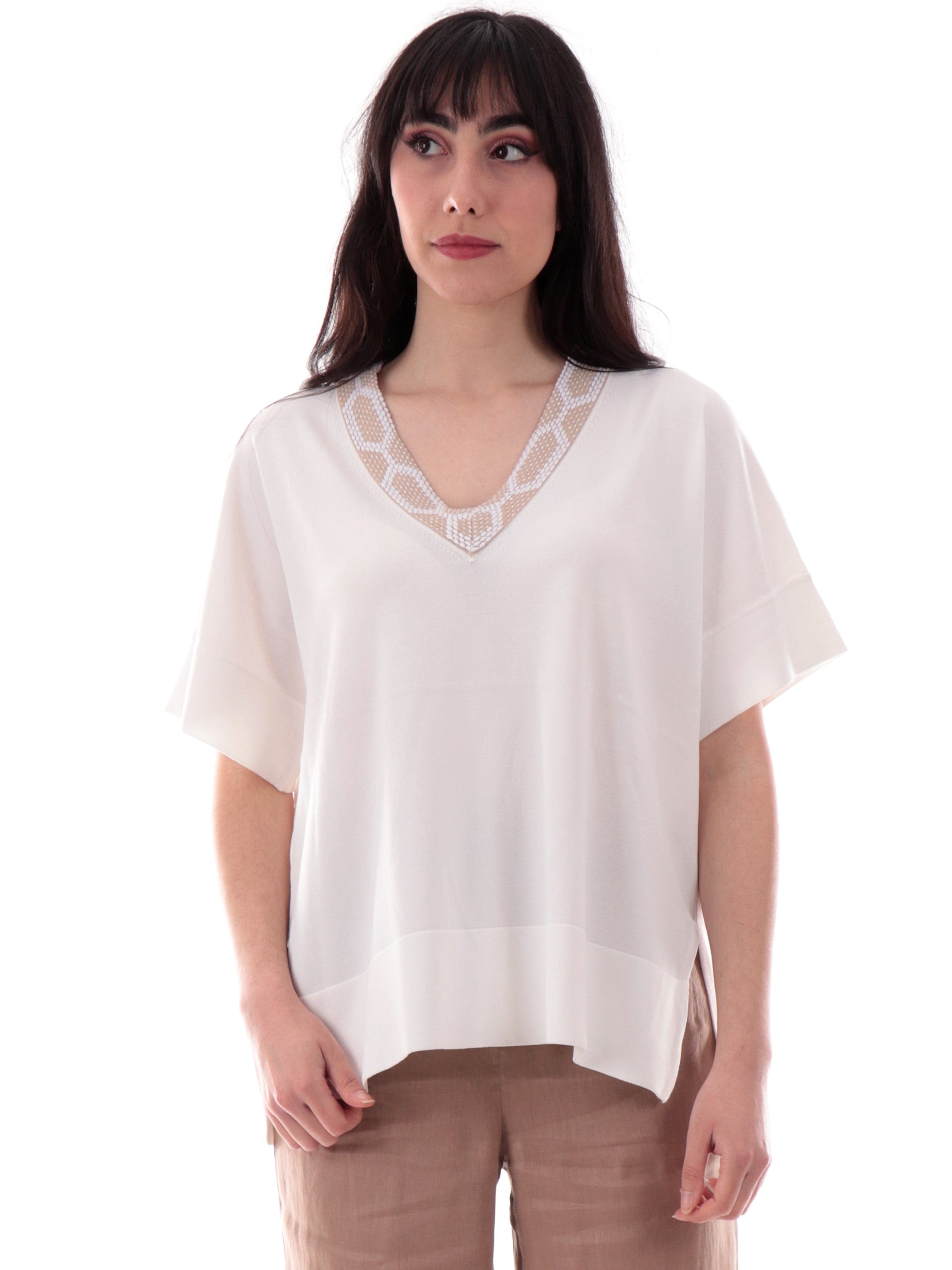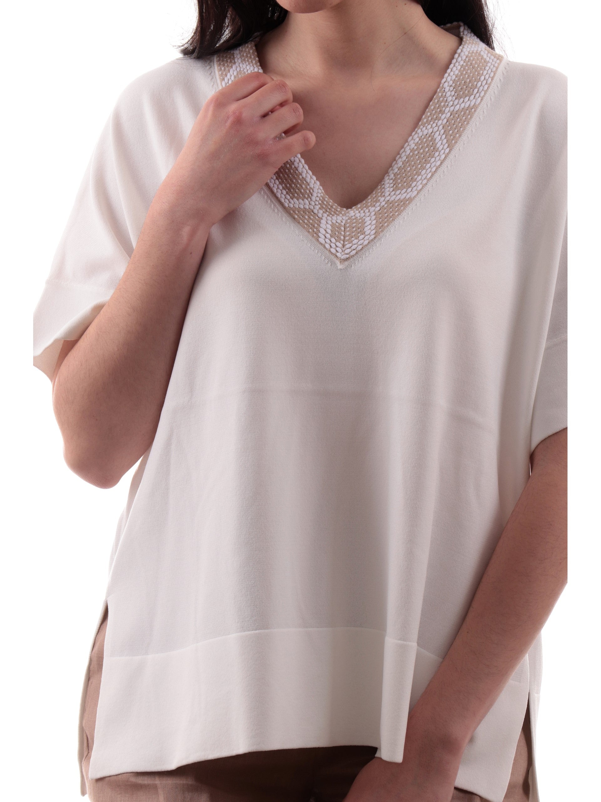 Kimono Anis bianco scollo a V da donna vestibilità morbida 251W1032, realizzato in viscosa. Questo maglione Anis White ha lo scollo a V con decorazione in tessuto intrecciato, le maniche kimono e la vestibilità morbida.