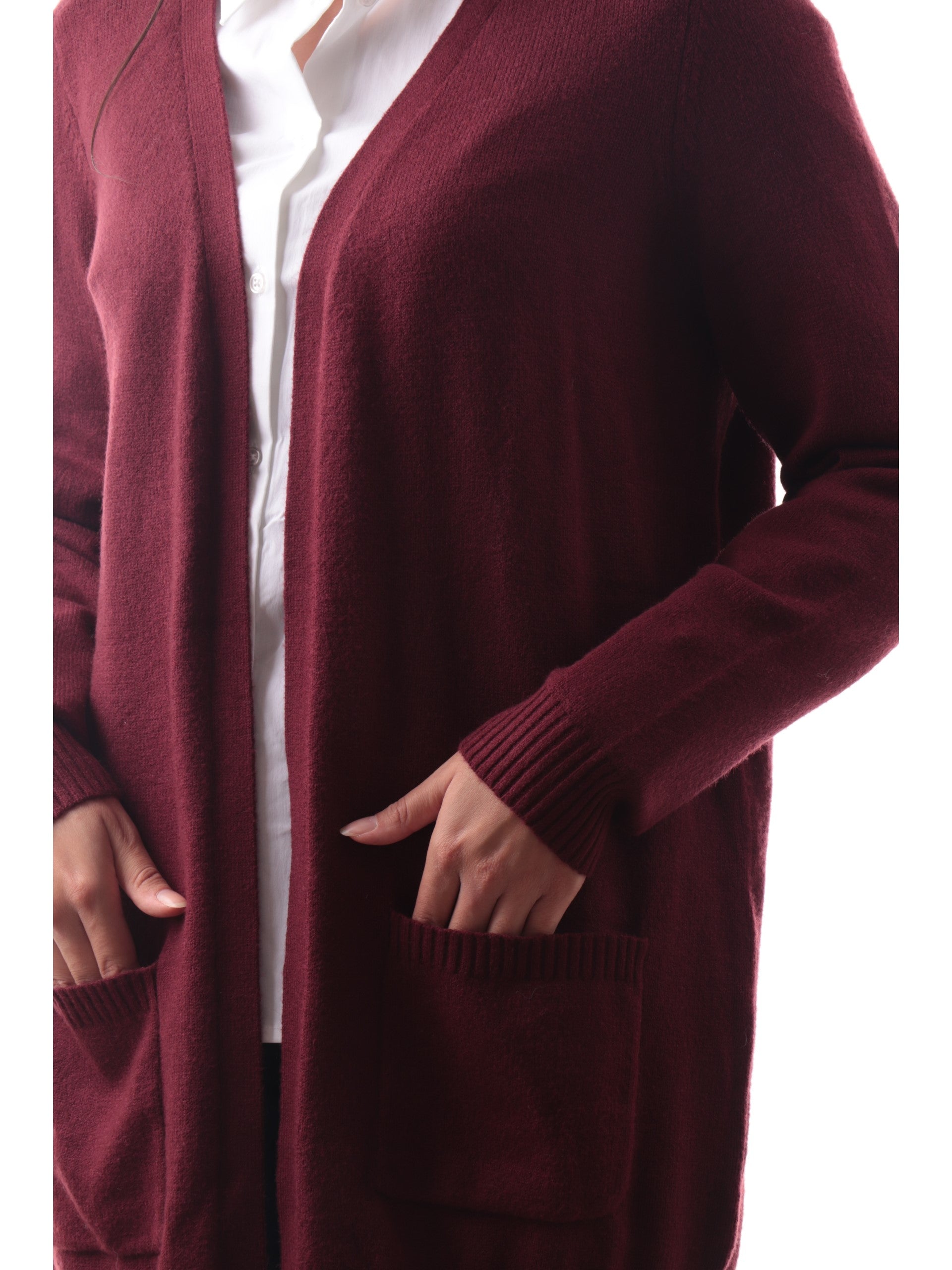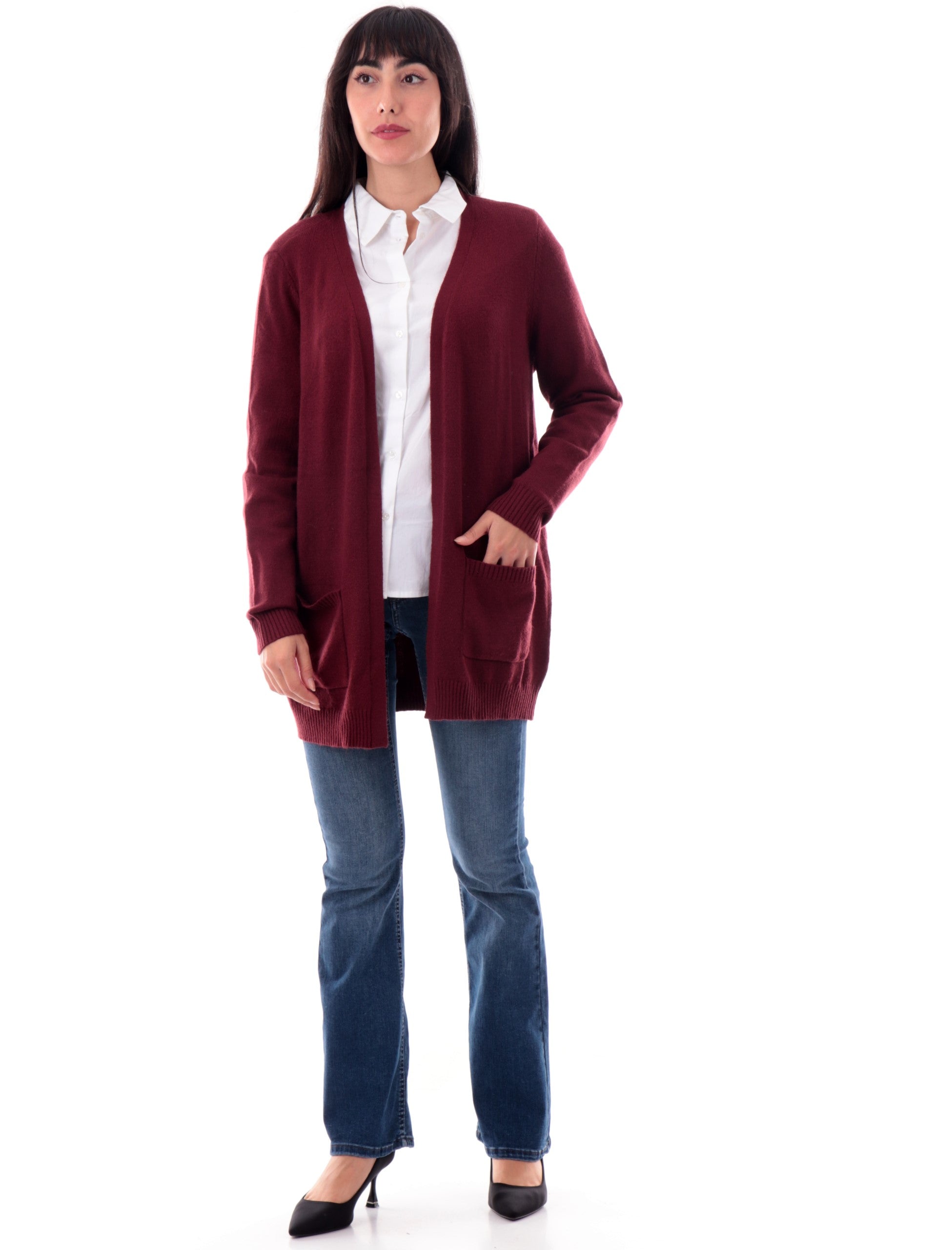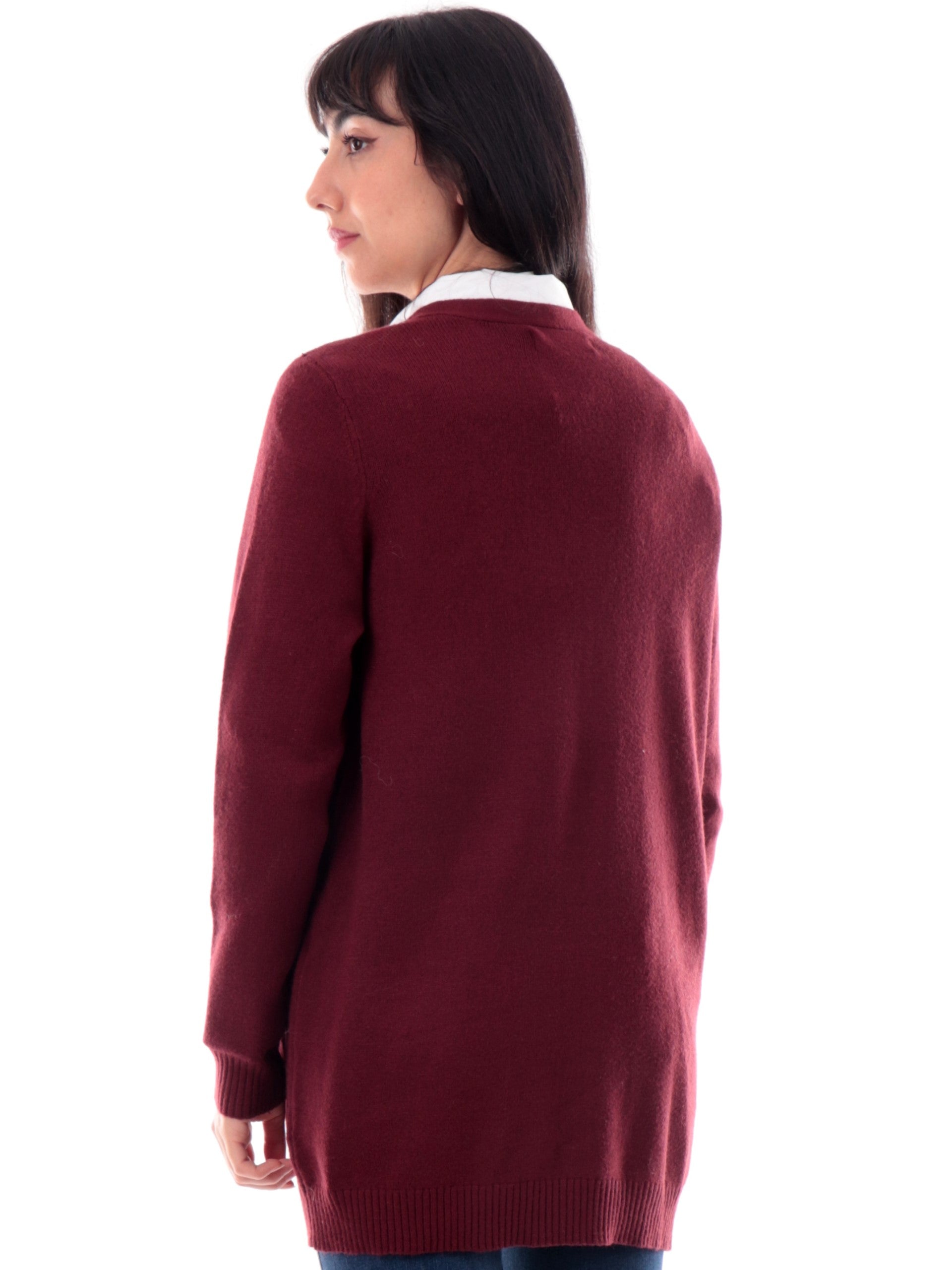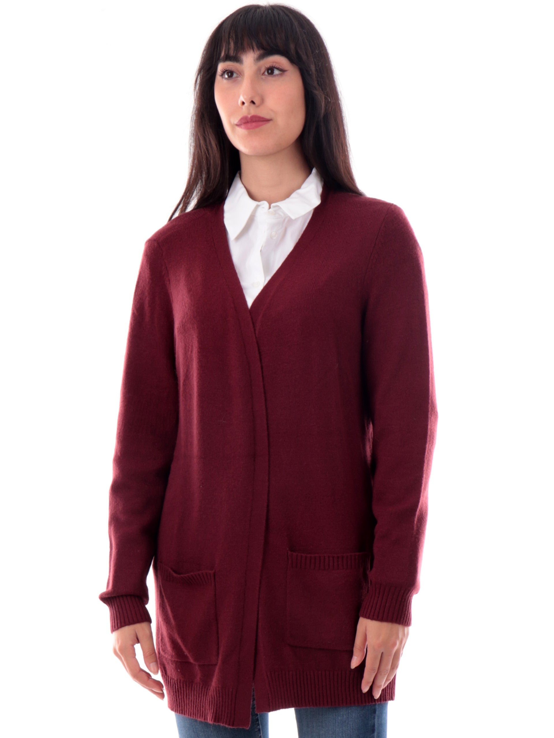 Cardigan lungo Only Donna in morbido e caldo tessuto bordeaux. Questo cardigan lungo Only da donna è caratterizzato da tasche laterali aperte, da abbinare con ciò che più ti piace