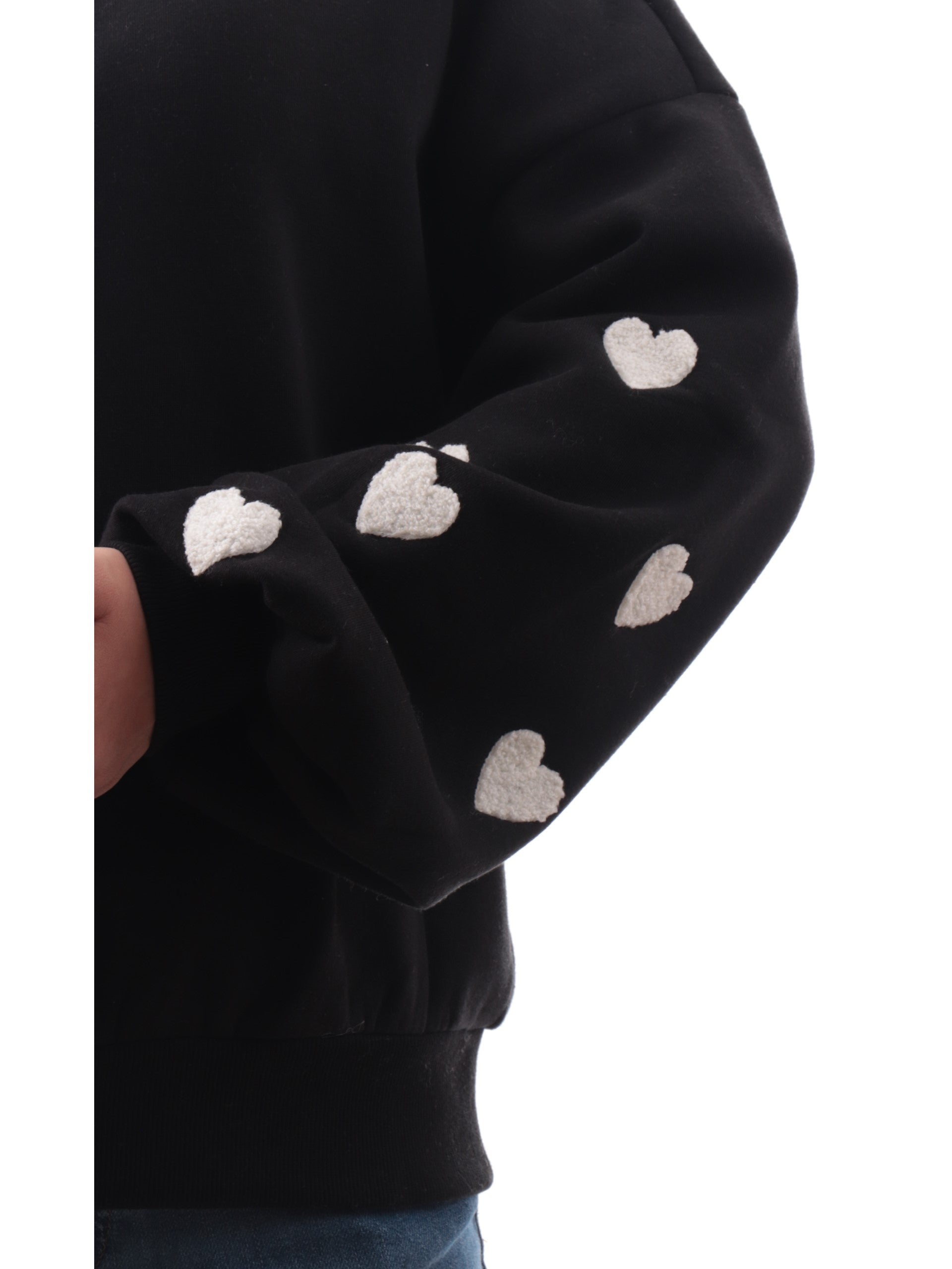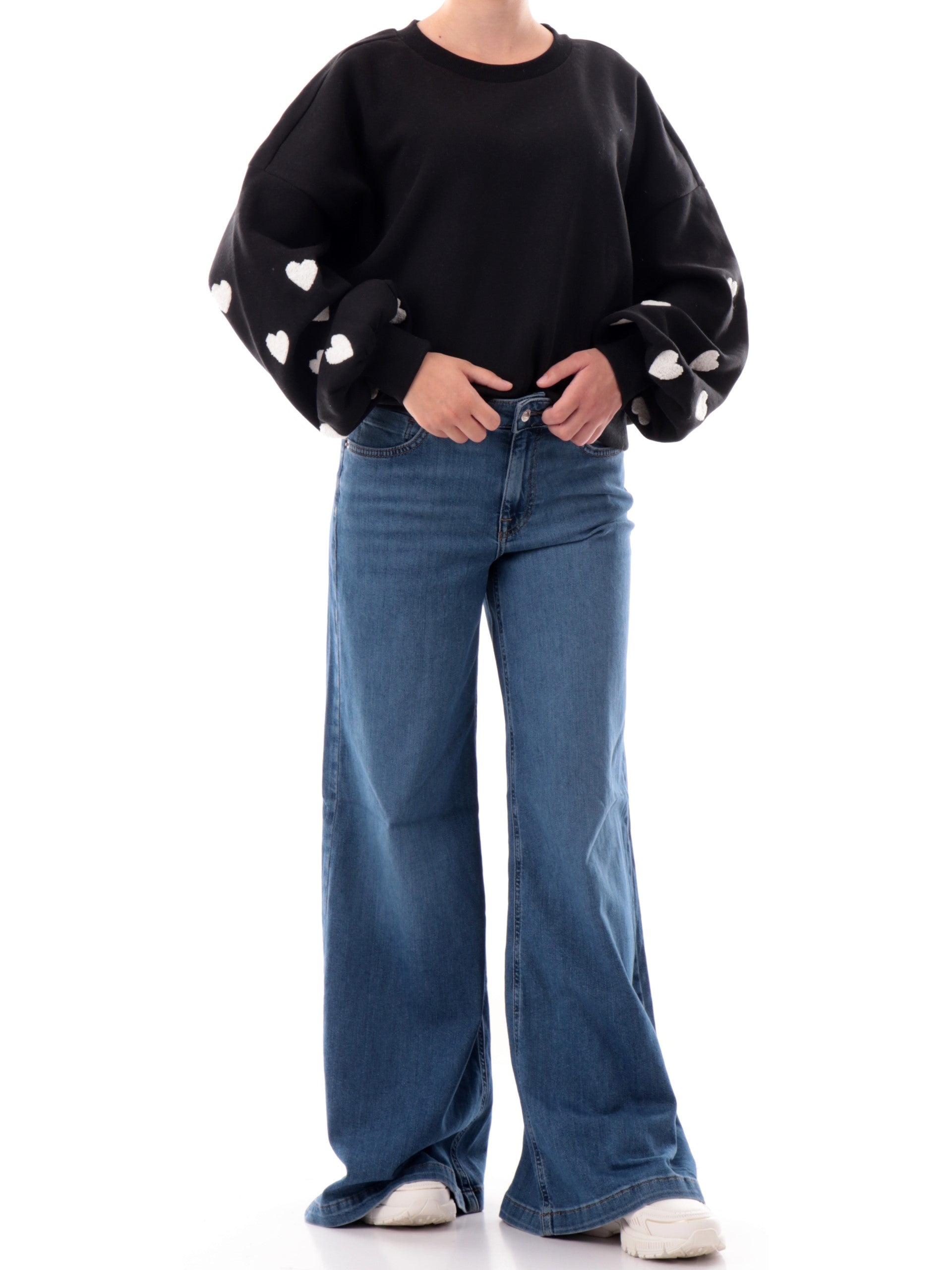 Felpa Only nera da donna girocollo patch cuori 15352921, realizzata in cotone felpato. Questa felpa donna Only nera girocollo ha le maniche lunghe, i cuori ricamati a contrasto colore, polsini e fondo elasticizzati.
