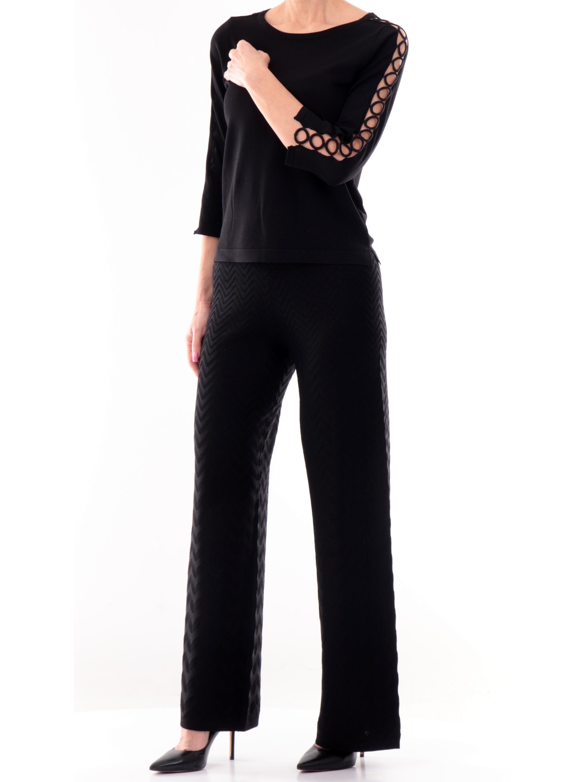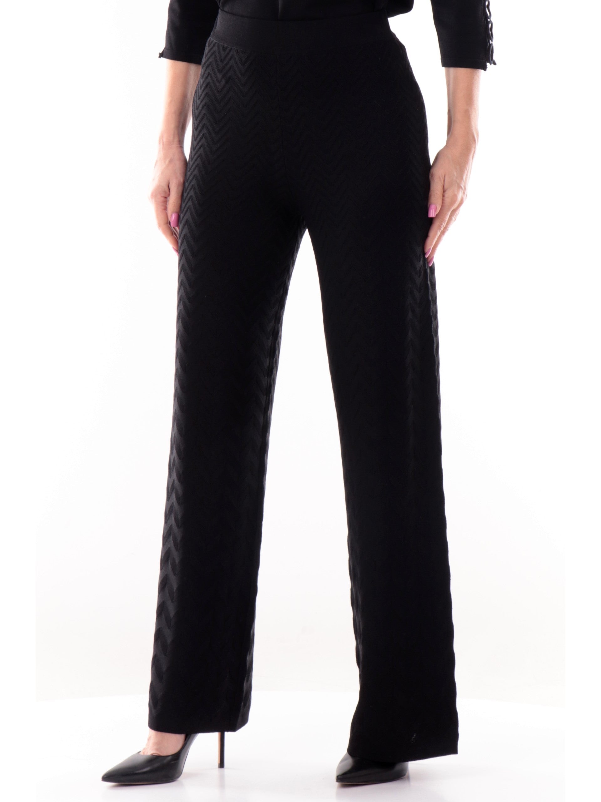 Pantaloni neri da donna Anis a palazzo. Questi pantaloni da donna, realizzati in morbida viscosa, perfetti per un look comodo, hanno la banda elastica sul punto vita, trama ondulata e la gamba larga.Questi pantaloni sono perfetti per la stagione primavera-estate