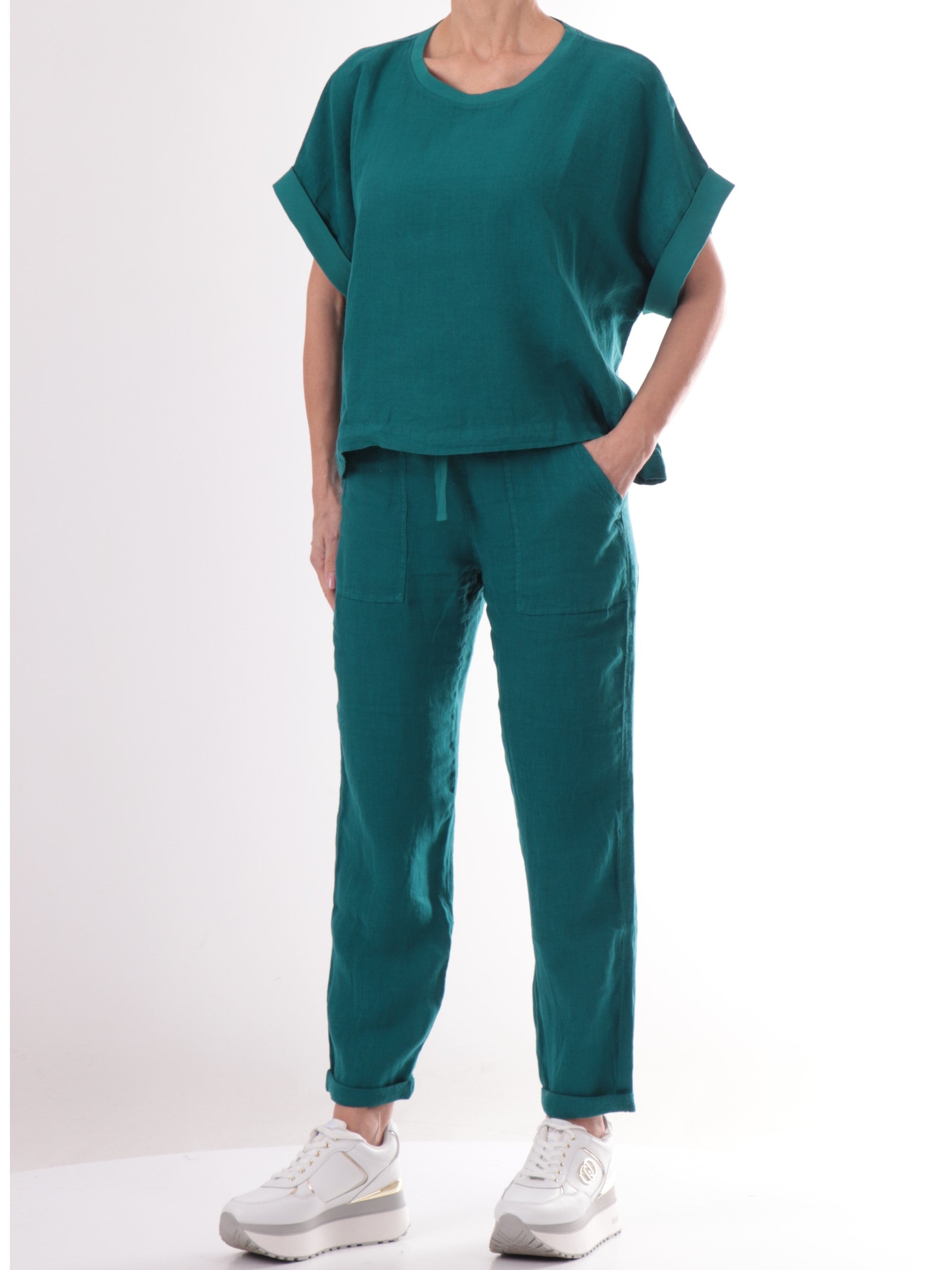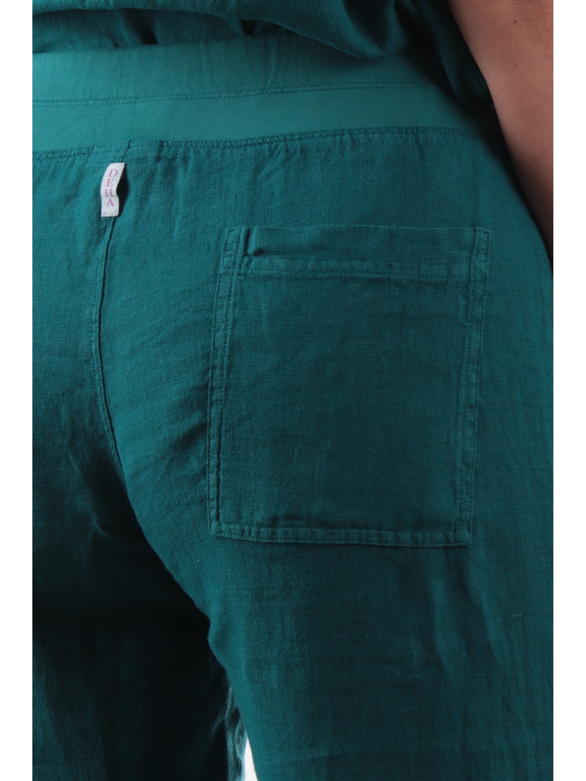 Pantaloni lino Deha verdi da donna. Questi pantaloni verdi da donna, realizzati in 100% lino, perfetti per i primi caldi, hanno la banda elsatica sul punto vita regolabile con lacci, due tasche laterali aperte, due tasche a filo sul retro e la gamba dritta con risvoltino