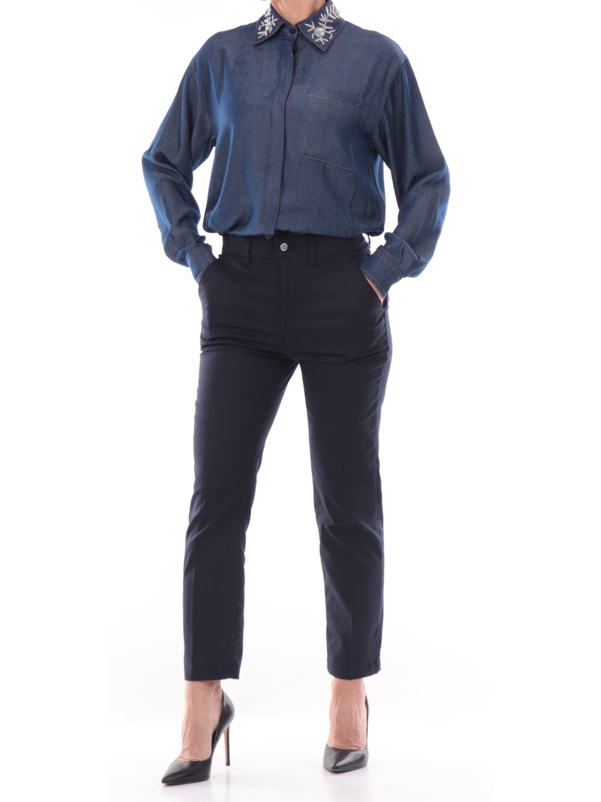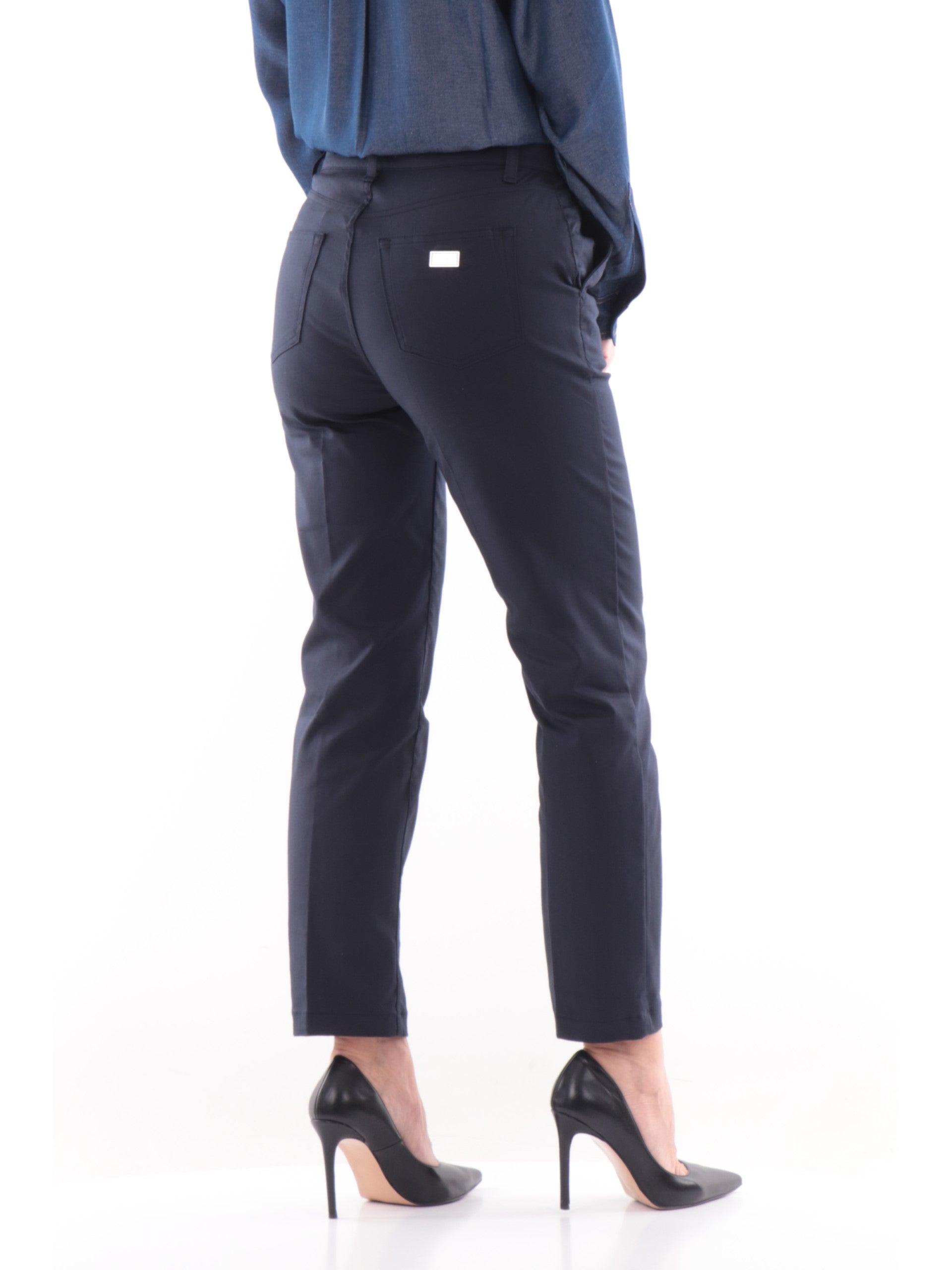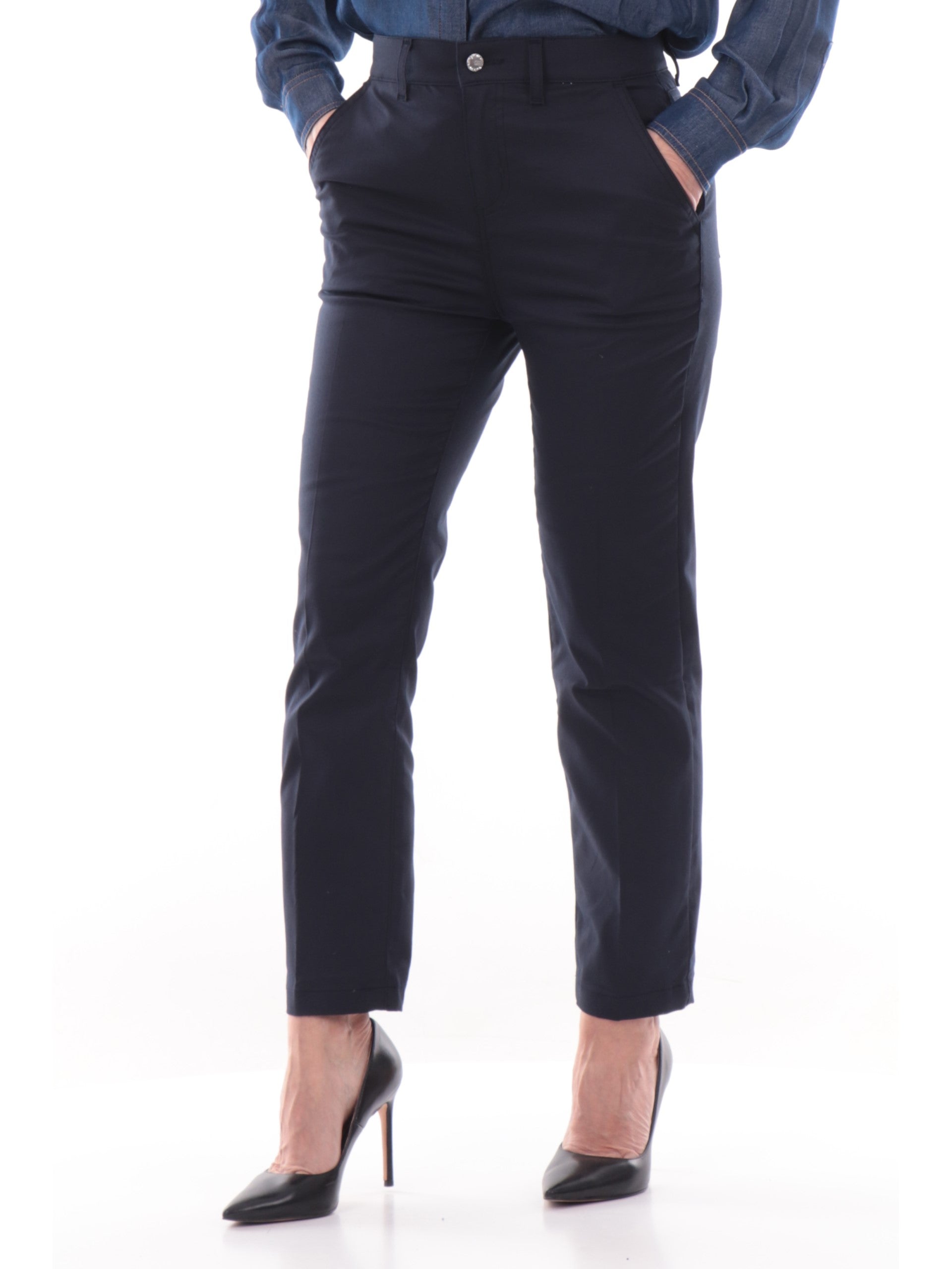 Pantaloni Liu Jo blu chino da donna Capri. questi pantaloni da donna, realizzati in morbido cotone, perfetti per la stagione primavera-estate e perfetti per un look sia casual e sia elegante, hanno la chiusura con botton epiù zip, passanti per la cintura, due tasceh laterali aperte, due tasche sul retro a filo e la gamba dritta