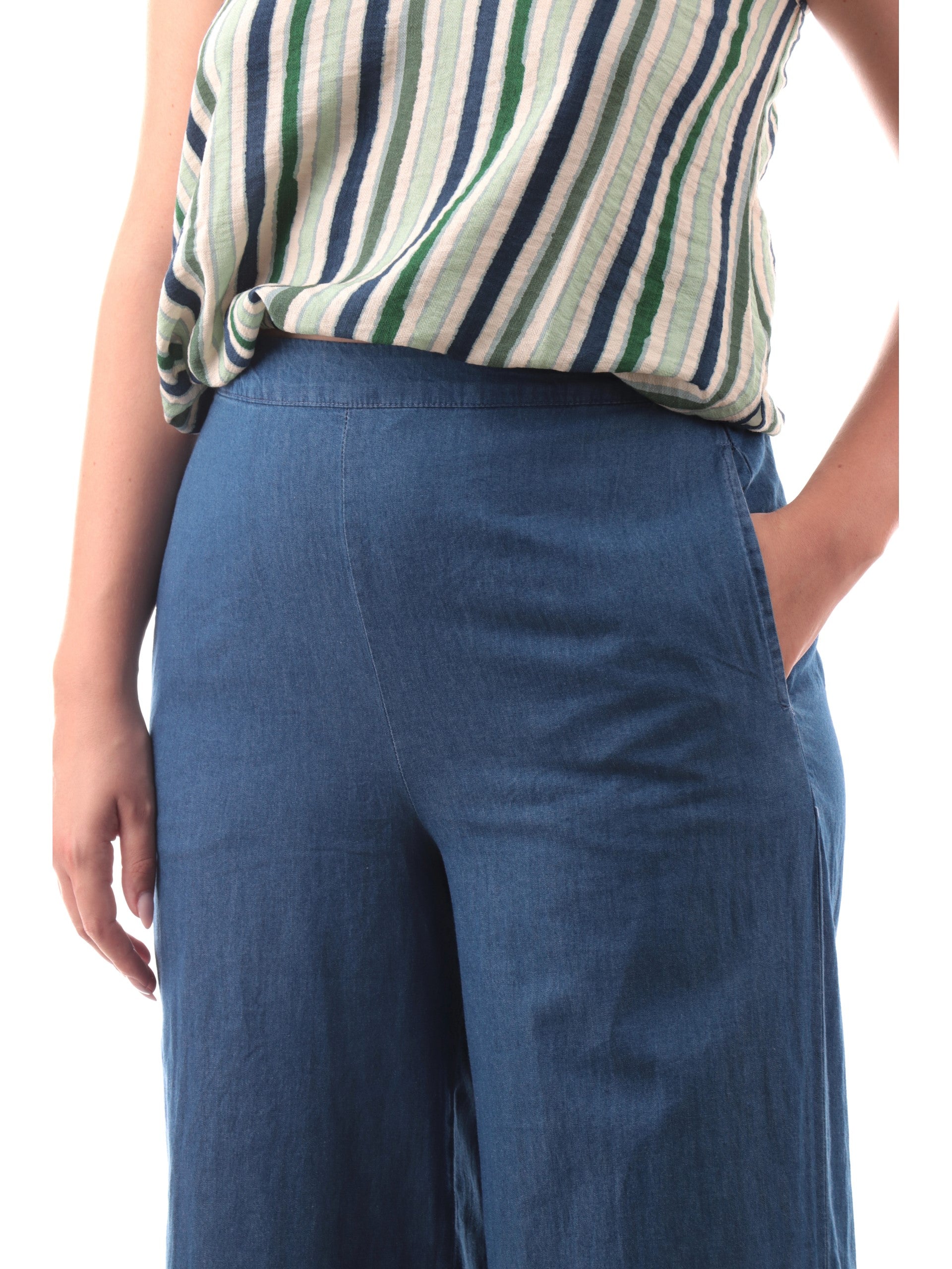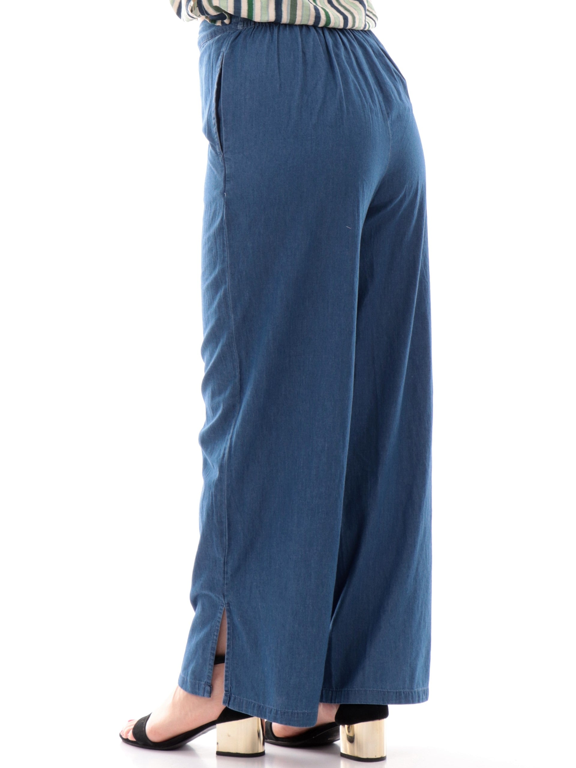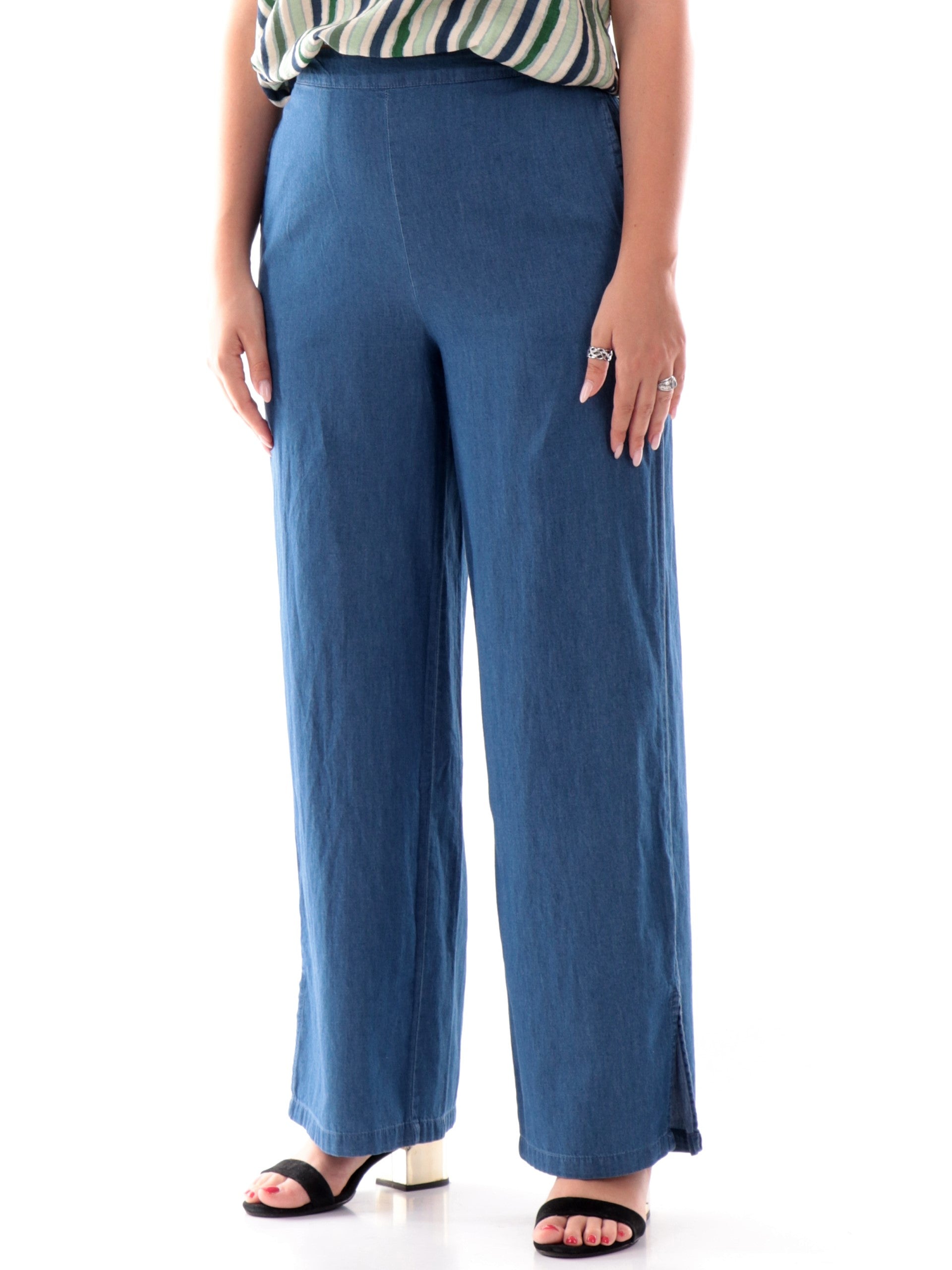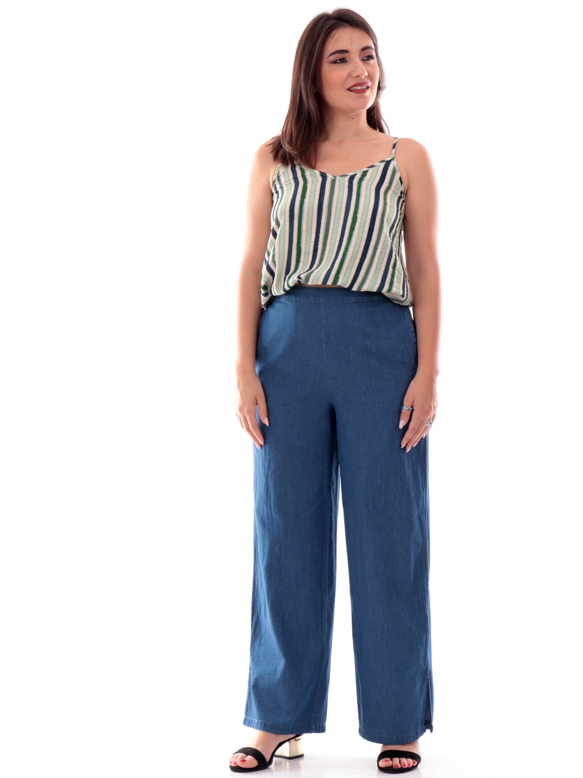 Pantaloni palazzo Only jeans da donna Chiara 15343011, realizzati in 100% puro cotone. Questi pantaloni donna Only hanno la banda elastica sul punto vita, due tasche laterali aperte, la vestibilità morbida e il fondo con spacchi laterali.