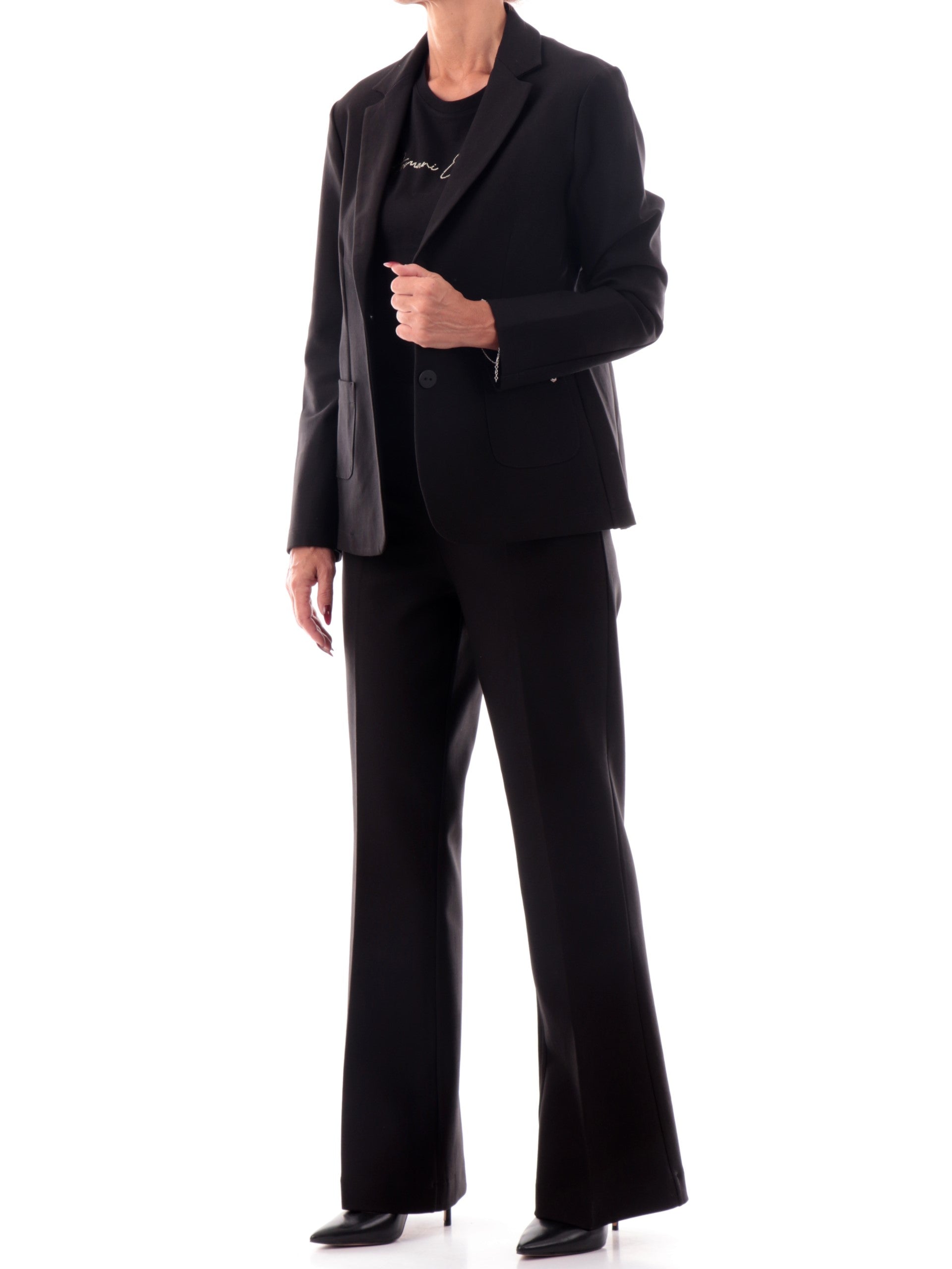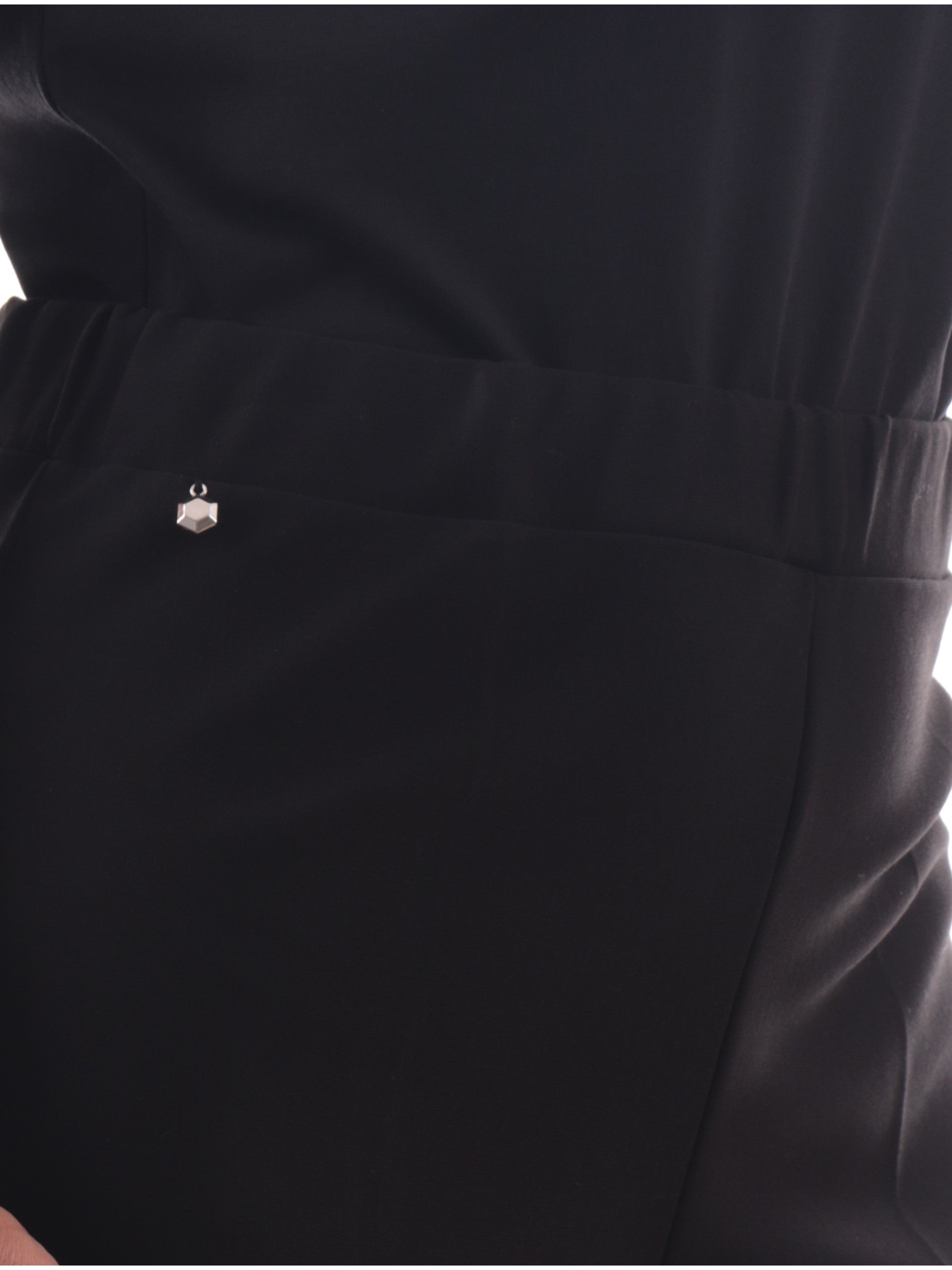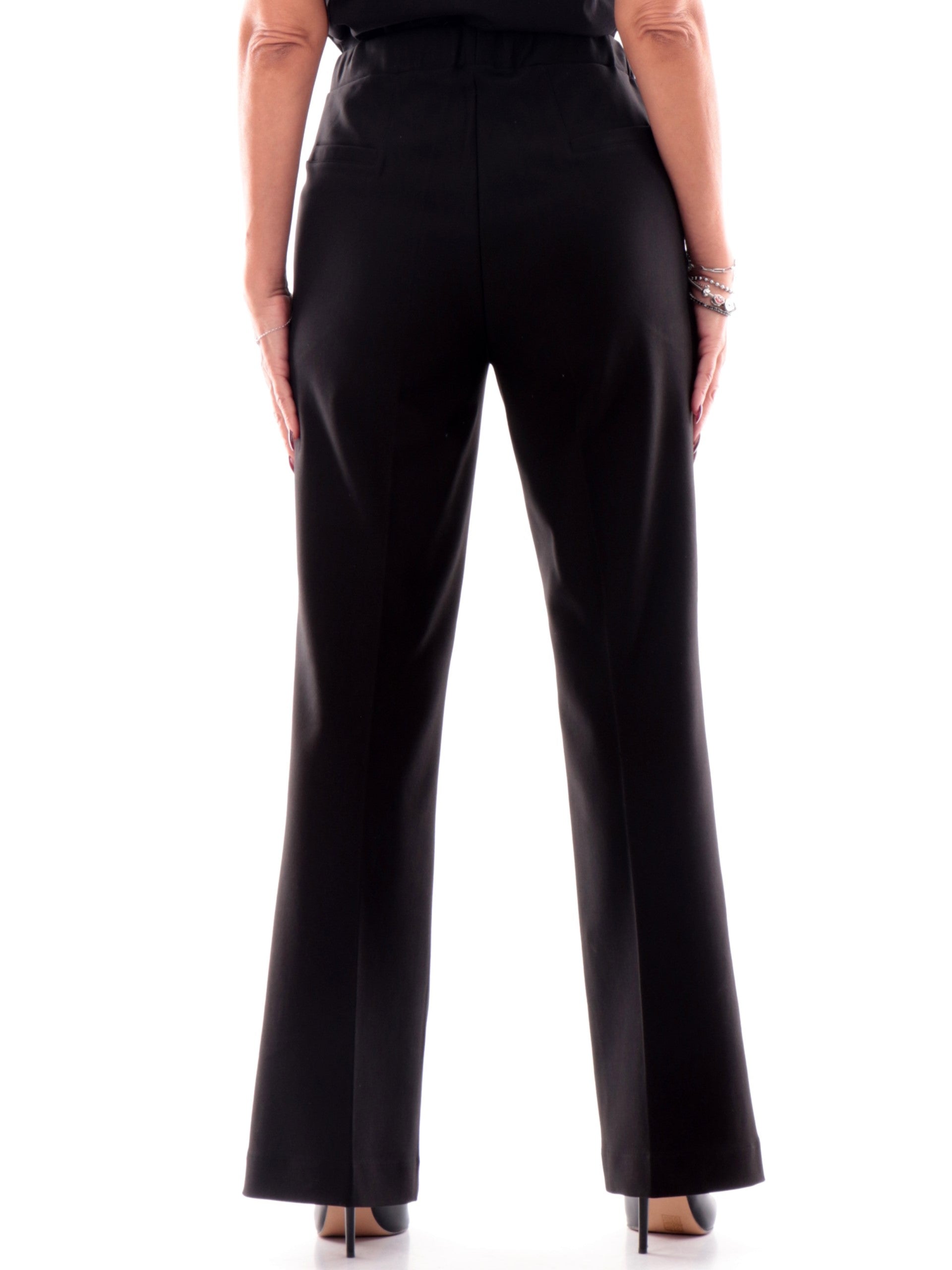 Pantaloni Ragno Flare neri da donna elasticizzati DL20PC, realizzati in viscosa. Questi pantaloni donna Ragno neri hanno la banda elastica sul punto vita, due tasche posteriori a filo e il ciondolo del brand applicato sul lato destro.