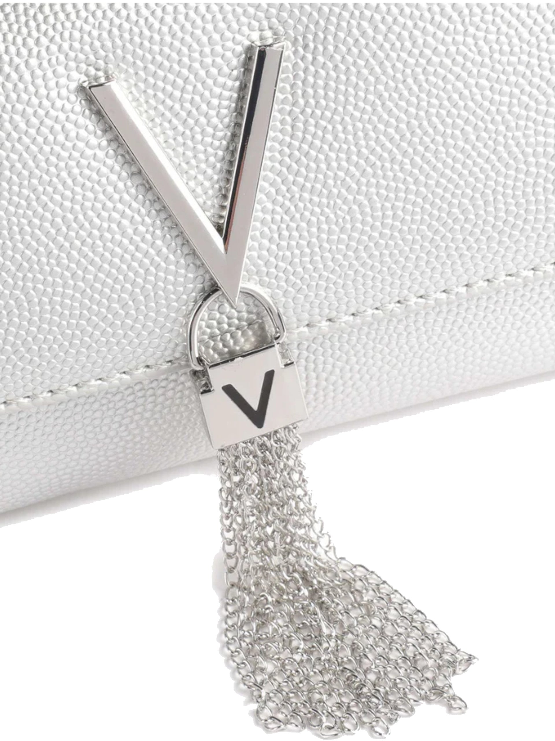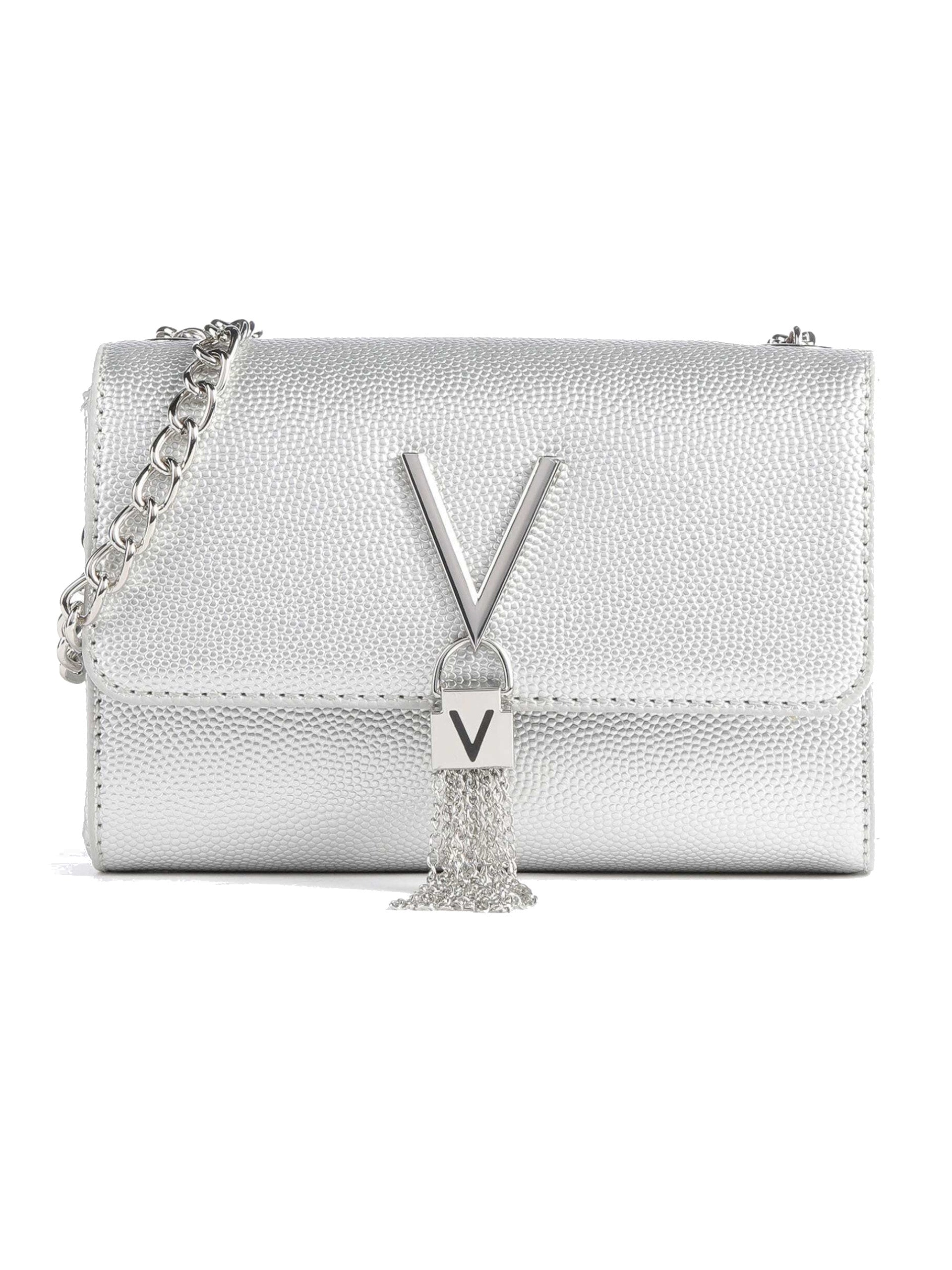 Borsa Valentino piccola argentata a tracolla con catenella Divina. Questa borsa valentino ha la chiusura con bottone automatico, con catenella e il logo sul davanti che aggiungono un tocco di classe,all'interno di questa borsa a tracolla troviamo un unico scomparto per riporre qualsiasi cosa e due tasche, una tasca aperta e una con zip