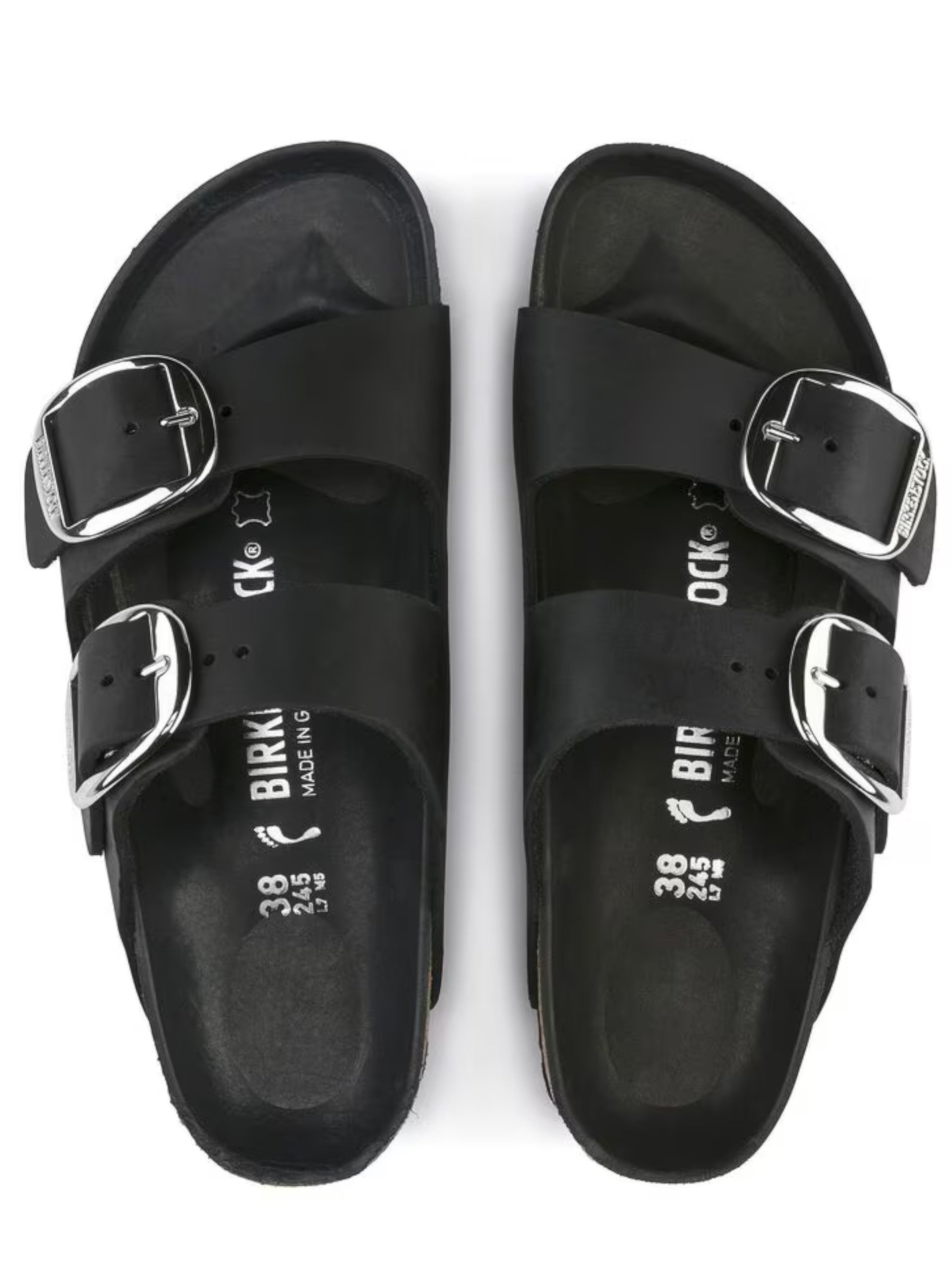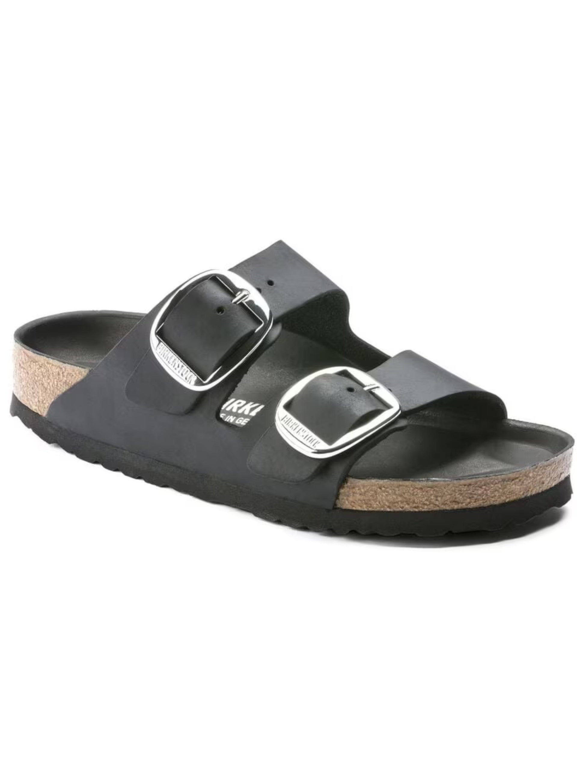 Sandali Birkenstock in pelle neri da donna Arizona Big Buckle 1011075. Questi sandali Birkenstock neri hanno la tomaia in pelle con doppio cinturino regolabile con fibbia metallica, la soletta ergonomica in sughero per accogliere il piede al meglio e la suola in EVA morbidissima e leggerissima per la masima sensazione di comfort.