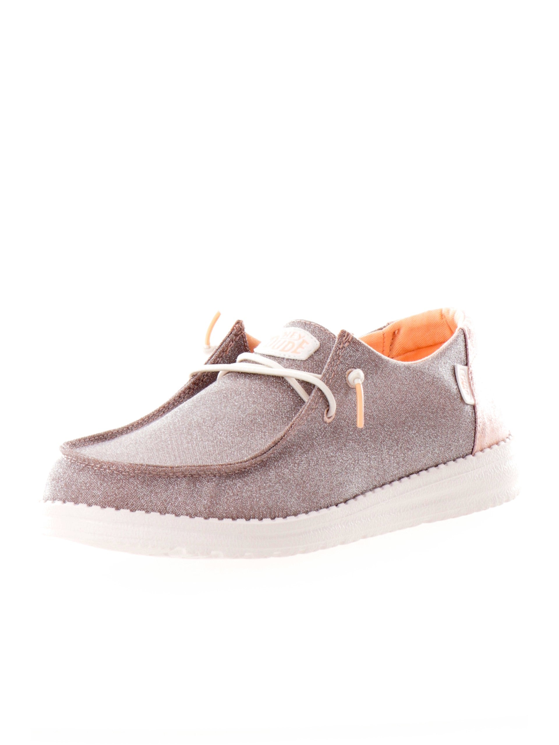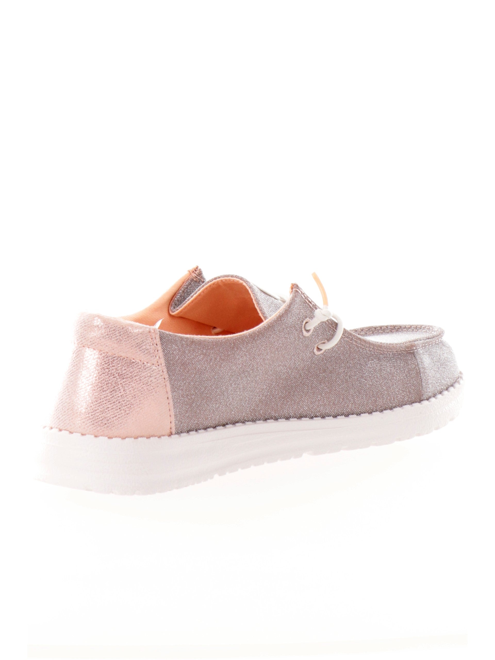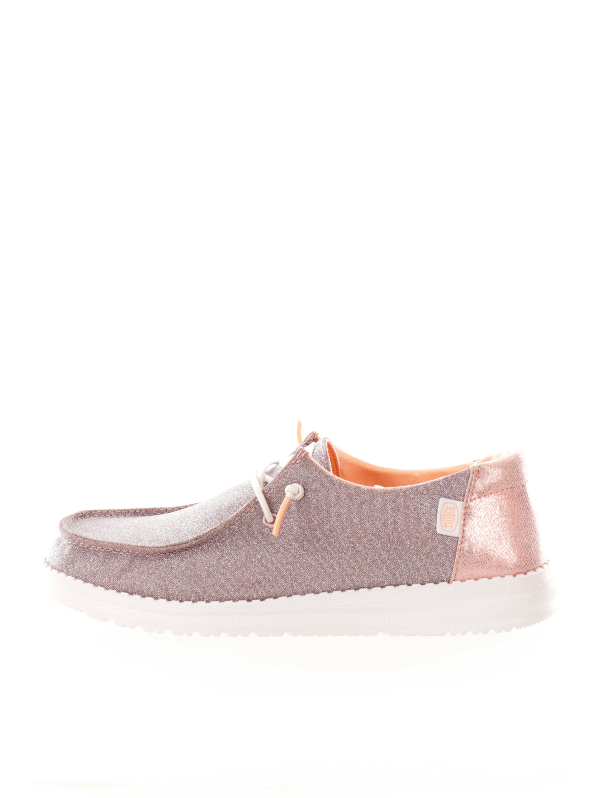 Scarpe Hey Dude Wendy Metallic Sparkle oro rosa da donna 41082 7D9. Questi mocassini Hey Dude donna hanno la tomaia realizzata in tessuto completamente glitterato, la calzata easy-on, lacci e insertorosa sul lato posteriore.