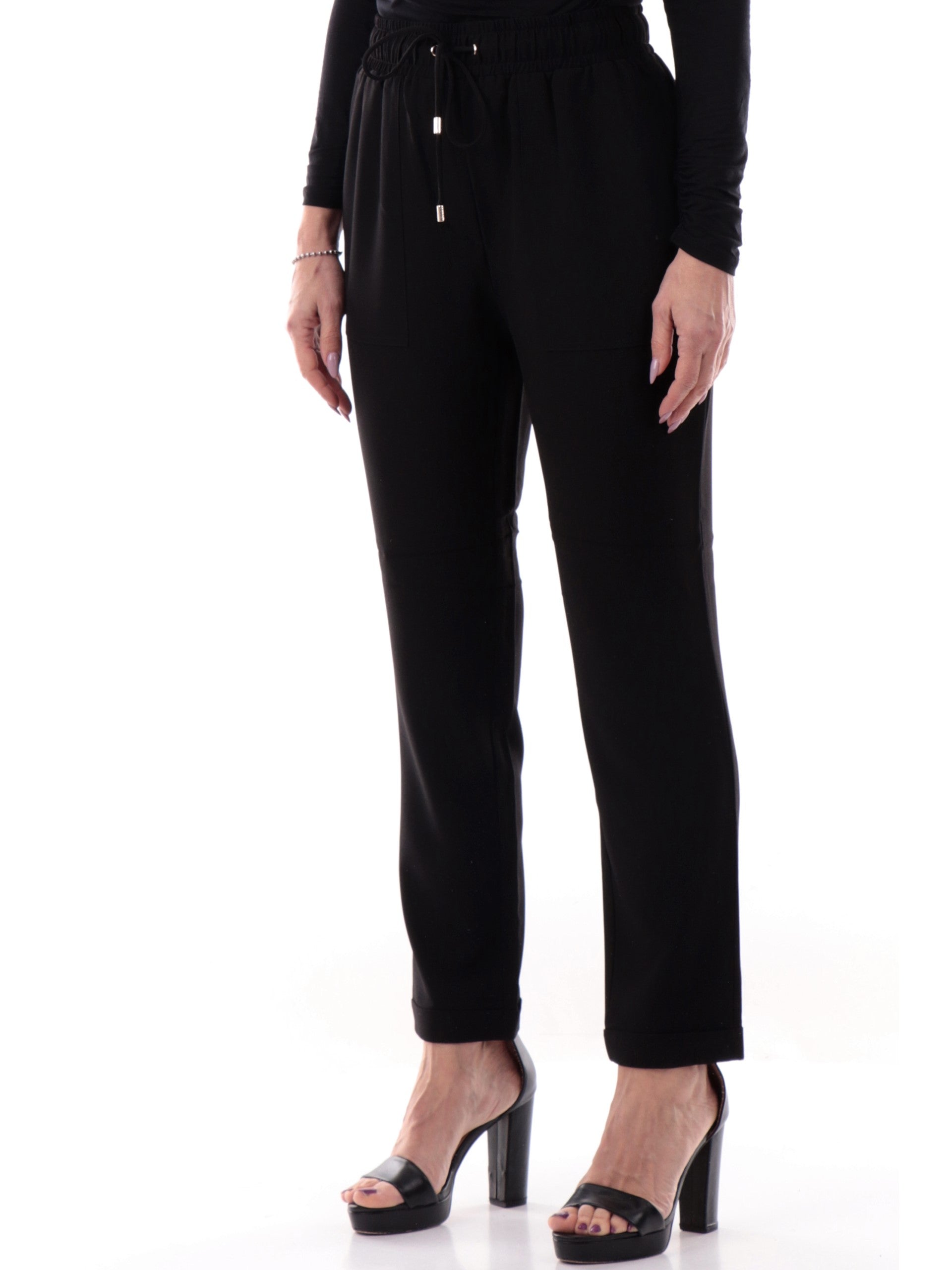 Pantaloni Liu Jo neri da donna fondo con risvolto TA5140TS423. Questi pantaloni donna Liu Jo neri hanno la banda elastica sul punto vita regolabile con laccetti, due tasche laterali aperte e il fondocon risvolto.