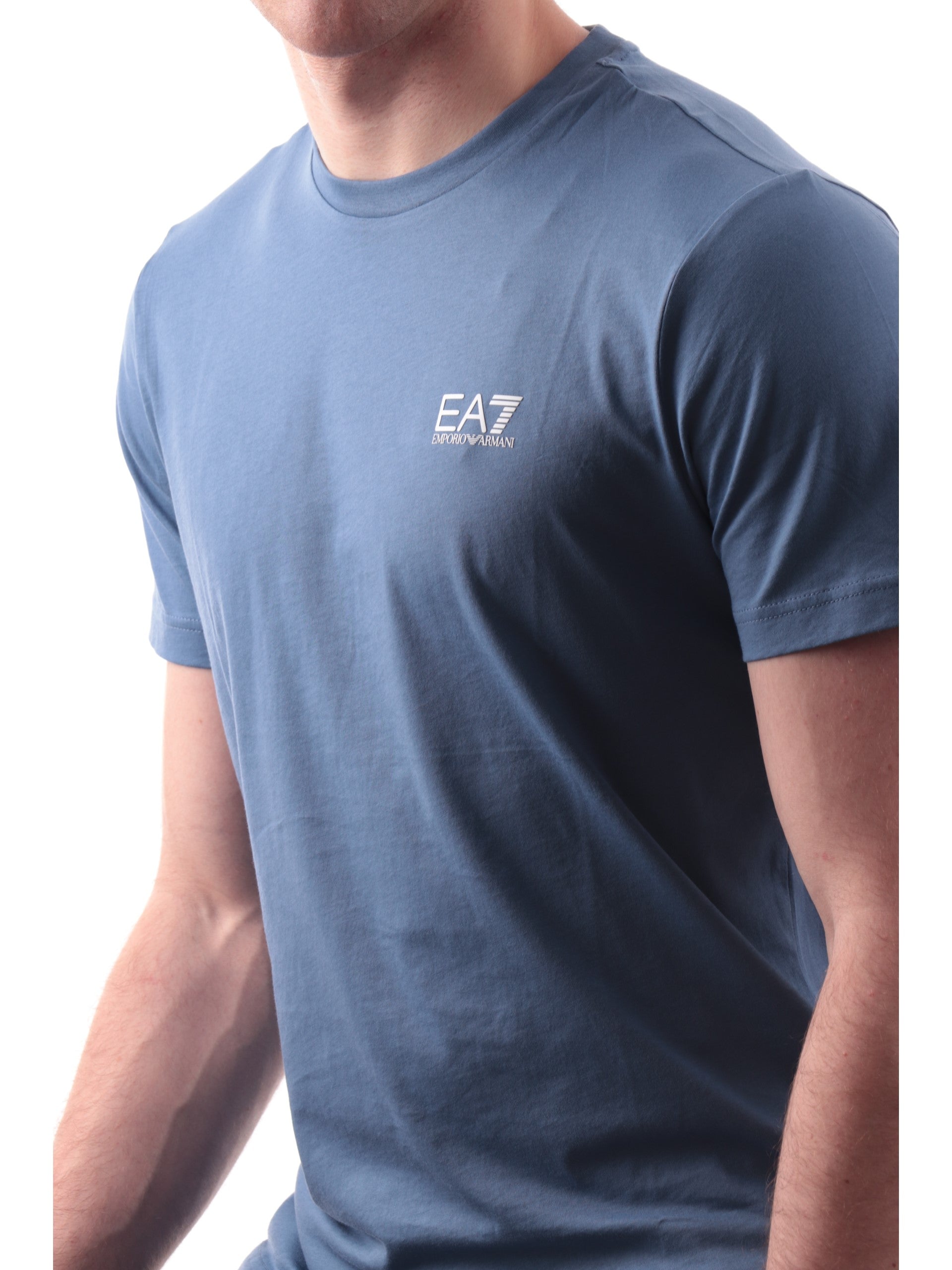 T-shirt Emporio Armani celeste da uomo EA7. Questa T-shirt da uomo, realizzata 100% in puro cotone, morbido e leggero al tatto, perfetta per la stagione estiva, è caratterizzata dal girocollo, maniche corte e il logo del brand applicato a lato cuore