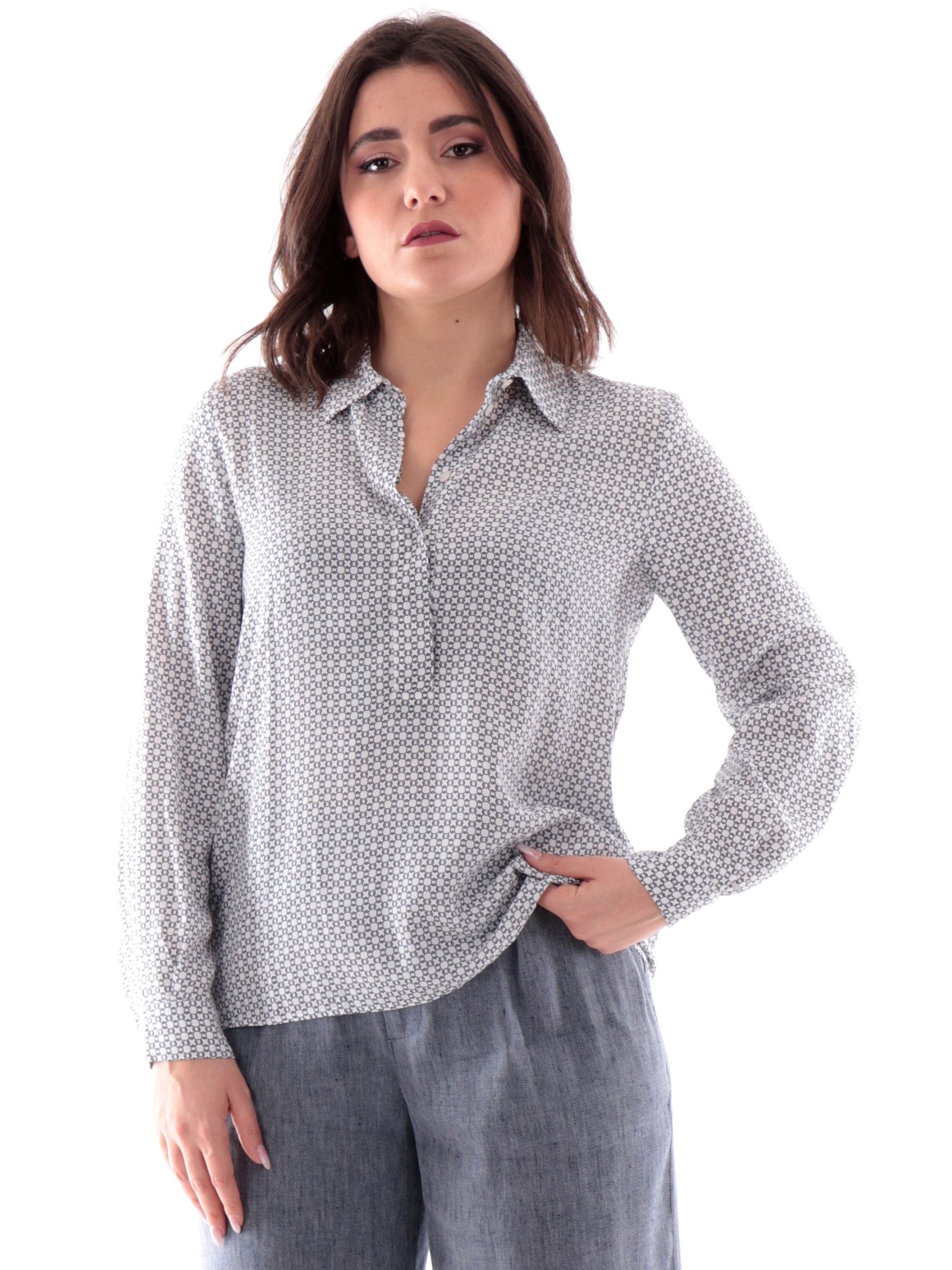 Camicia Emme Marella blu da donna fantasia foulard OSSIDO, realizzata in 100% viscosa. Questa camicia Marella blu ha il colletto alla francese, la chiusura con bottoni nascosta da una patta, le maniche lunghe e la fantasia foulard all over.