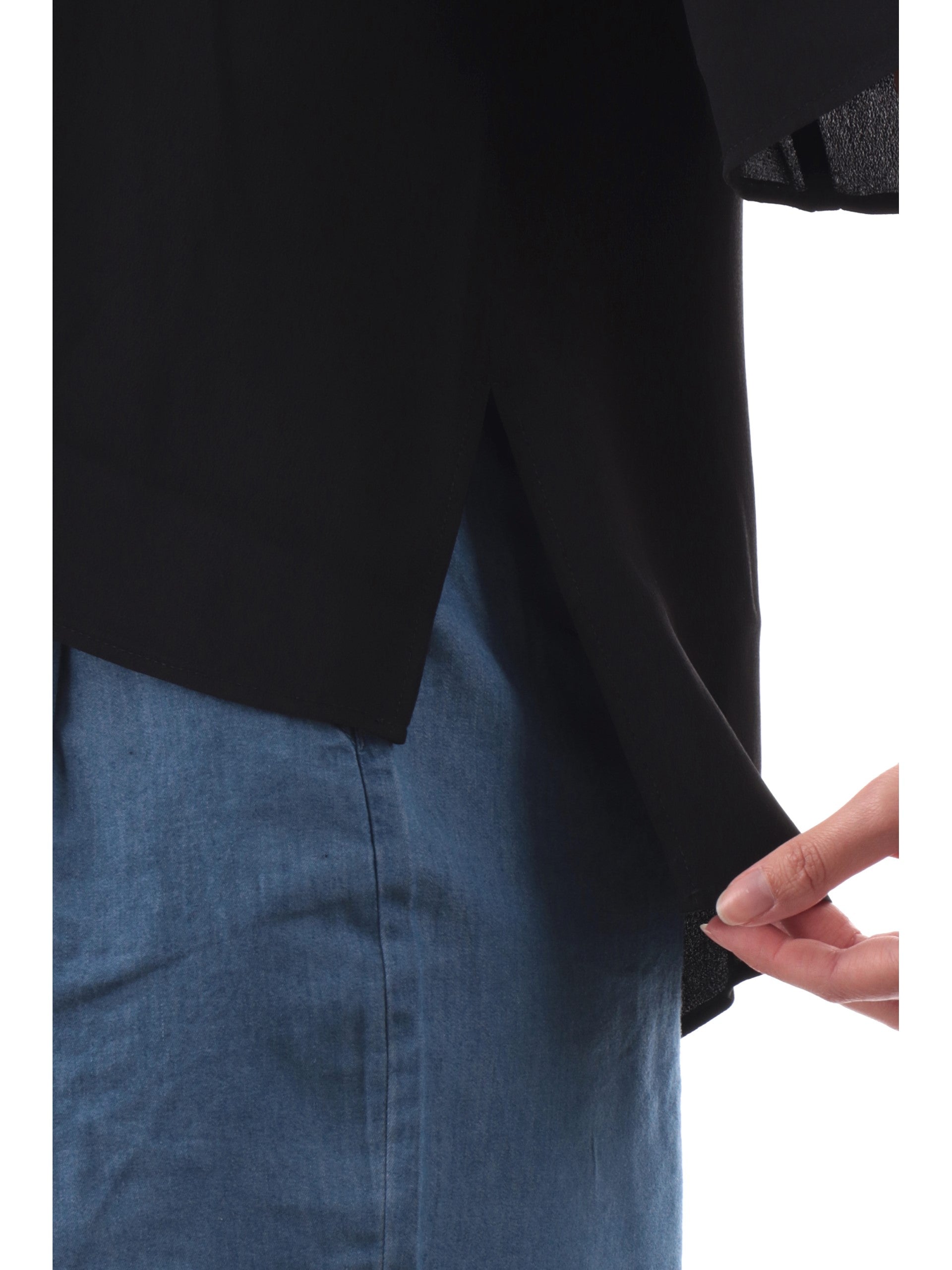 Camicia Emme Marella seta Nera vestibilità morbida da donna ATZECO. Questa blusa donna Marella nera girocollo ha le maniche a tre quarti, tessuto misto seta e il fondo con spacchi laterali.