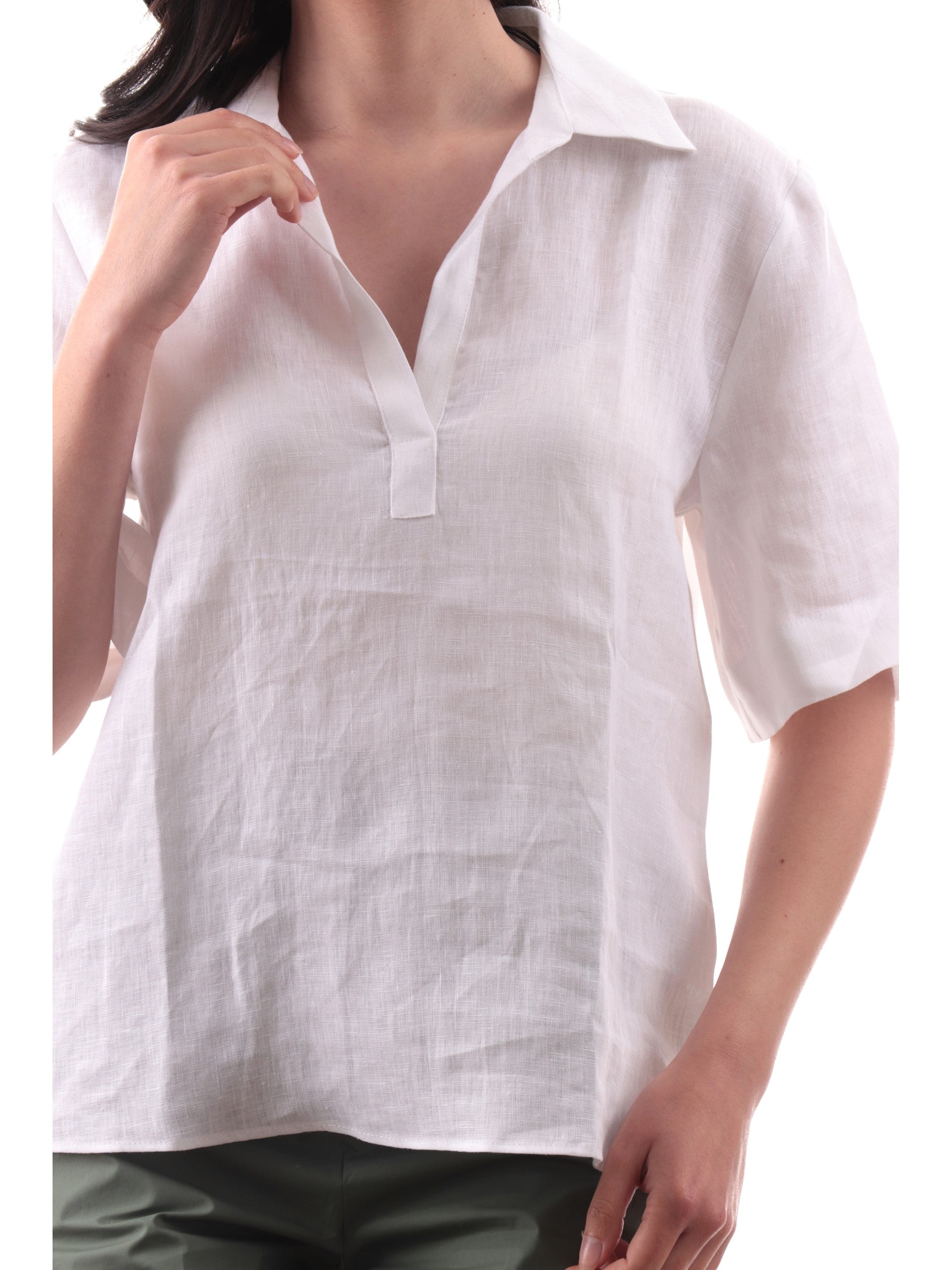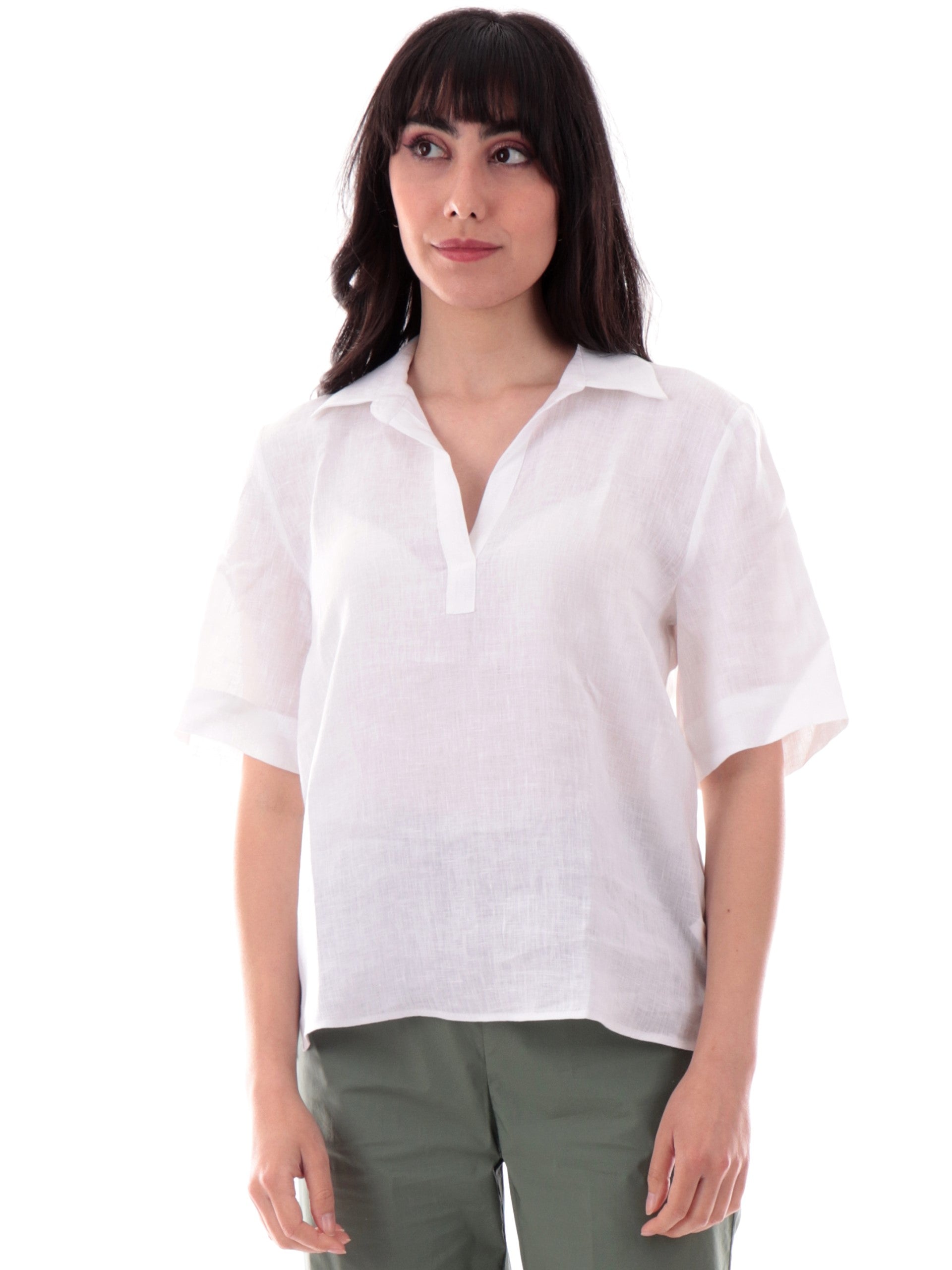 Camicia Emme Marella Bianca da donna con colletto realizzata in puro lino. Questa Camicia marella bianca è caratterizzata da scollo a V e linee essenziali che la rendono perfetta per ogni situazione.