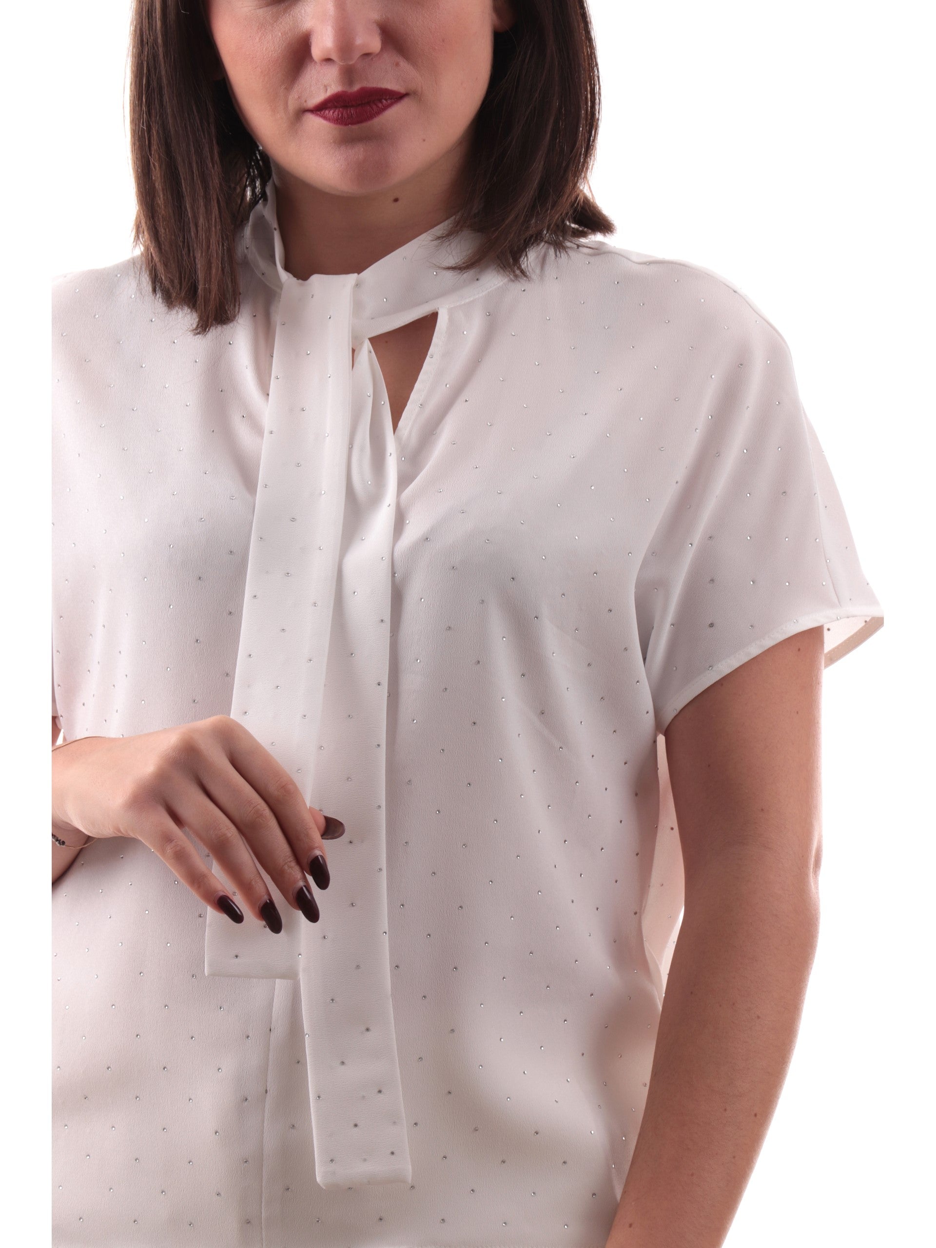 Camicia smanicata Emme Marella scollo a V bianca da donna con strass GALEA. Questa blusa Marella bianca ha lo scollo a V, un nodo sul davanti e strass all over.