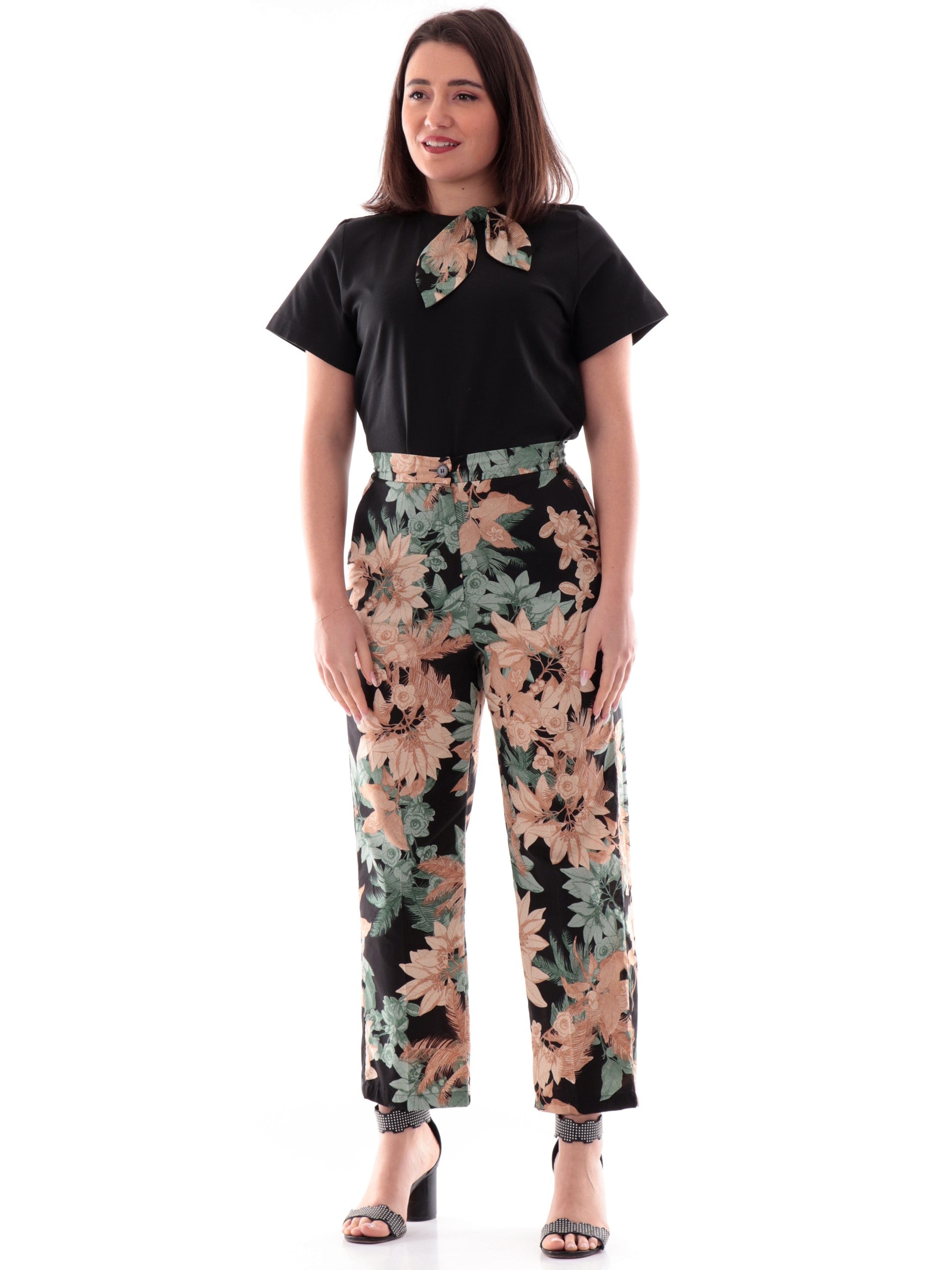 T-shirt Emme Marella nera da donna con nodo fantasia floreale ARONA