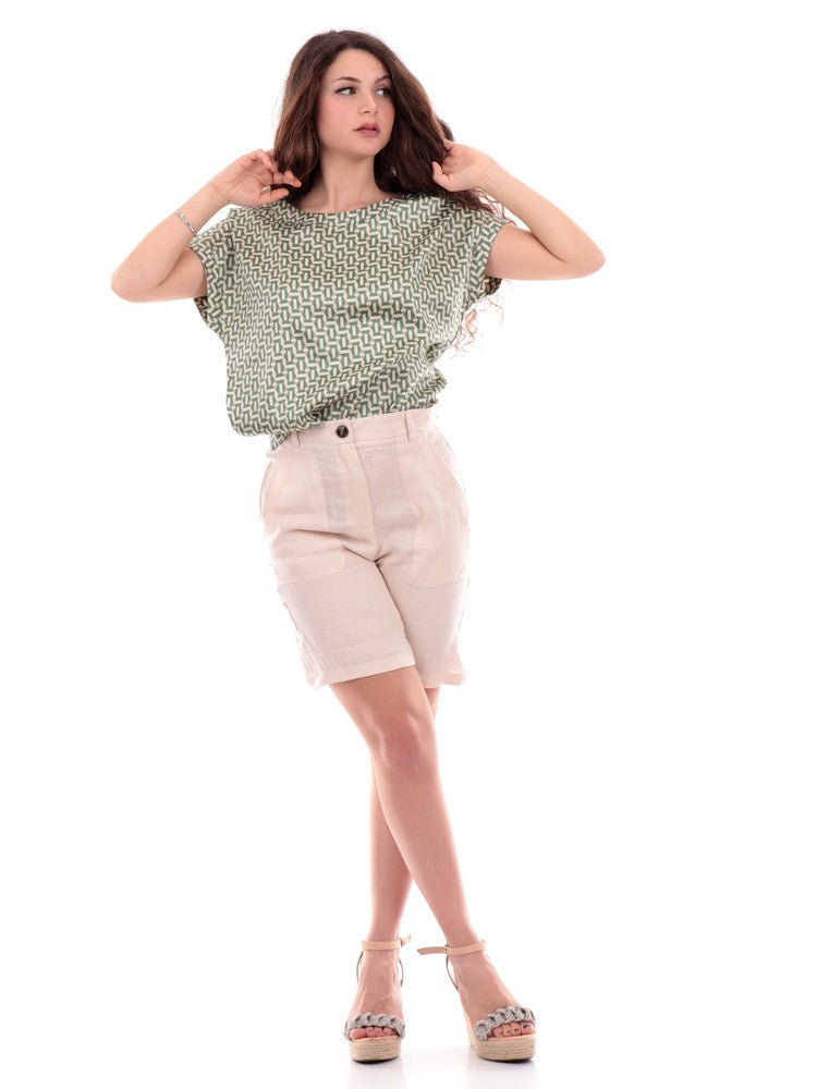 Pantaloncini Emme MARELLA beige da donna 24151410322, realizzati in 100% lino. Questi pantaloncini Emme MARELLA hanno due tasche aperte laterali, i passanti per cintura e chiusura a zip e bottone singolo.