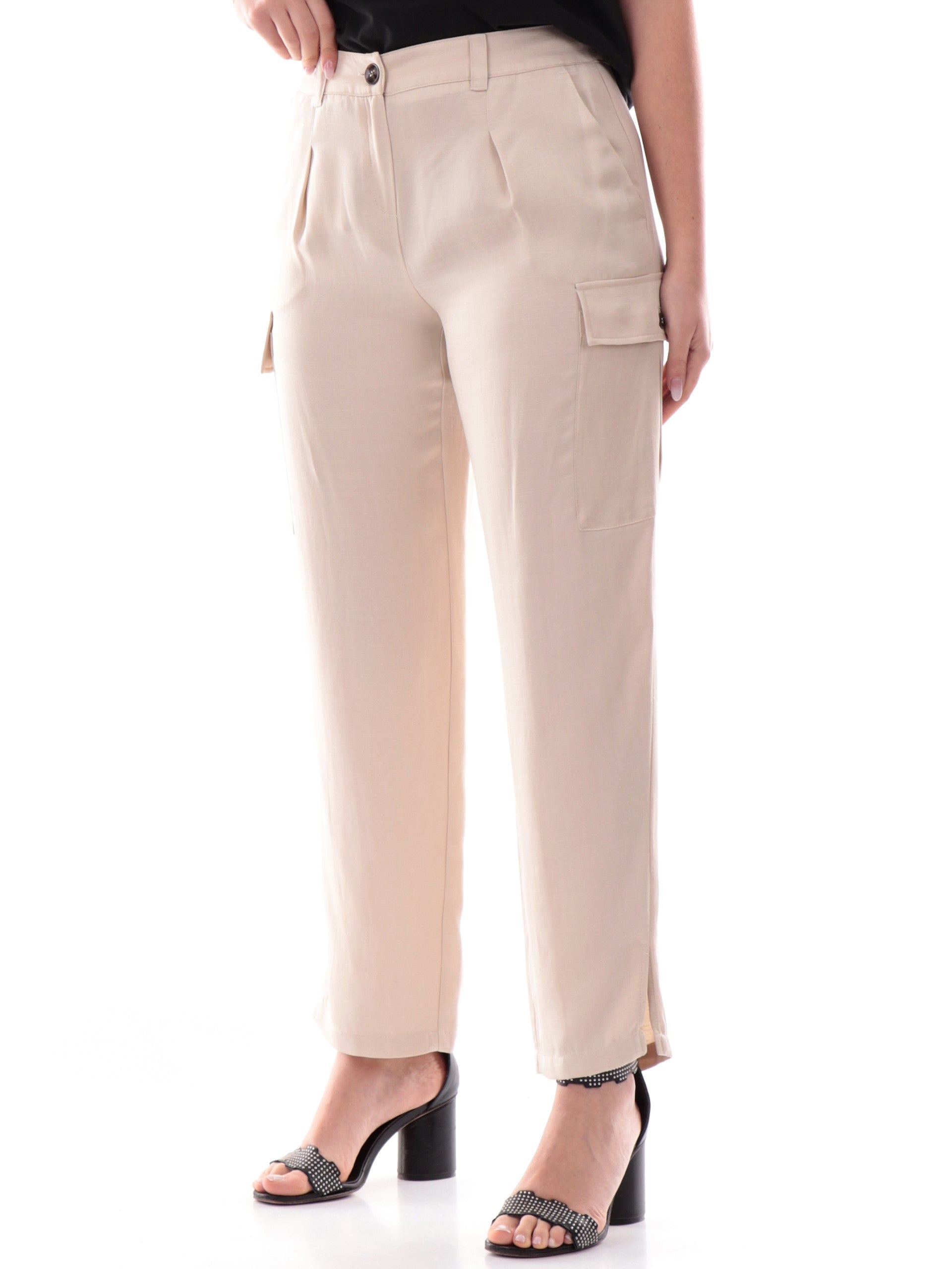 Pantaloni cargo Emme Marella beige da donna in lino AIA. Questi cargo Marella beige hanno la chiusura con bottone più zip, due tasche laterali aperte con taglio obliquo, due tasconi altezza ginocchioe il fondo con spacchi.