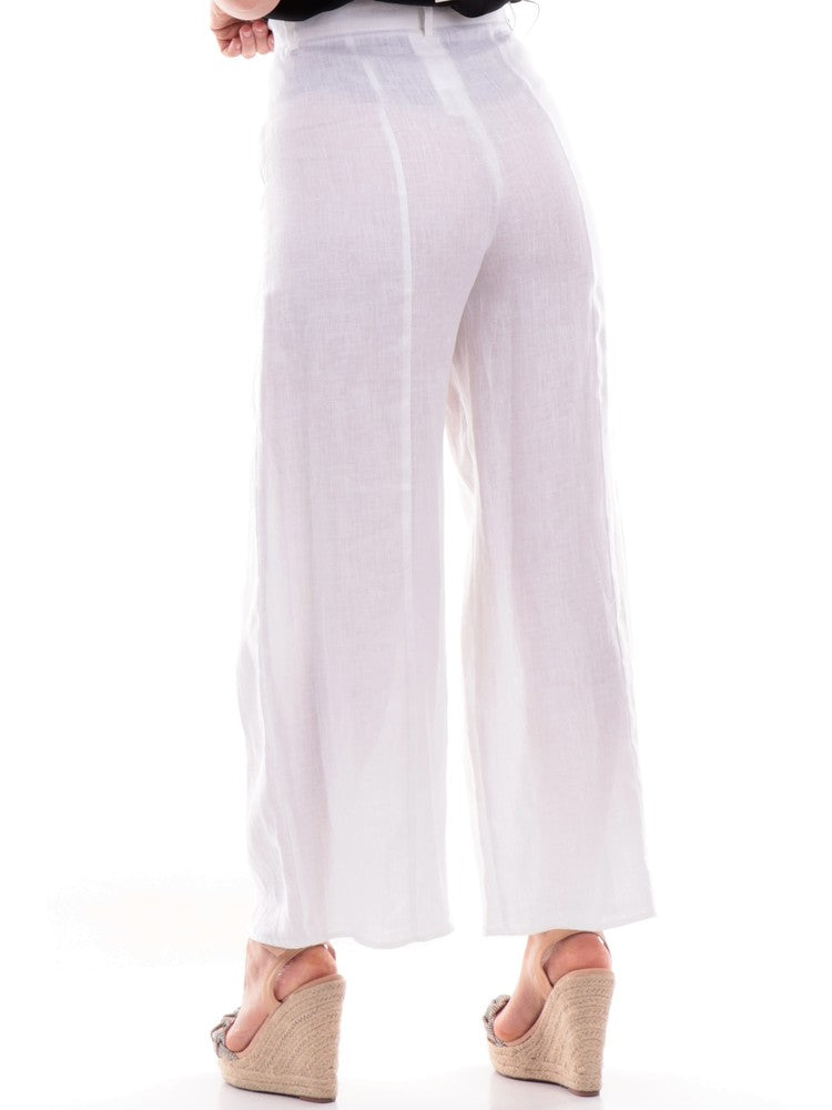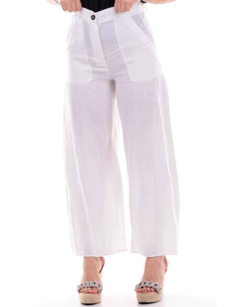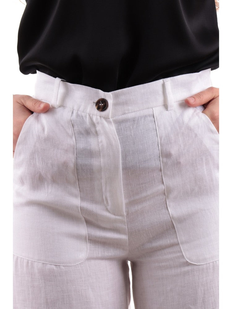 Pantaloni Emme MARELLA bianchi da donna a palazzo 24151311322, realizzati al 100% lino. Questi pantaloni Emmme MARELLA hanno due tasche aperte laterali, i passanti per cintura, la chiusura a zip e bottone singolo.