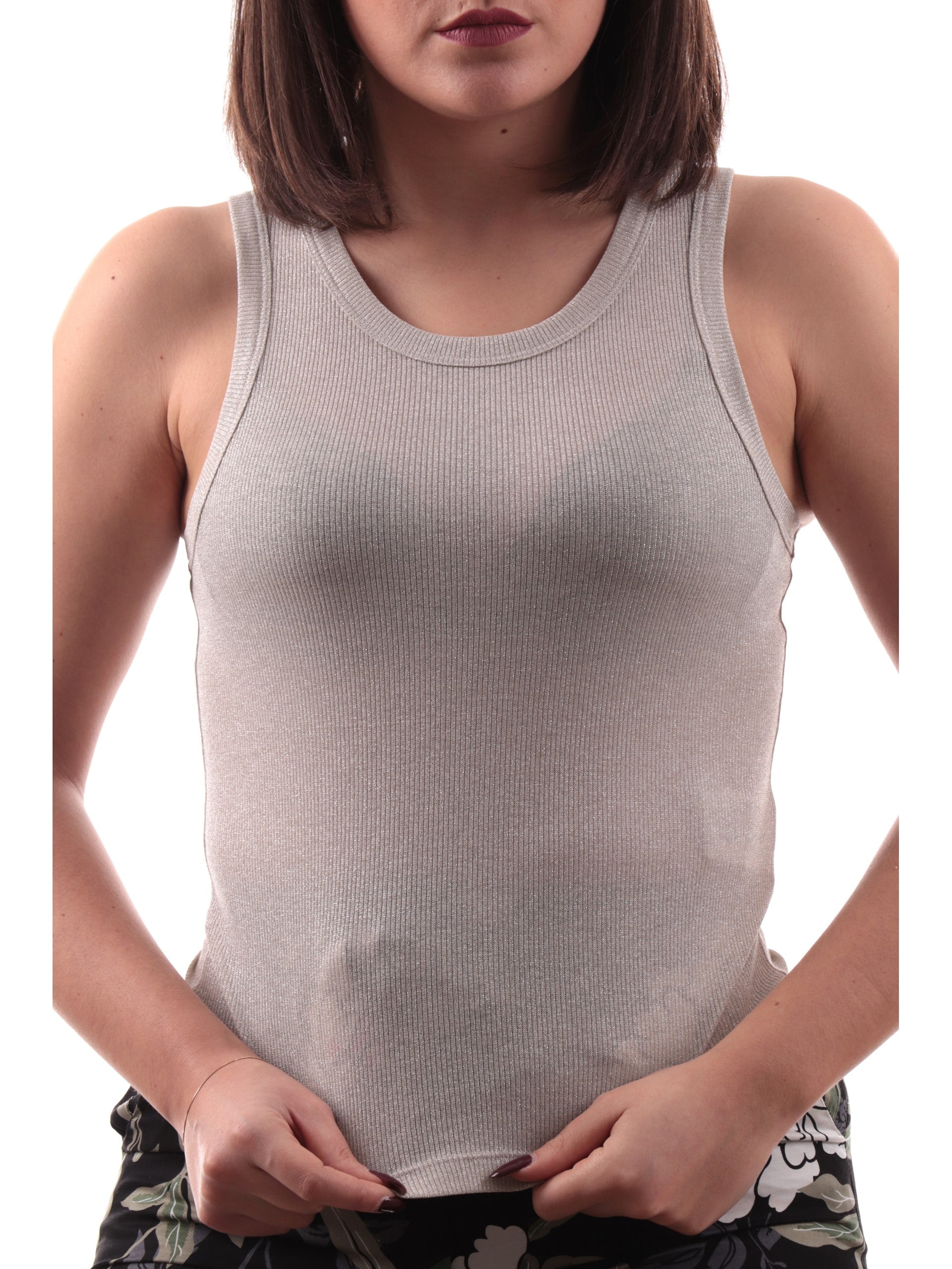 Canotta lurex oro a costine beige con bretelle e linee femminili. Sottogiacca lurex beige da donna Emme Marella perfetto perfetto per dare il giusto tocco di luce in ogni occasone.