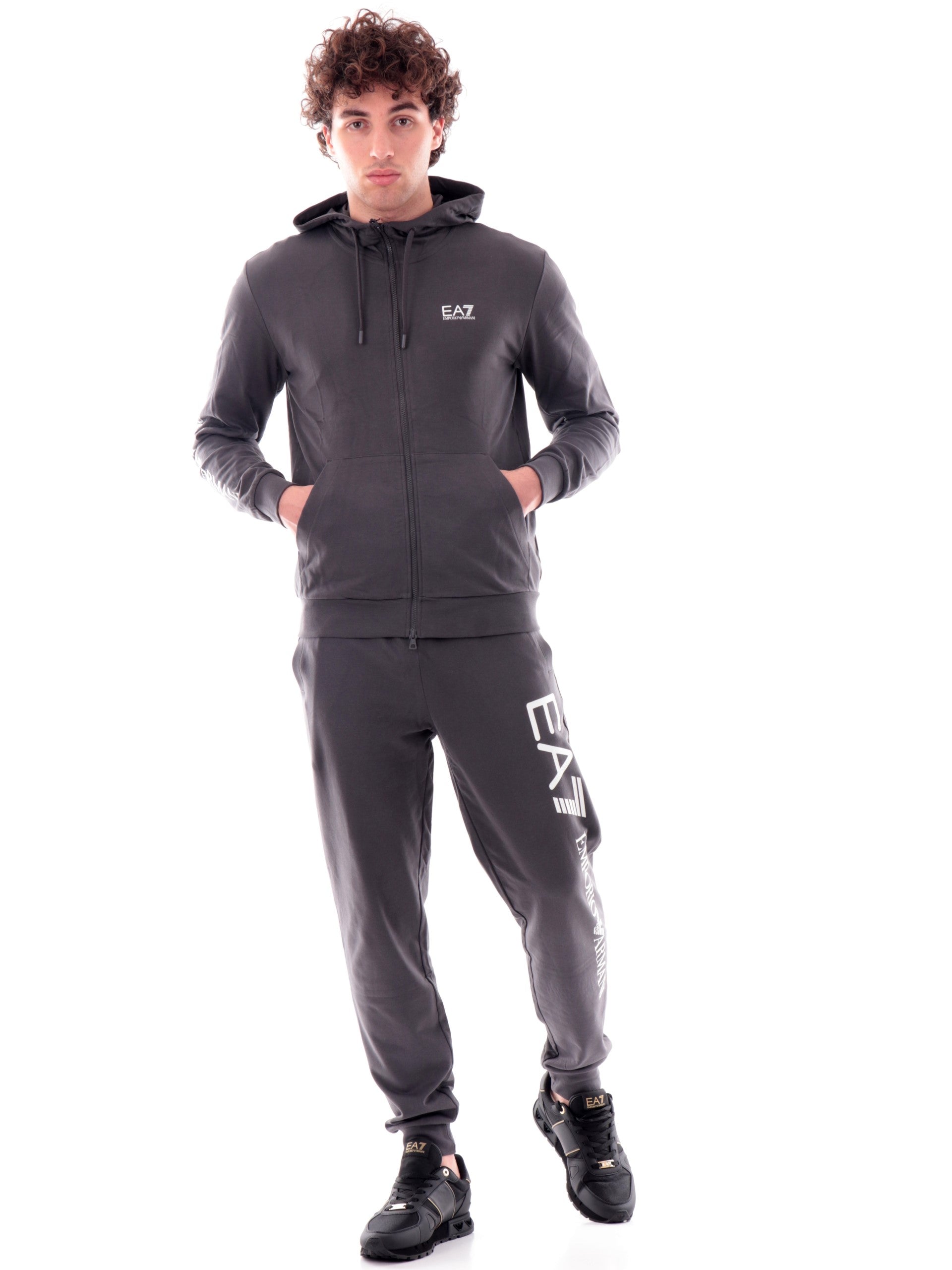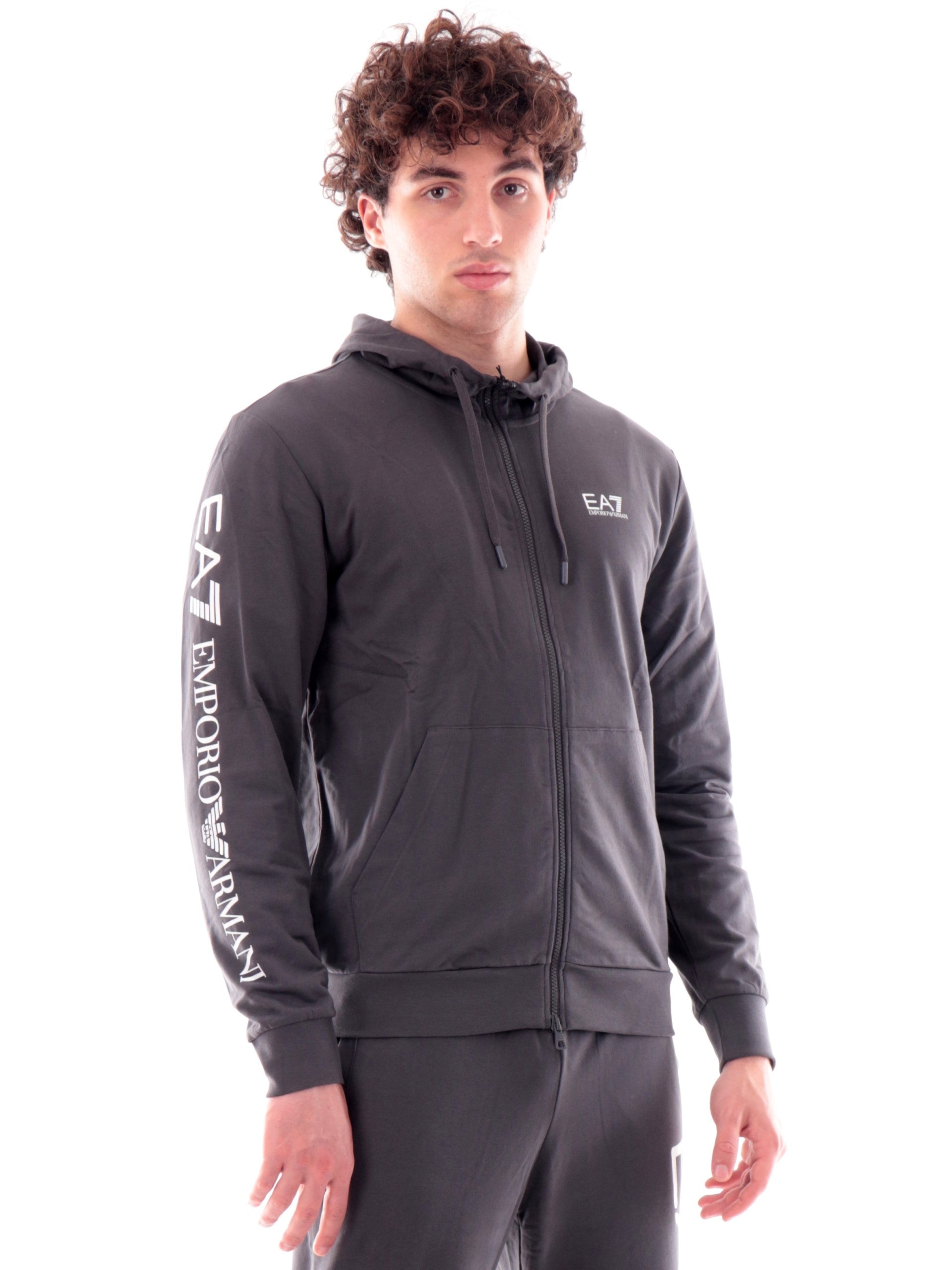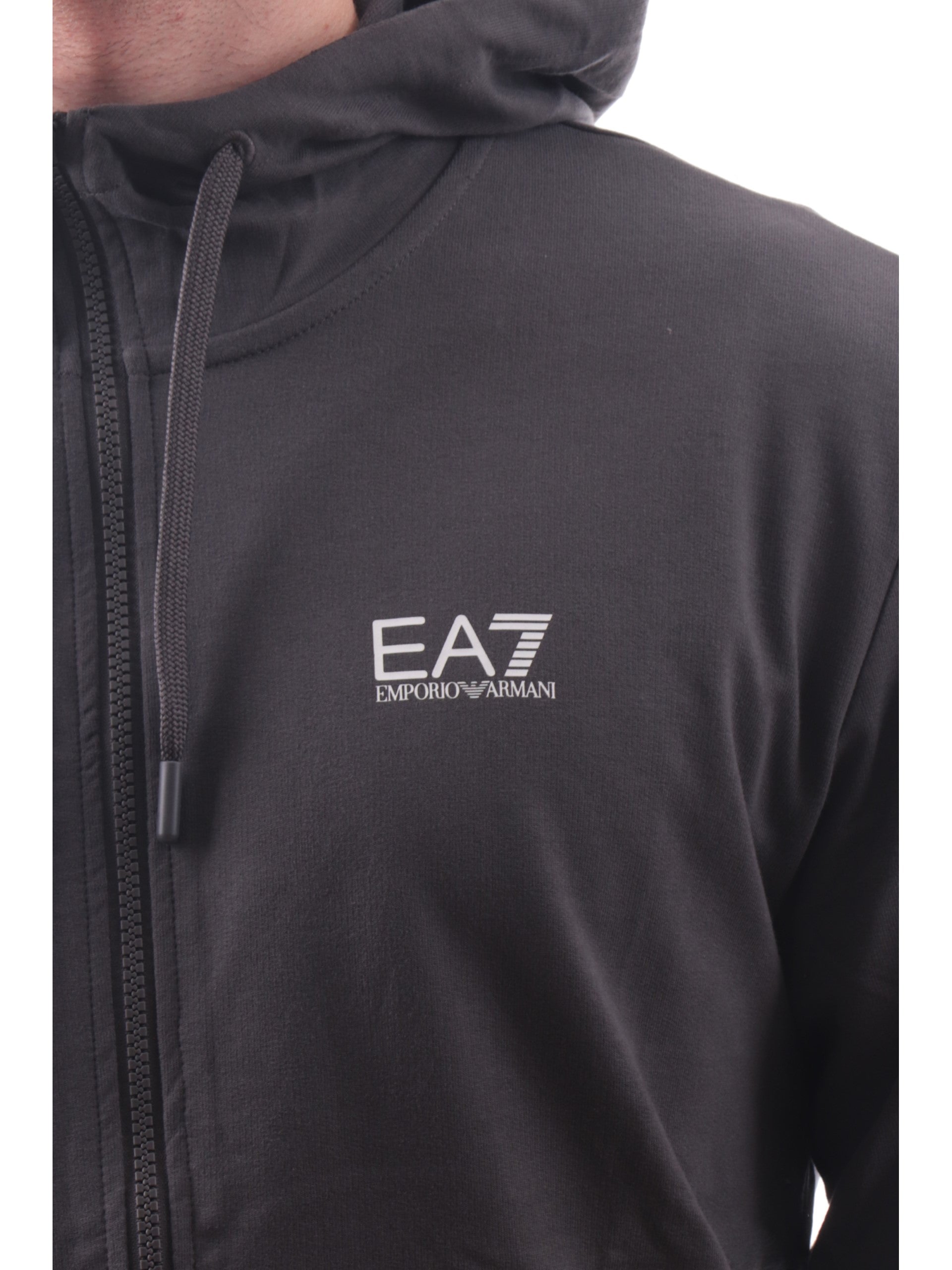 Felpa grigia EA7 da uomo con cappuccio. Questa felpa grigia EA7 da uomo realizzata 100% in puro cotone è caratterizzata da cappuccio fisso regolabile con lacci, chiusura centrale full zip con doppio cursore, la scritta EA7 applicato a lato cuore, due tasche laterali aperte, la maxi scritta Emporio Armani applicato sulla manica destra, polsini e fondo elasticizzati a costine