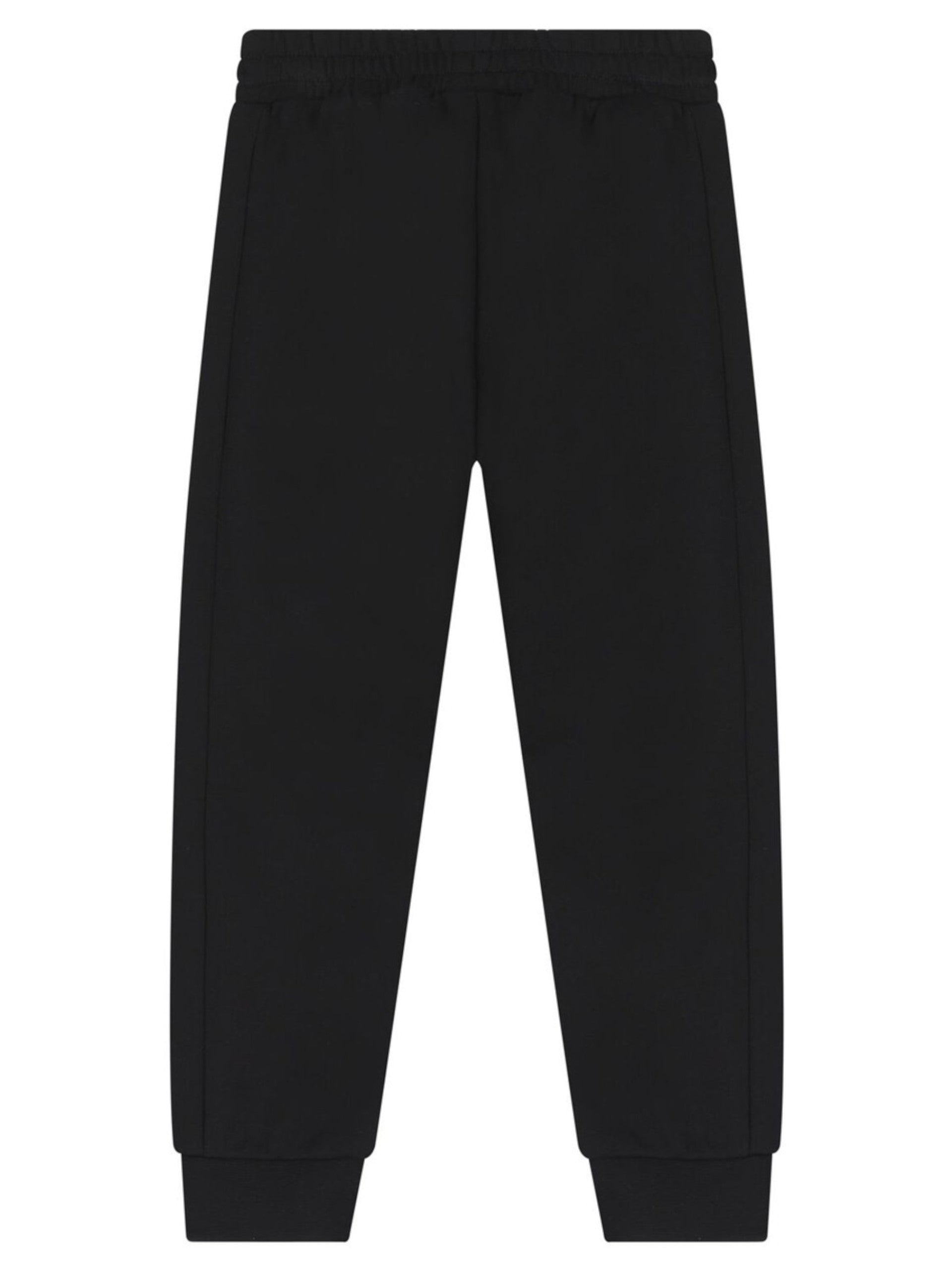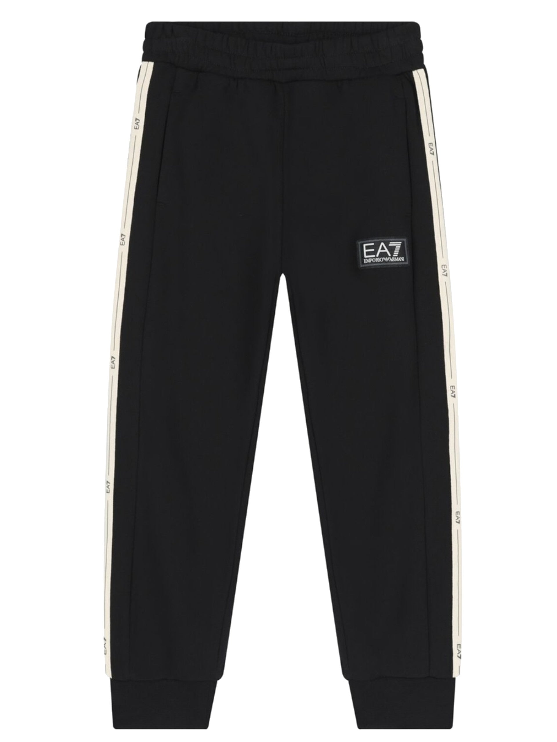 Pantaloni tuta EA7 nero felpato bambino. Questi pantaloni tuta EA7 neri sono realizzati da cotone felpato adatto per la stagione invernale, hanno la banda elastica sul punto vita regolabile con laccetti, due tasche laterali aperte e fondo con polsini elasticizzati.