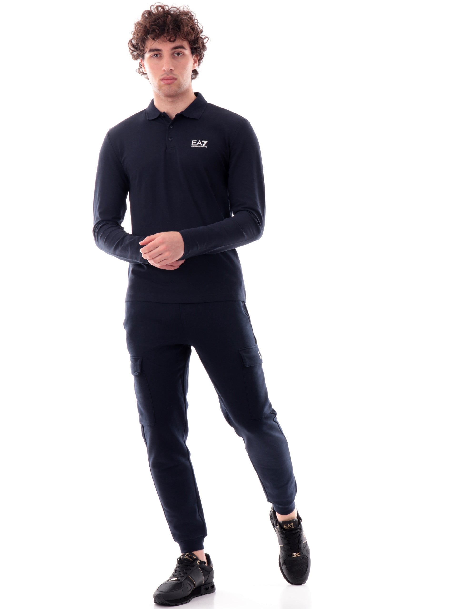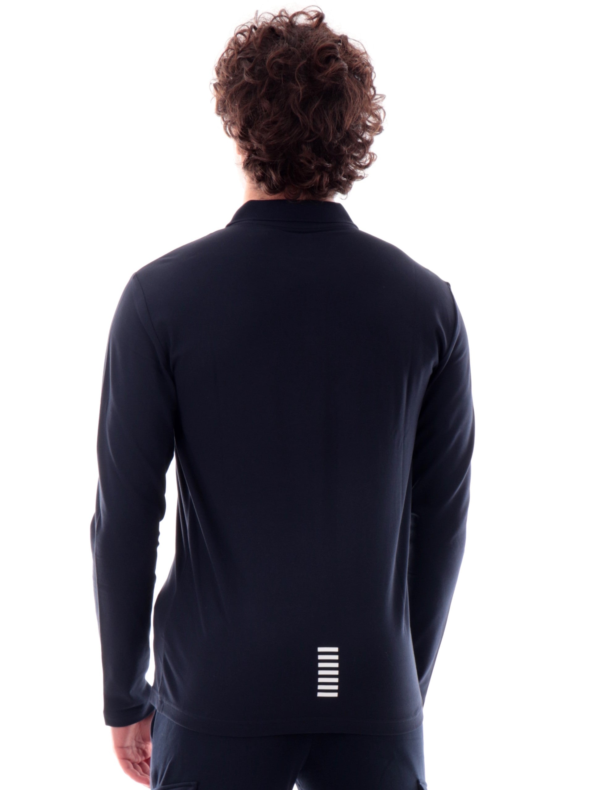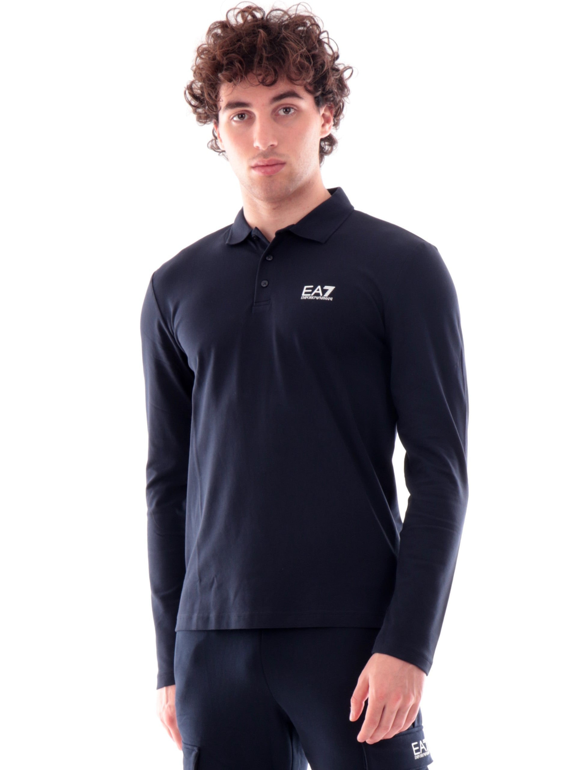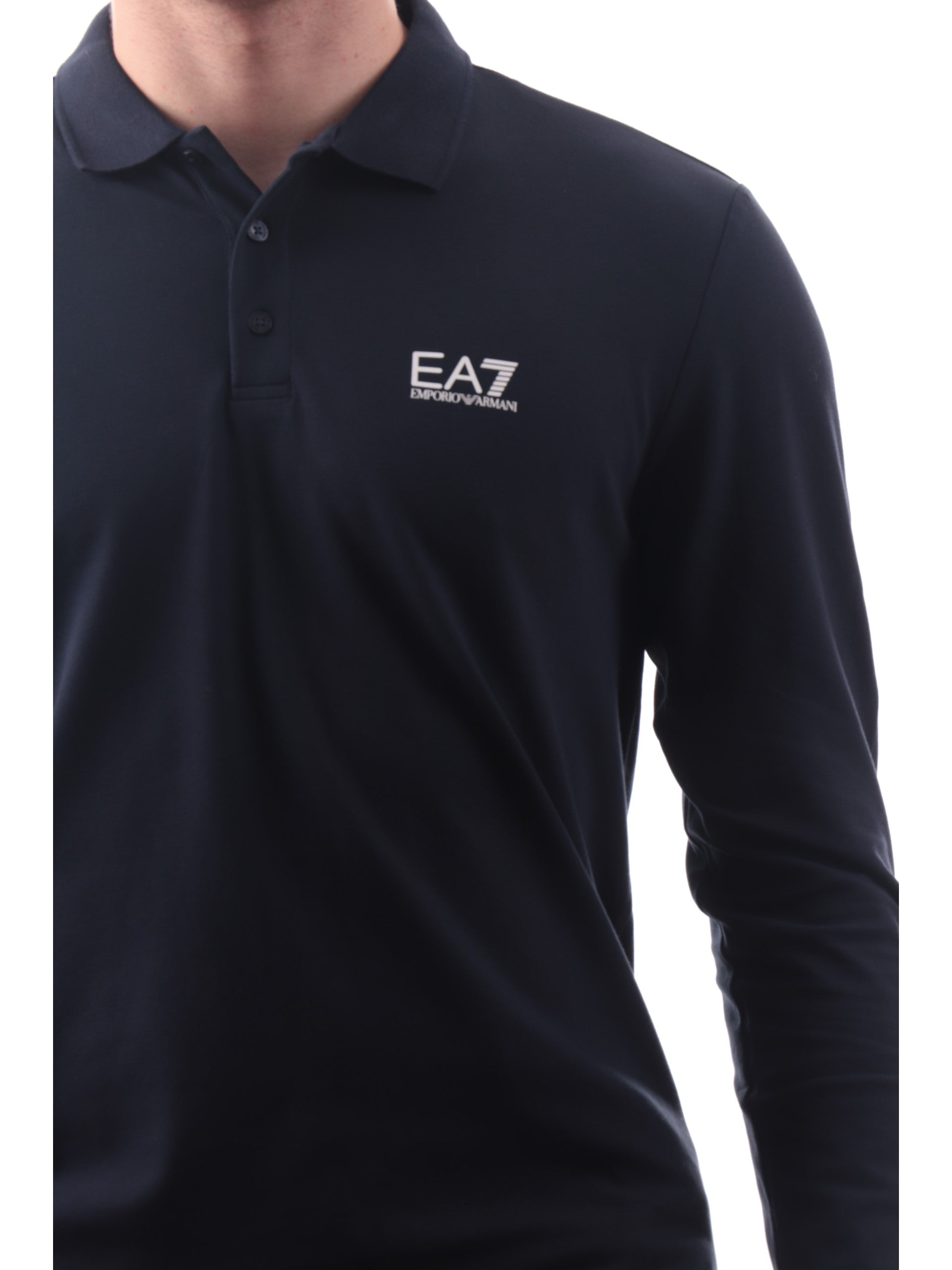 Polo EA7 blu da uomo. Questa polo Emporio Armani è realizzata in morbido cotone elasticizzato ed è caratterizzata da una chiusura a tre bottoni, maniche lunghe, polsini e fondo regolare e il logo delbrand applicato al lato cuore. La composizione in cotone rende questa polo morbida al tatto e comoda da indossare