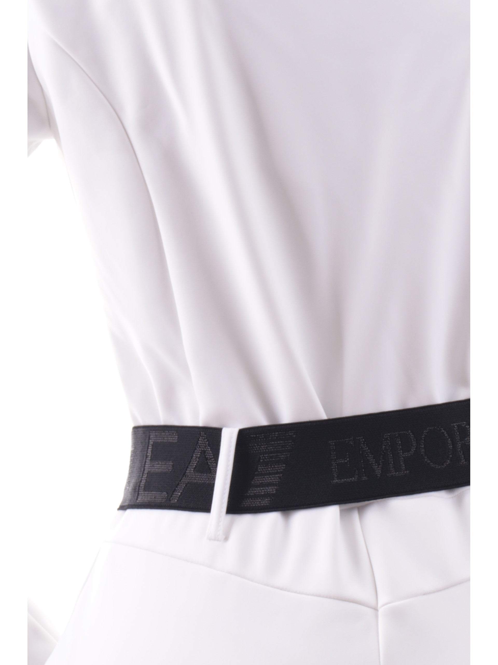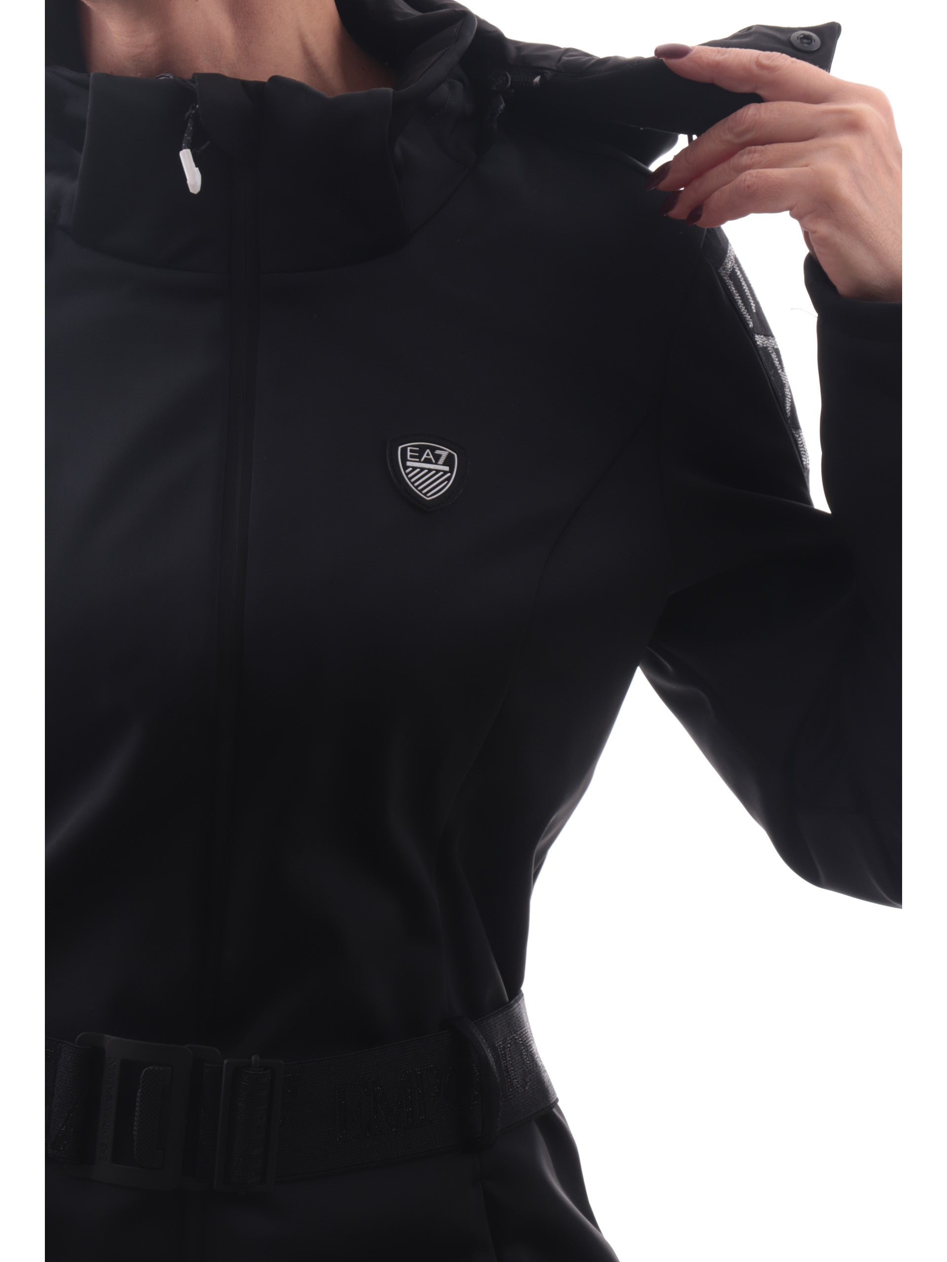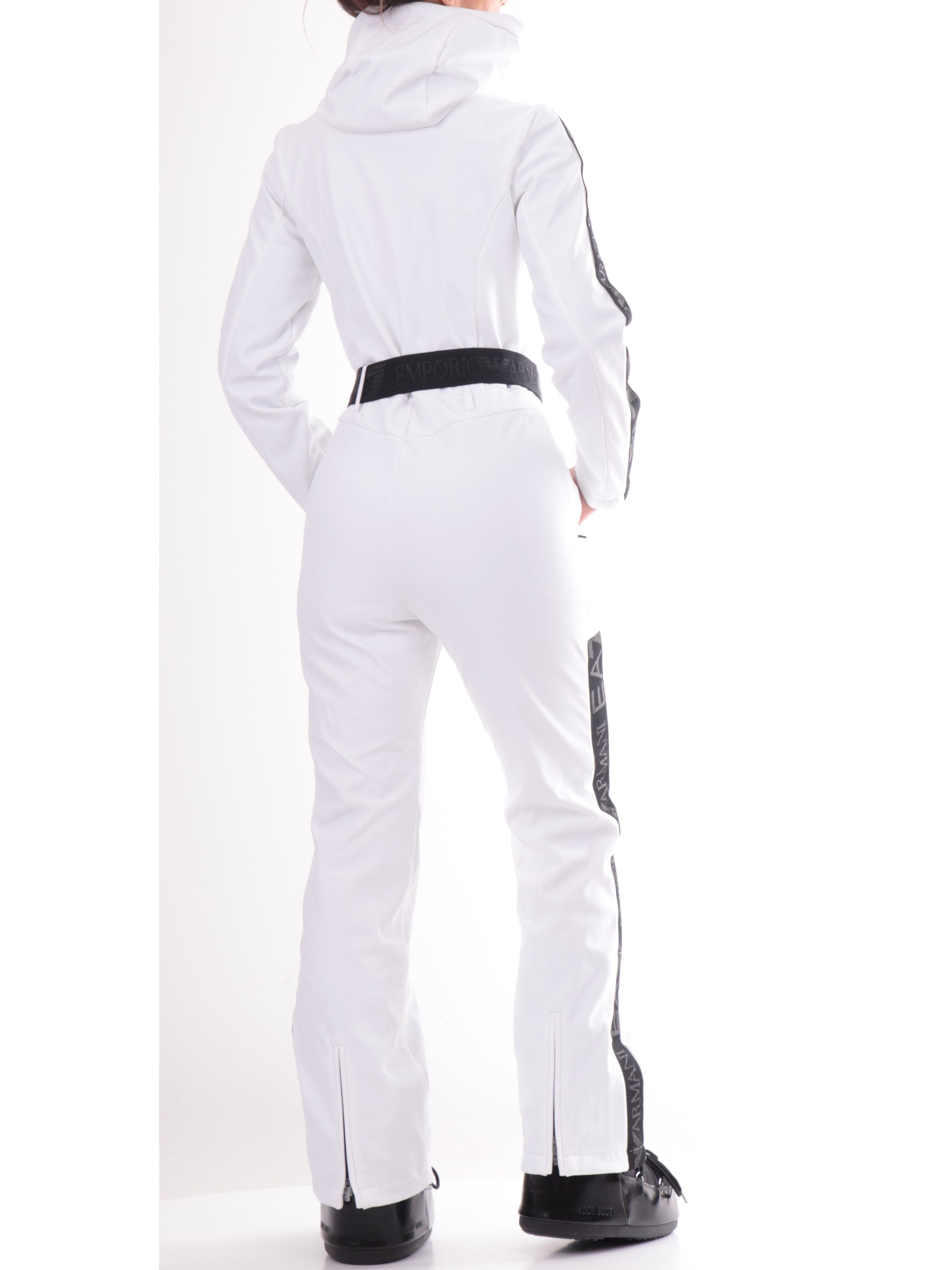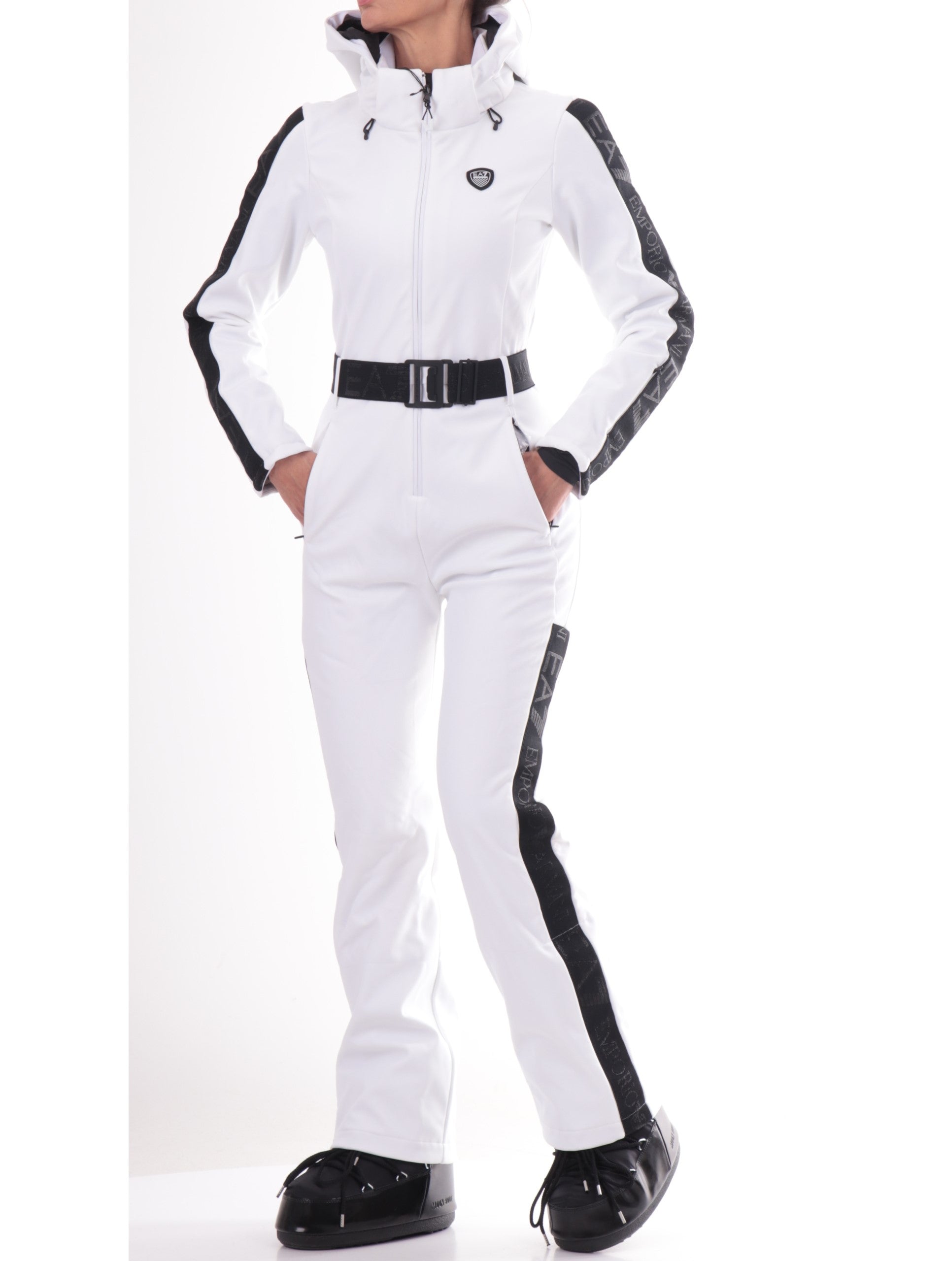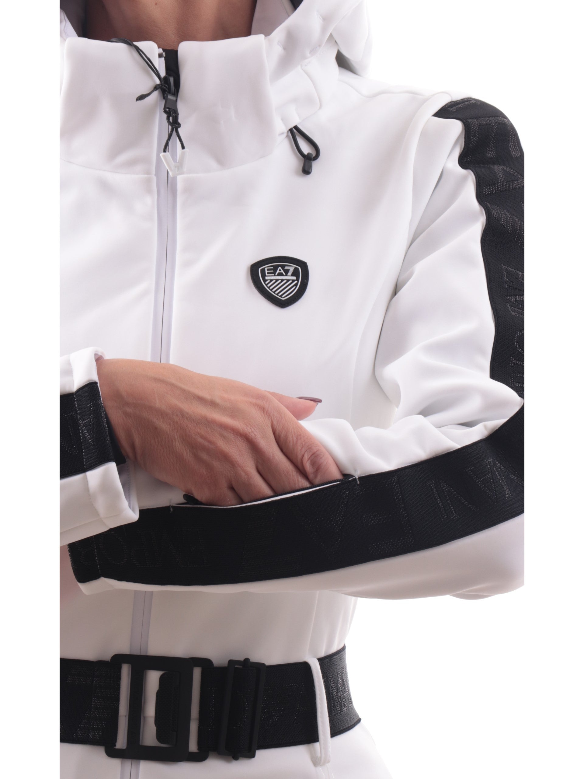 Tuta intera tecnica bianca da sci EA7 da donna. Questa tuta intera EA7 è realizzata da un tessuto tecnico impermeabile, traspirante ed idrorepellente realizzata in tessuto softshell altamente performante ed elasticizzato. la tuta EA7 è caratterizzato da bande elastiche logate, presenta un cappuccio removibile con zip e regolabile, chiusura centrale full zip, due pratiche tasche laterali con zip impermeabili, maniche logate, logo del brand lato cuore, cintura logata, ghetta interna e zip al fondo per facilitare la calzata degli scarponi, dettagli stilistici e di funzione che completano un capoche assicura il massimo comfort discesa dopo discesa.