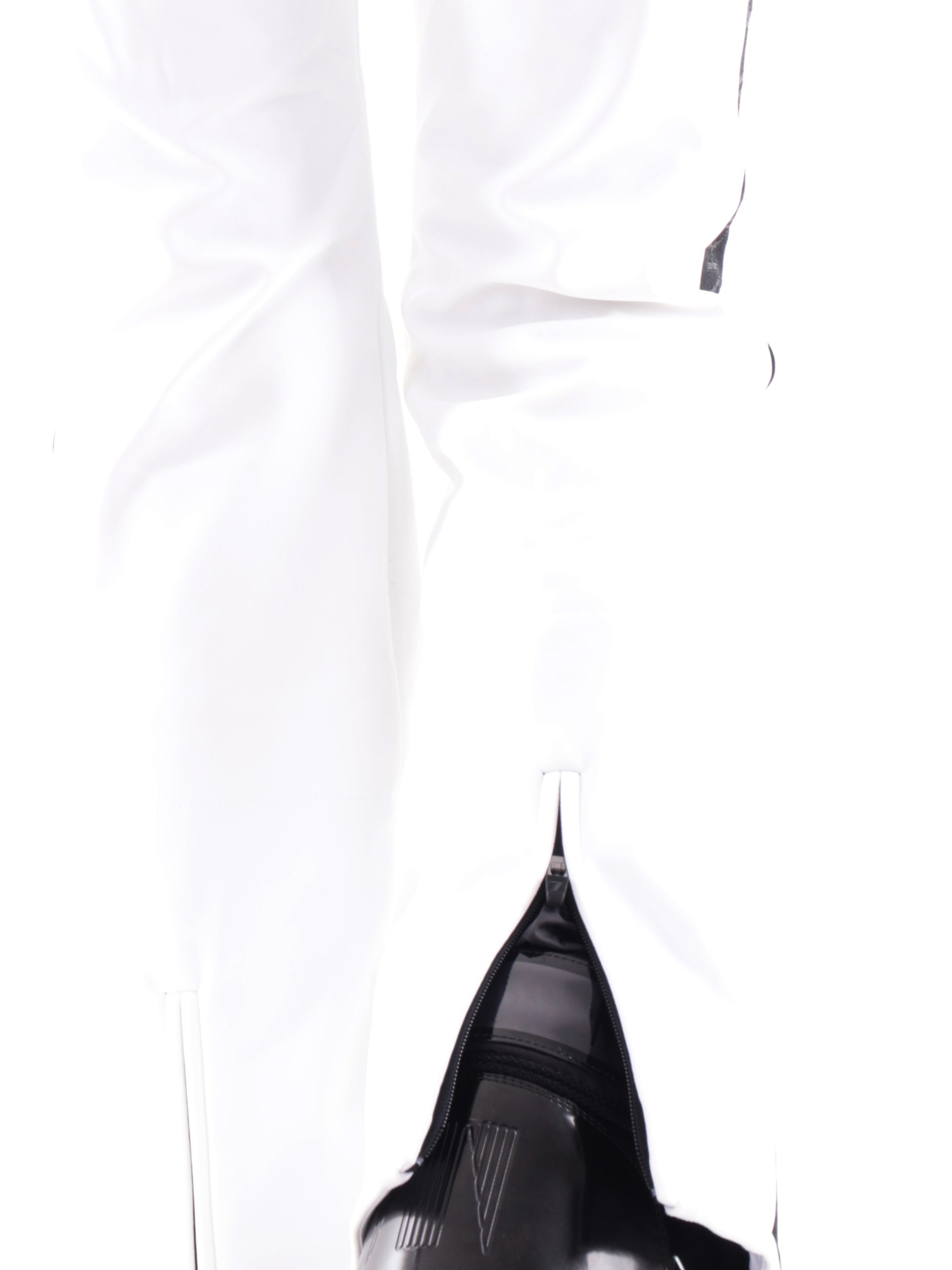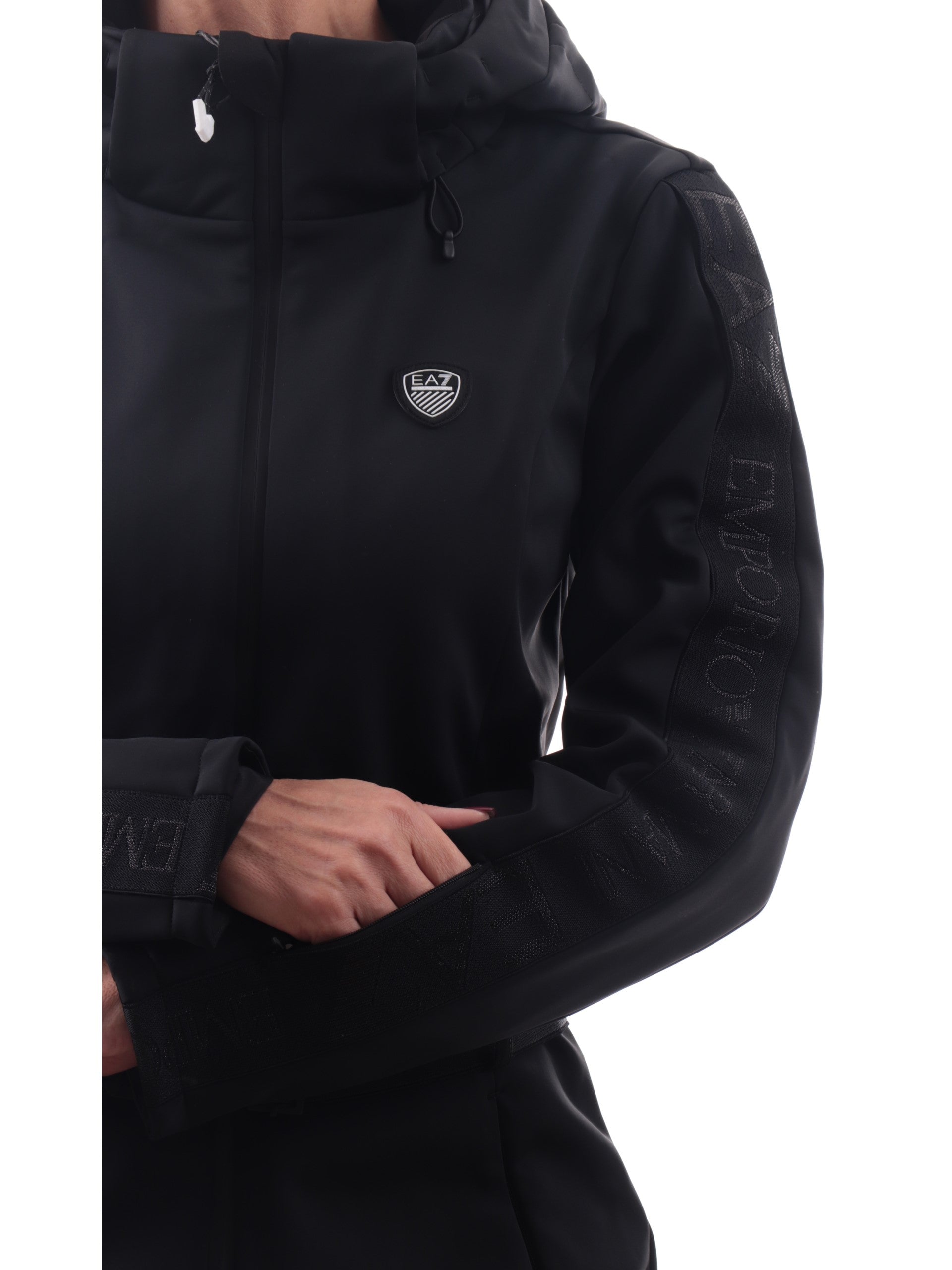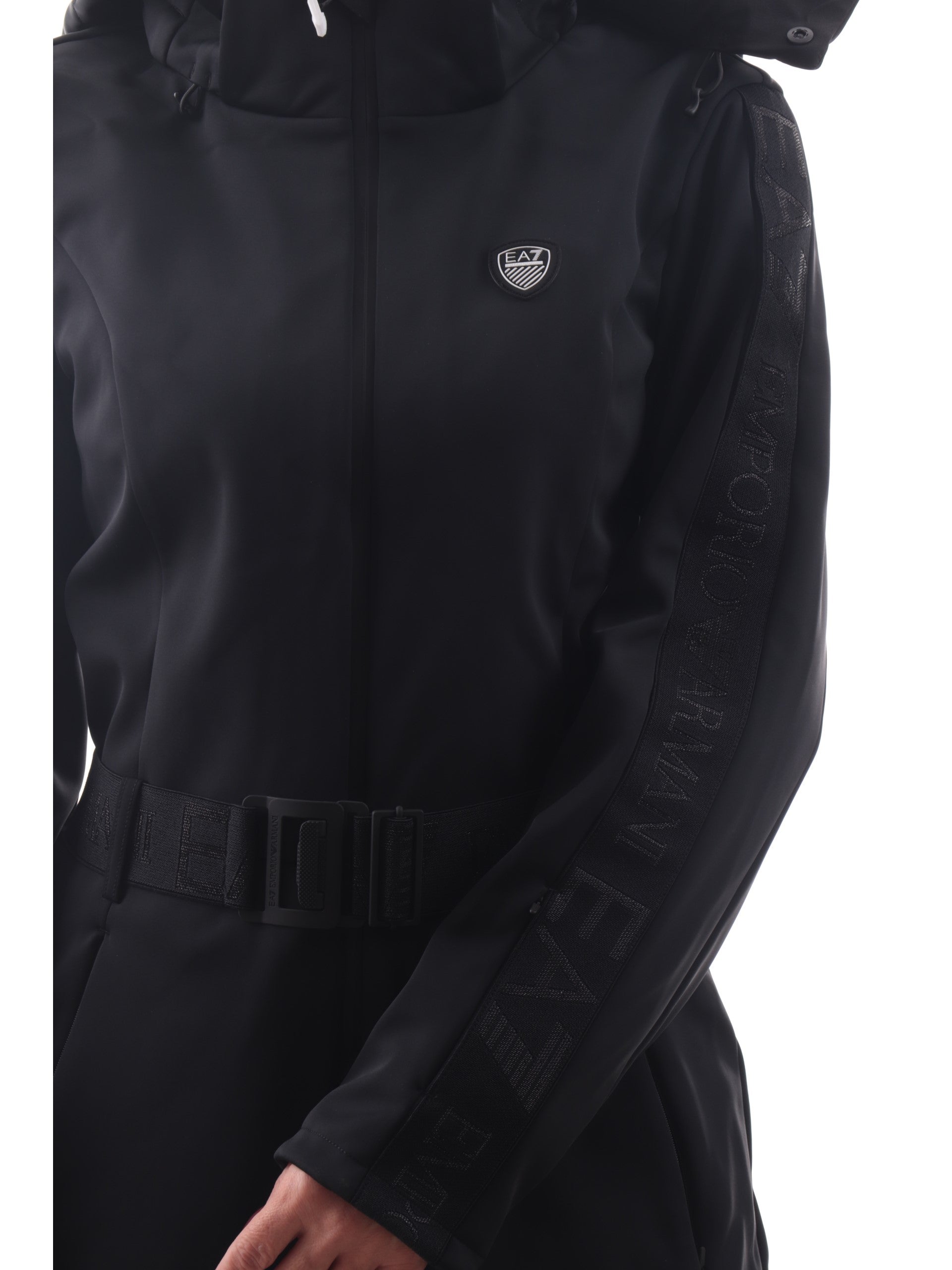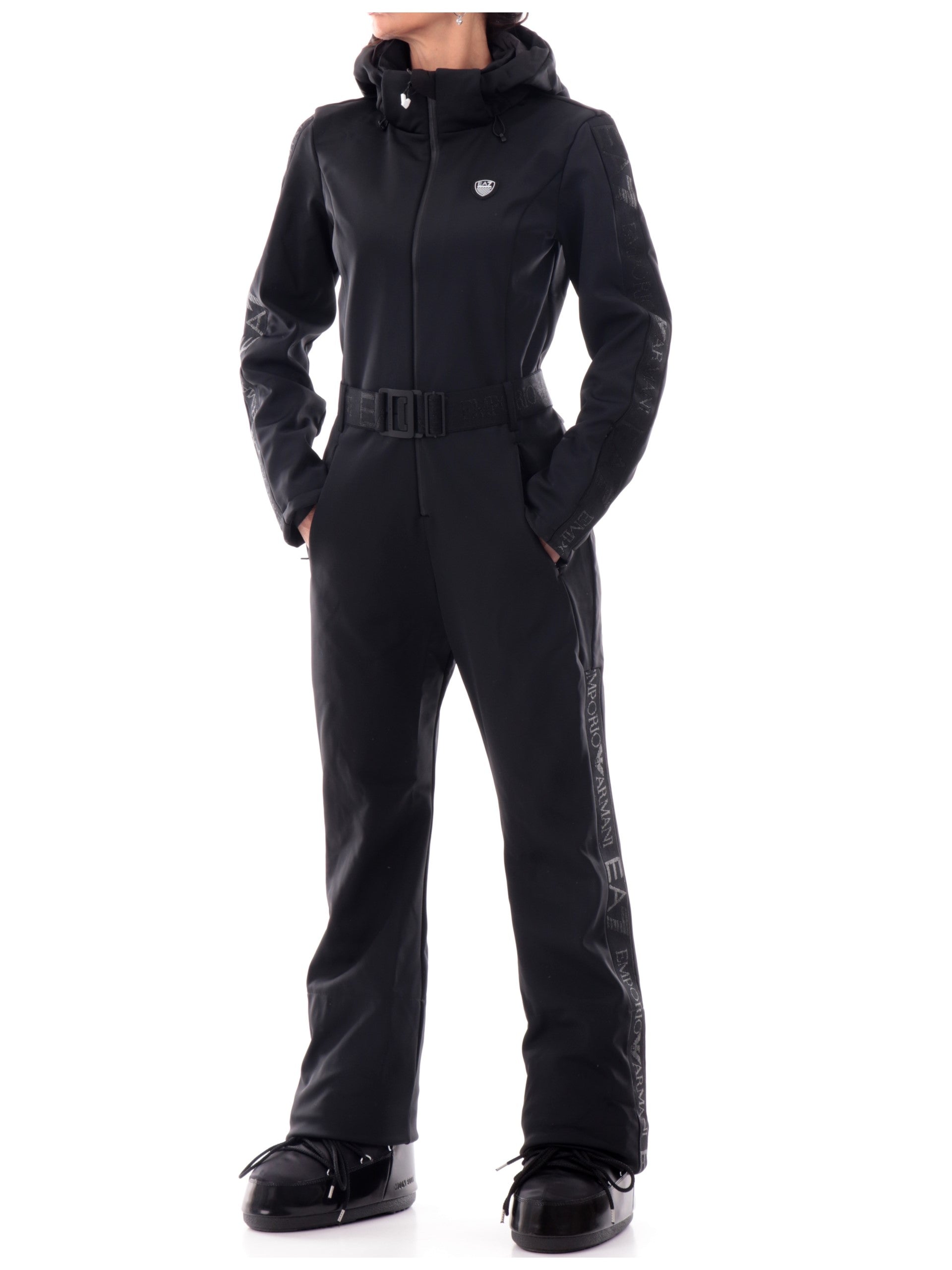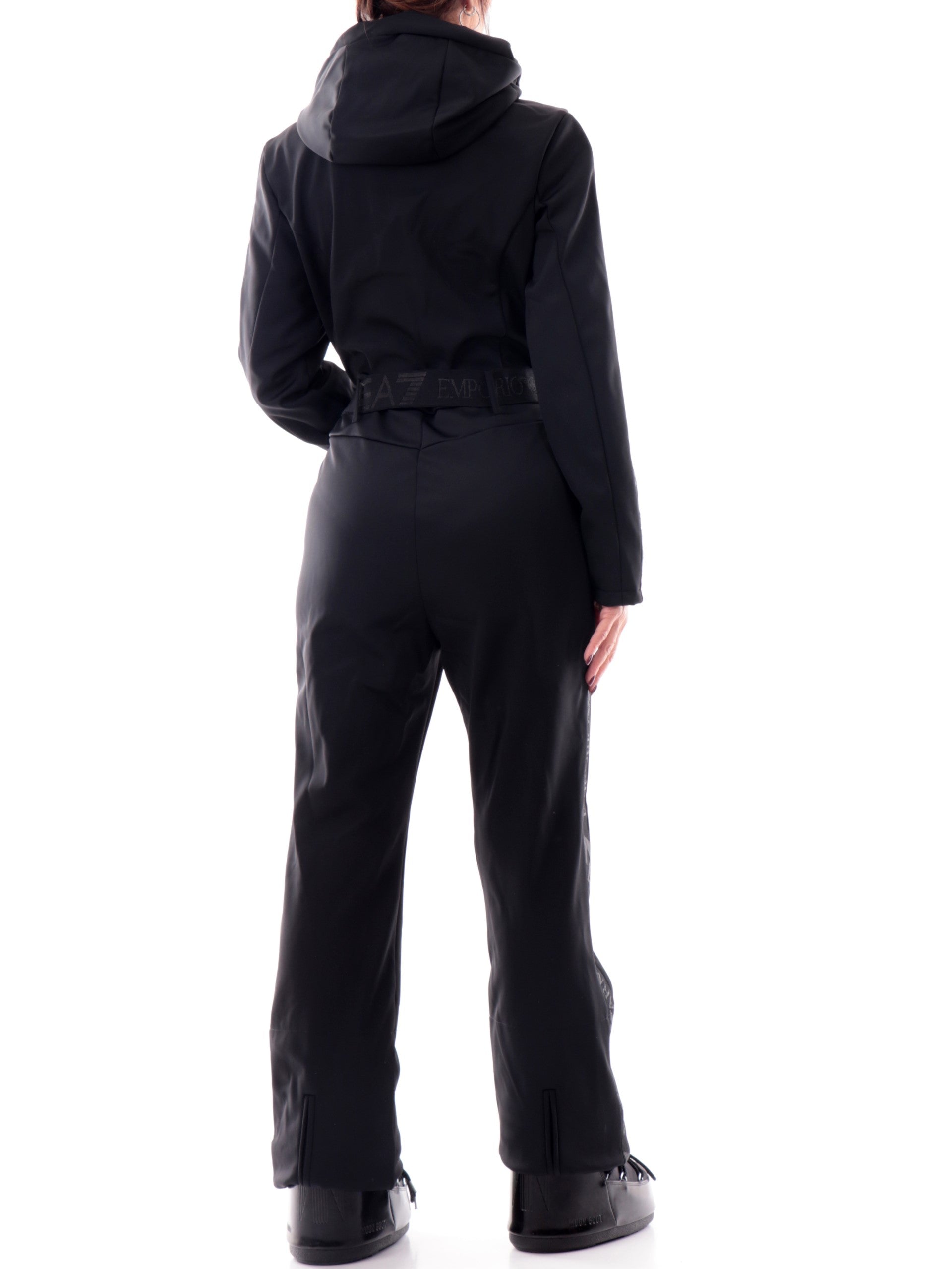 Tuta intera tecnica bianca da sci EA7 da donna. Questa tuta intera EA7 è realizzata da un tessuto tecnico impermeabile, traspirante ed idrorepellente realizzata in tessuto softshell altamente performante ed elasticizzato. la tuta EA7 è caratterizzato da bande elastiche logate, presenta un cappuccio removibile con zip e regolabile, chiusura centrale full zip, due pratiche tasche laterali con zip impermeabili, maniche logate, logo del brand lato cuore, cintura logata, ghetta interna e zip al fondo per facilitare la calzata degli scarponi, dettagli stilistici e di funzione che completano un capoche assicura il massimo comfort discesa dopo discesa.