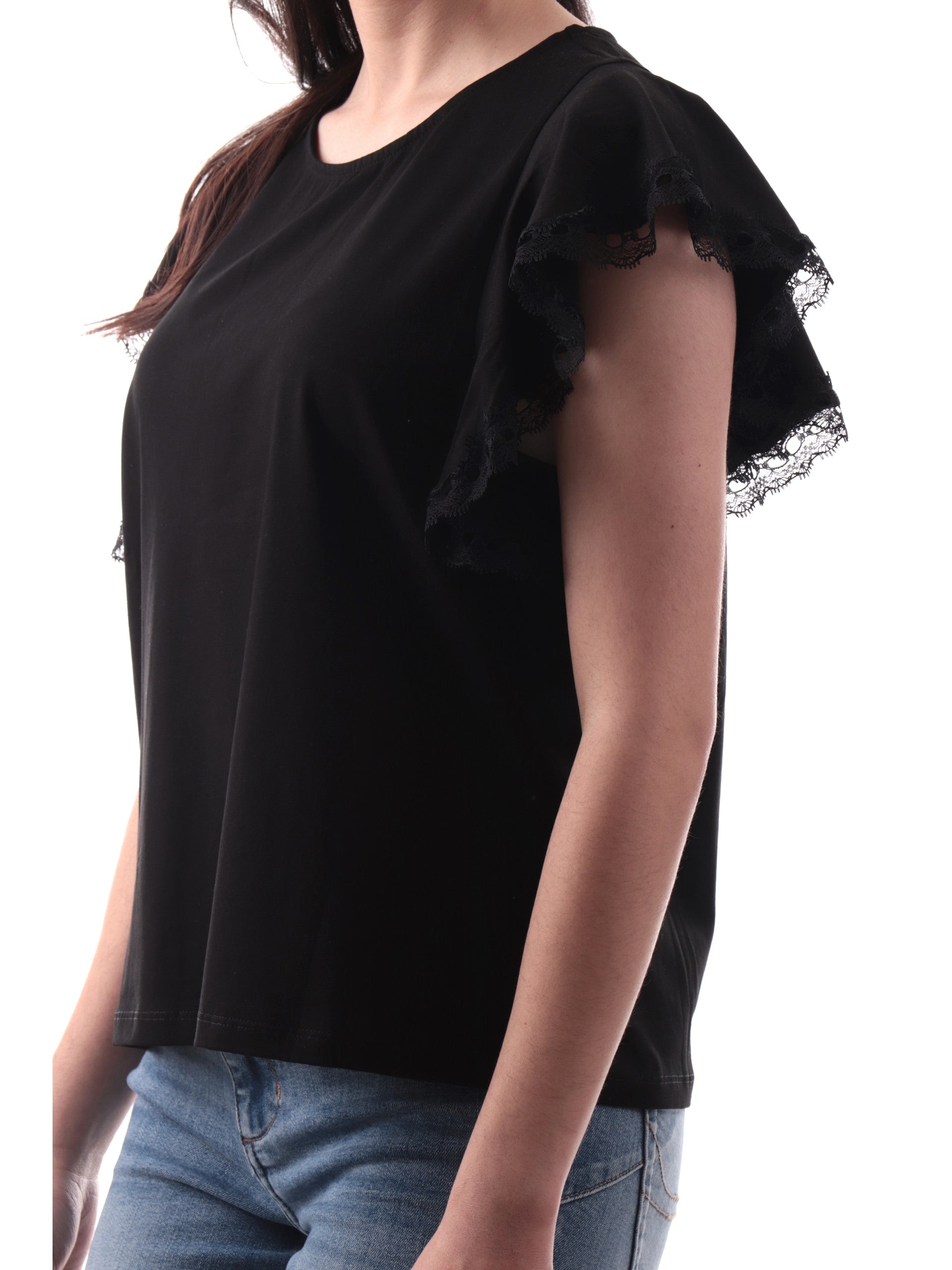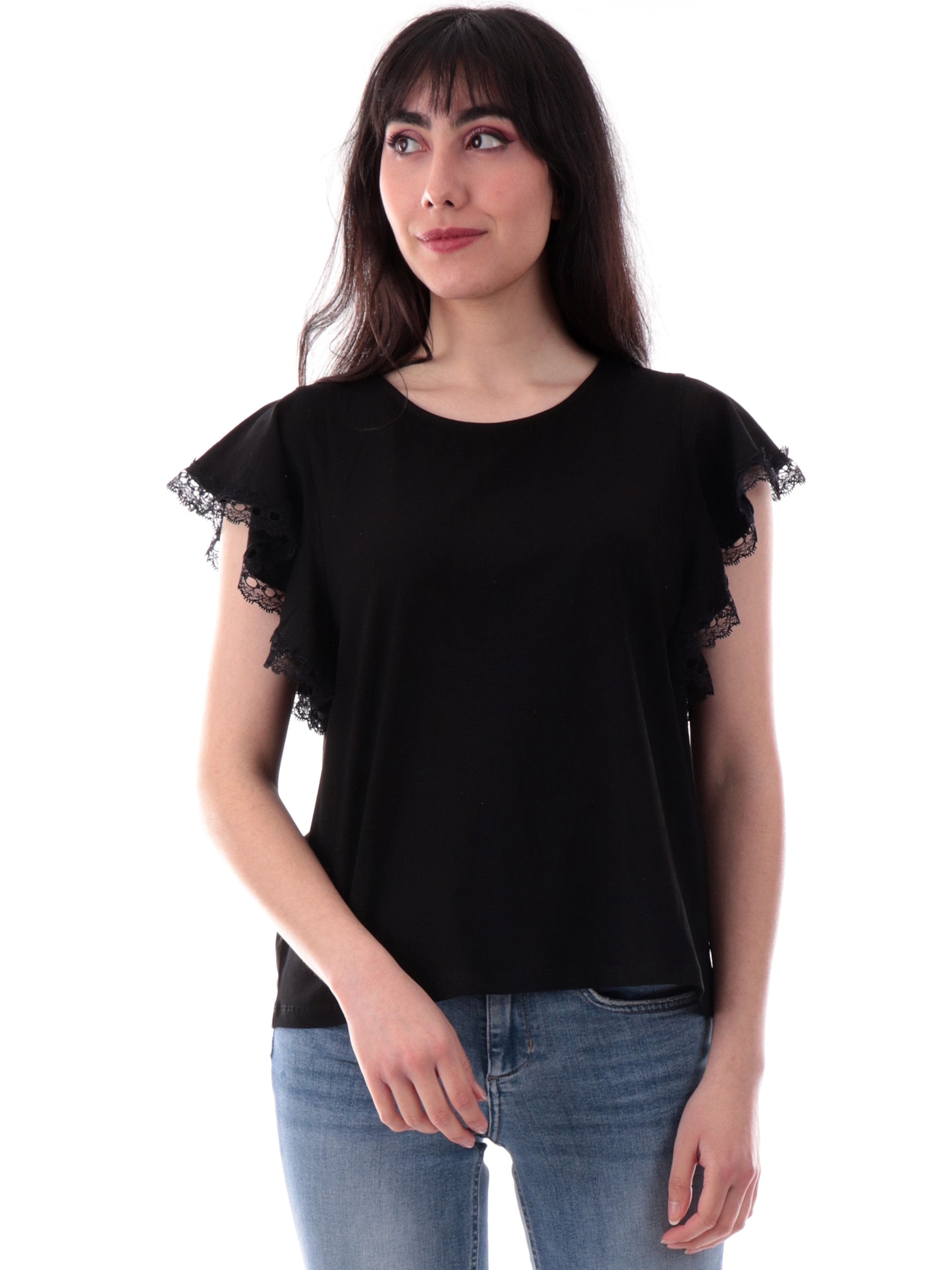 Maglia Molly Bracken nera da donna maniche con balze T2017DP, realizzata in 100% cotone. Questa t-shirt Molly nera girocollo ha le maniche corte con balze e la composizione in 100% puro cotone.