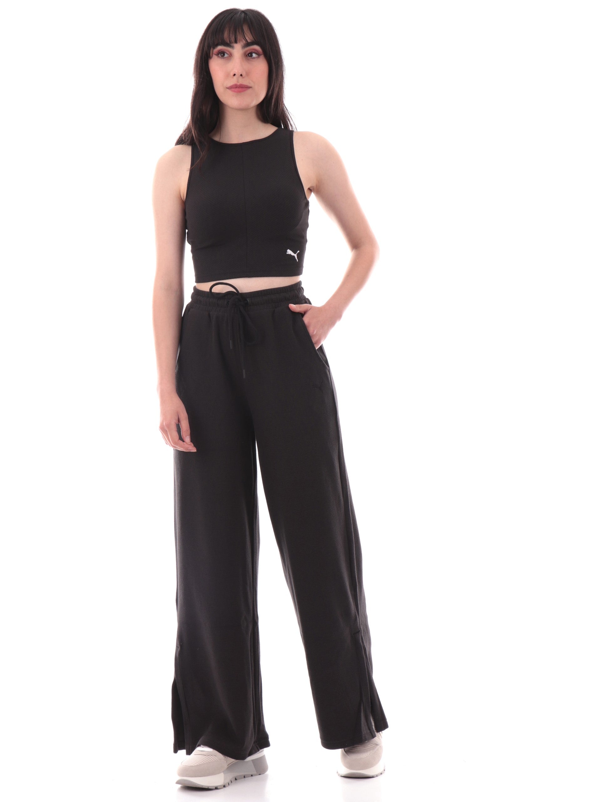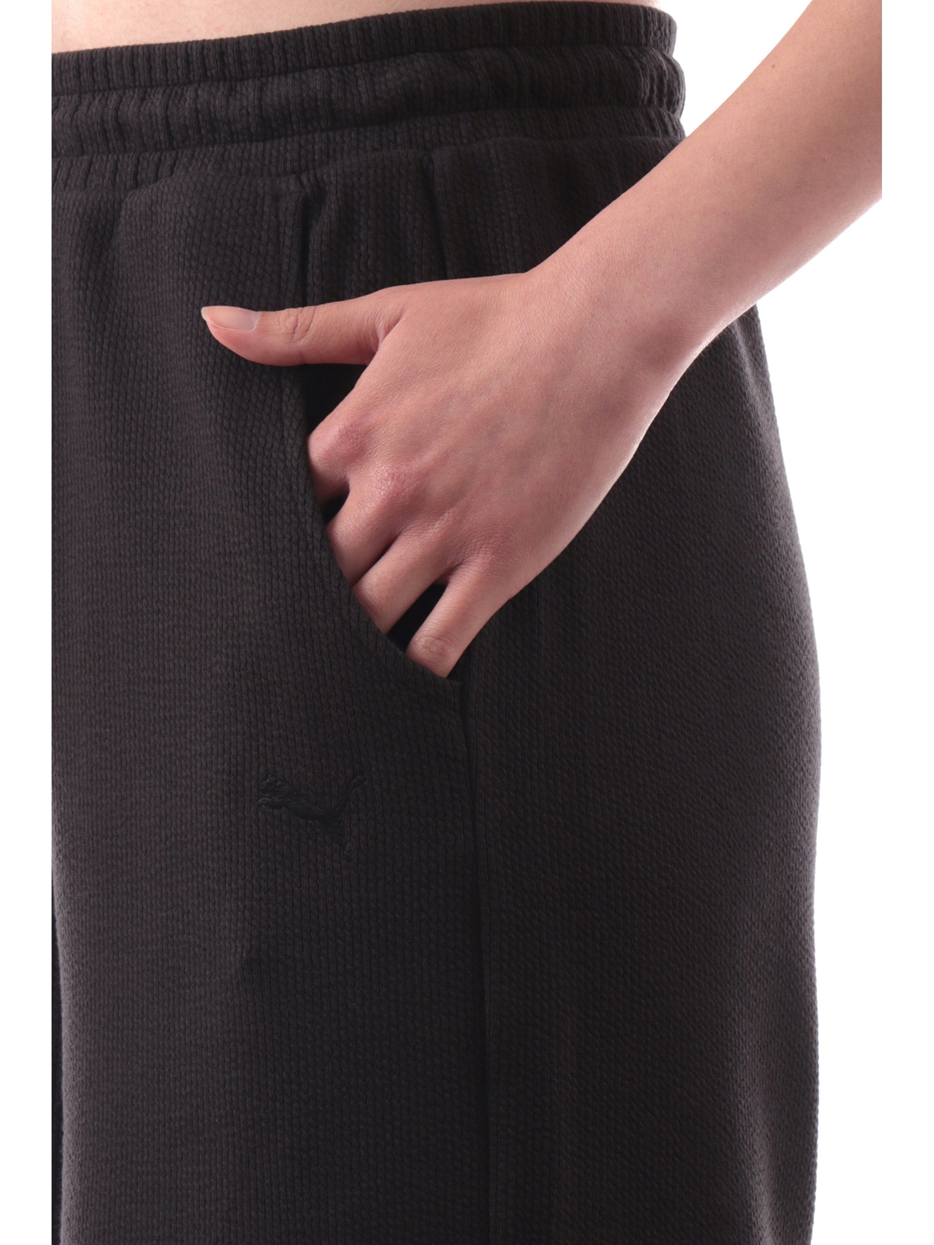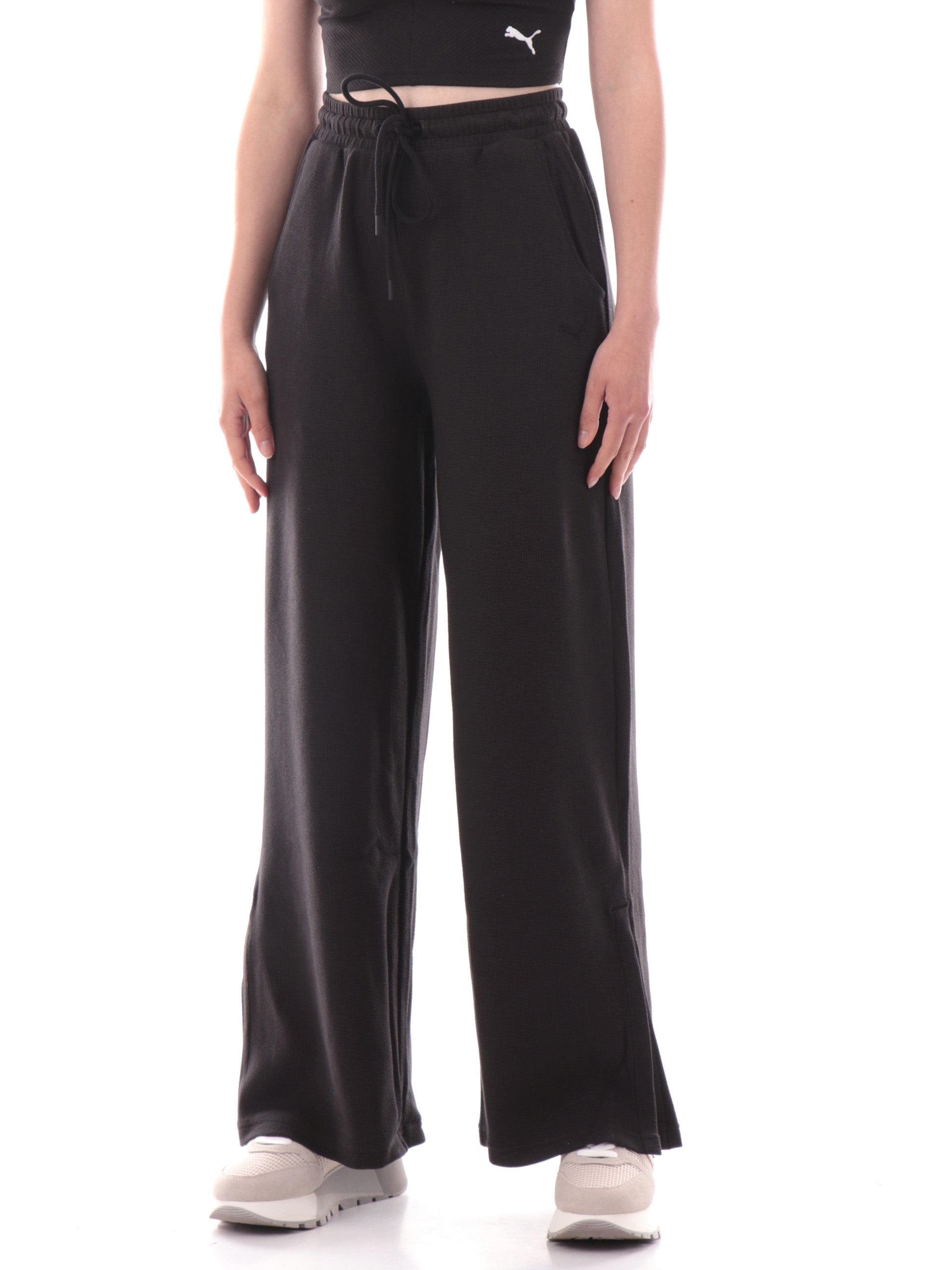Pantaloni tuta Puma vita alta da donna nido d'ape 685061. Questi pantaloni vita alta Puma neri hanno la banda elastica sul punto vita regolabile con laccetti, due tasche laterali aperte con taglio obliquo, una tasca posteriore aperta e la vestibilità morbida.