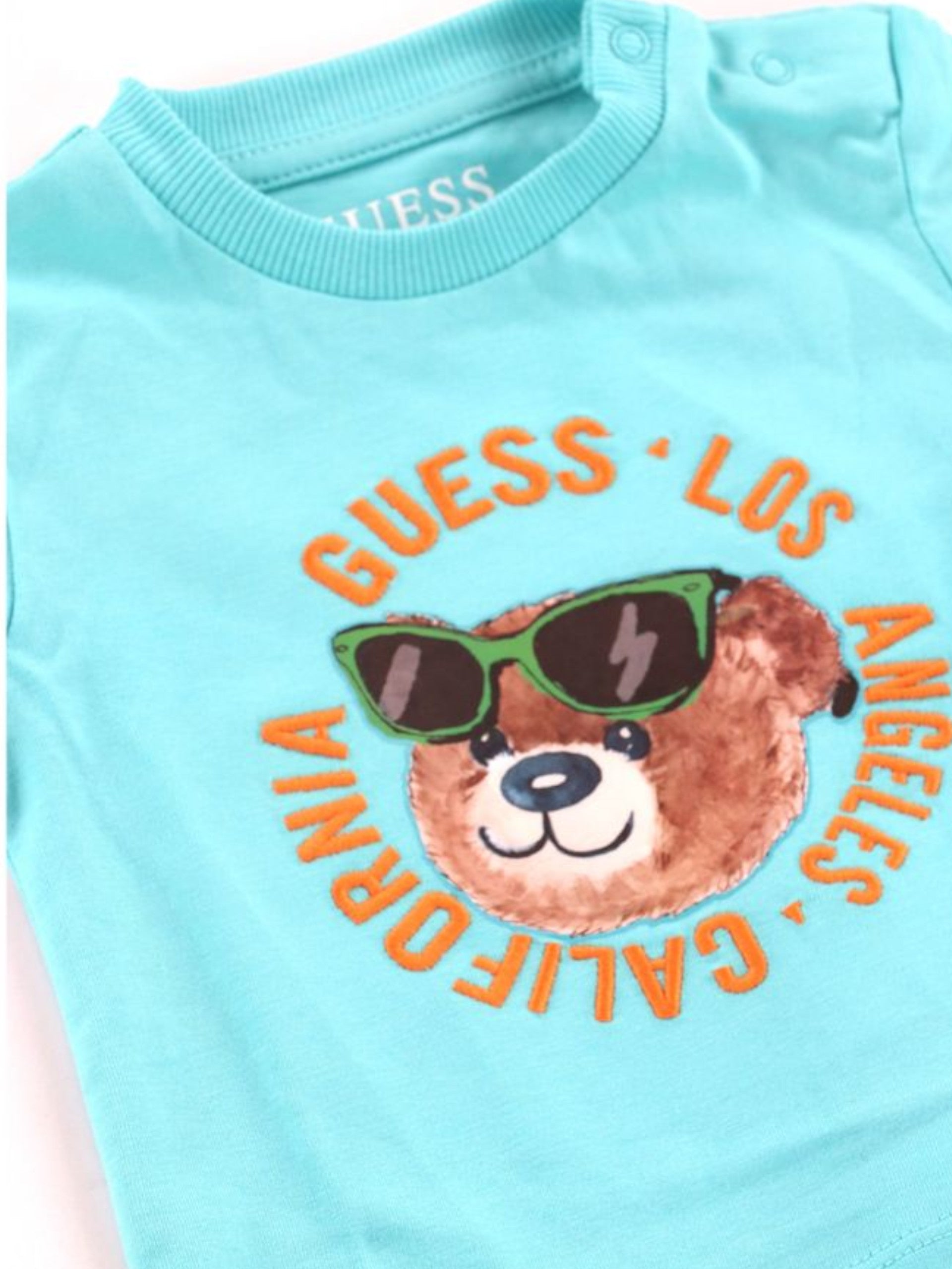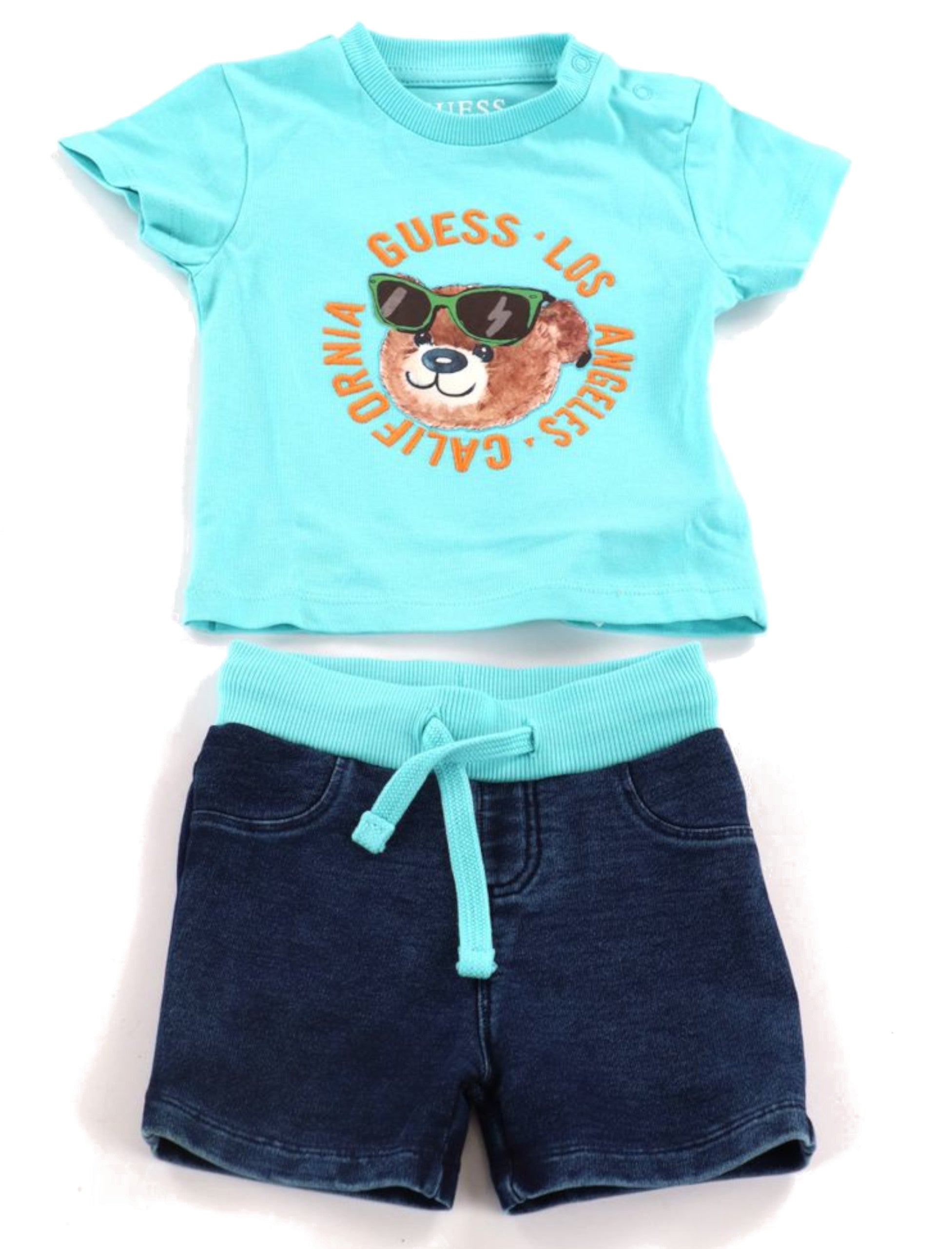 Completo tuta celeste Guess da neonato T-shirt e shorts. Questa tuta da bambino celeste, realizzato 100% in puro cotone, è composta da T-shirt e pantaloncino. la T-shirt da bambino, realizzata in morbido cotone di alta qualità, garantisce comfort e traspirabilità, ideale per le giornate calde. La maglietta è caratterizzata dalla stampa di un orsacchiotto più scritta, girocollo con bottone e maniche corte. La t-shirt celeste è versatile e può essere facilmente abbinata a jeans creando outfit per ogni occasione. Il pantaloncino in denim Guess, realizzato in morbido cotone, hanno la banda elastica sul punto vita con lacci regolabili, due tasche laterali finte e sul retro troviamo due tasche a filo di cui una ricamato l'orsacchiotto con la scritta Guess. Questi short versatili sono perfetti per qualsiasi occasioni e sono perfetti per la stagione estiva