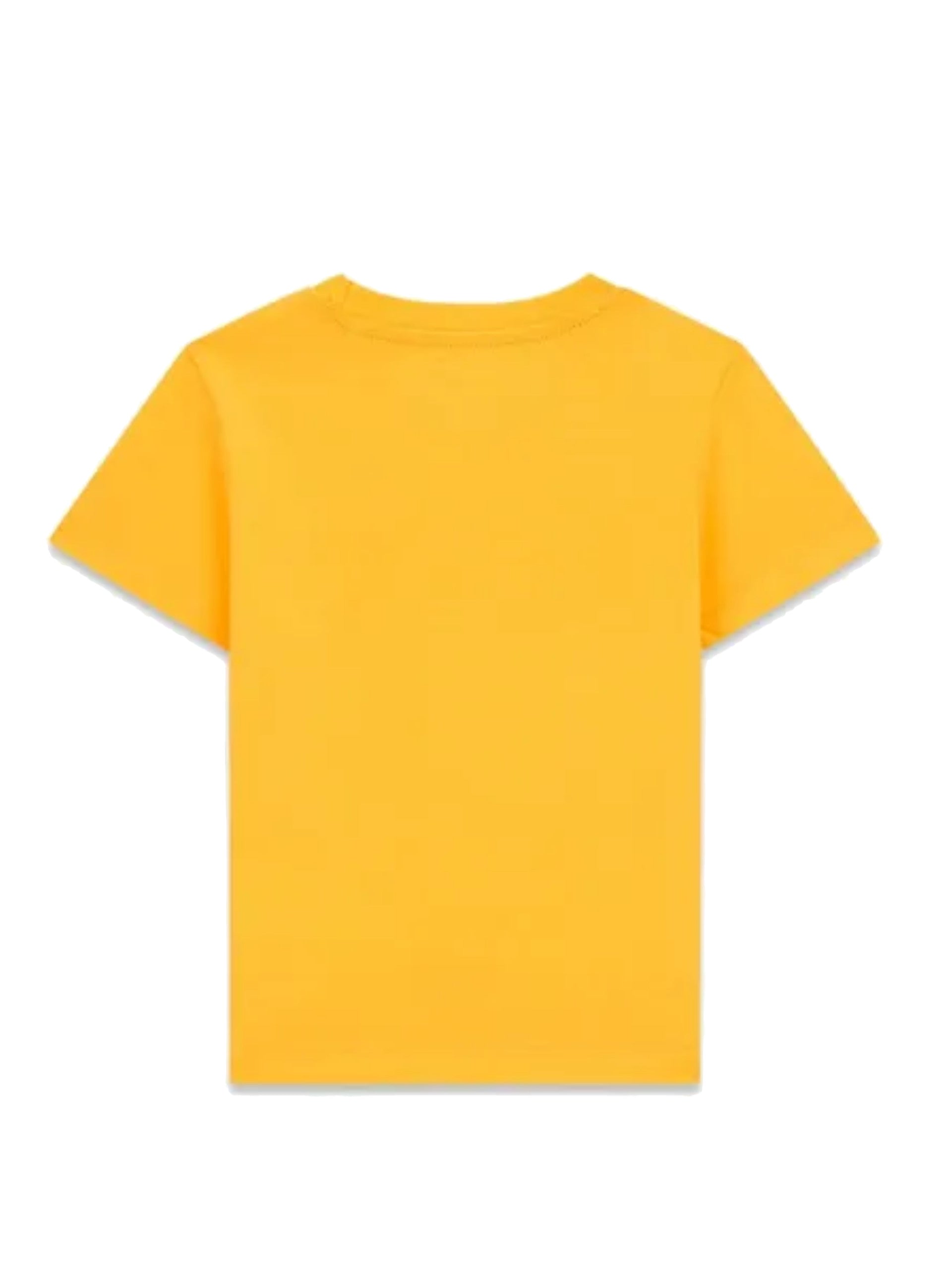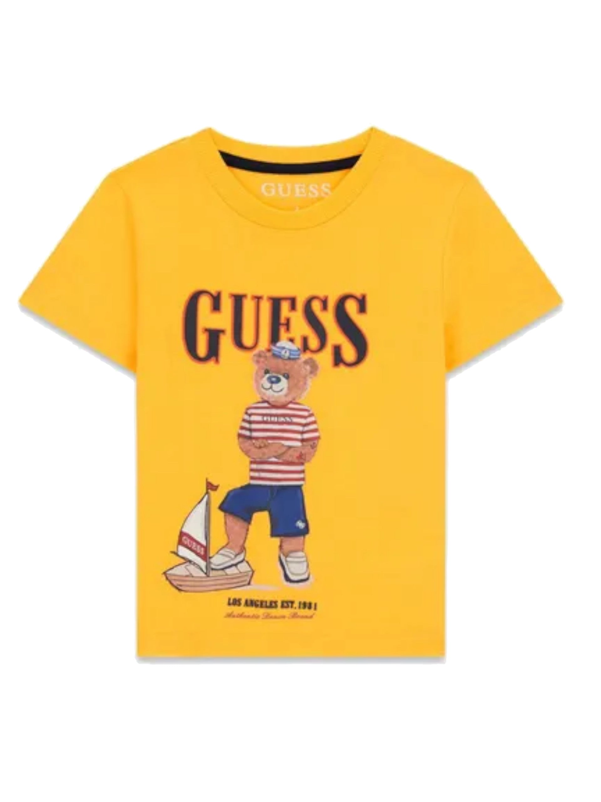 T-shirt gialla Guess da bambino con stampa orsacchiotto. Questa T-shirt da bambino, realizzata 100% in puro cotone, perfetta per la stagione primavera-estate ed è perfetta per un outfit casual e sportivo, è caratterizzata dal girocollo, maniche corte, fondo regolare e la stampa orsacchiotto