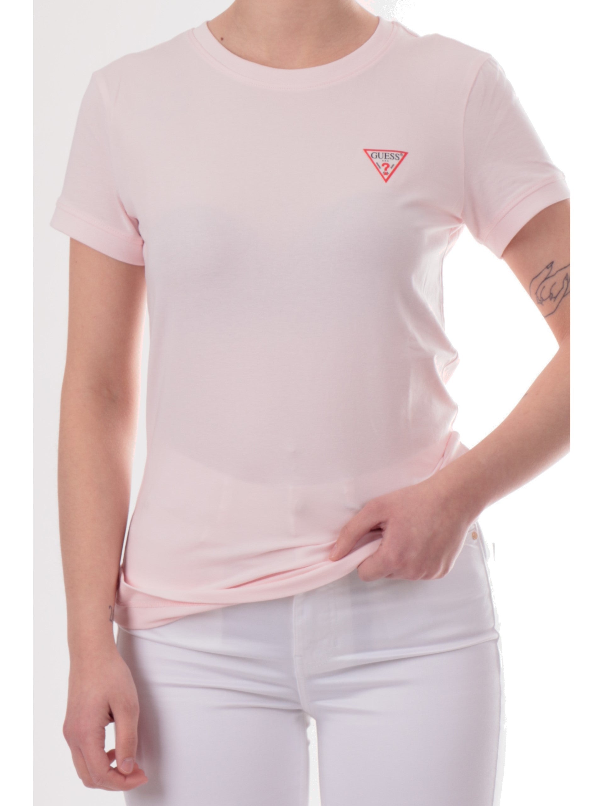 T-shirt Guess rosa da donna. Questa T-shirt da donna, realizzata in cotone, ha le maniche corte, girocollo, fondo regolare e L'iconico triangolo Guess a lato cuore. Questa maglietta Guess rosa ha la vestibilità slim ed è perfetta per le giornate estive