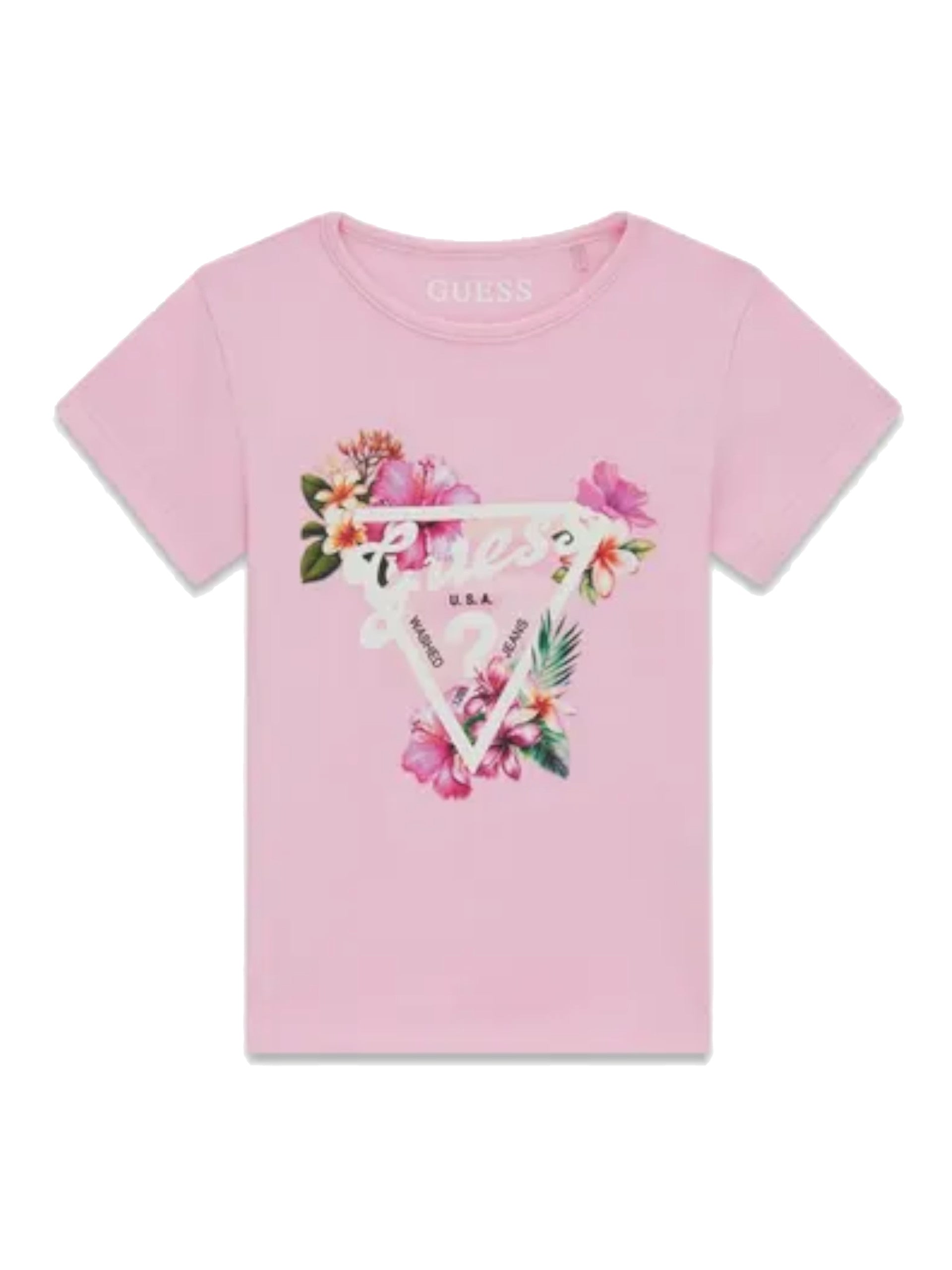 T-shirt rosa Guess da bambina con stampa triangolo floreale. Questa T-shirt è un'aggiunta perfetta al guardaroba estivo delle piccole. Realizzata in morbido cotone di alta qualità, garantisce comforte traspirabilità,ideale per le giornate calde. La maglietta è caratterizzata dall'iconico triangolo Guess sul petto. La T-shirt rosa è versatile e può essere facilmente abbinata a jeans, leggings, creando outfit adorabili perogni occasione
