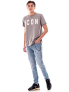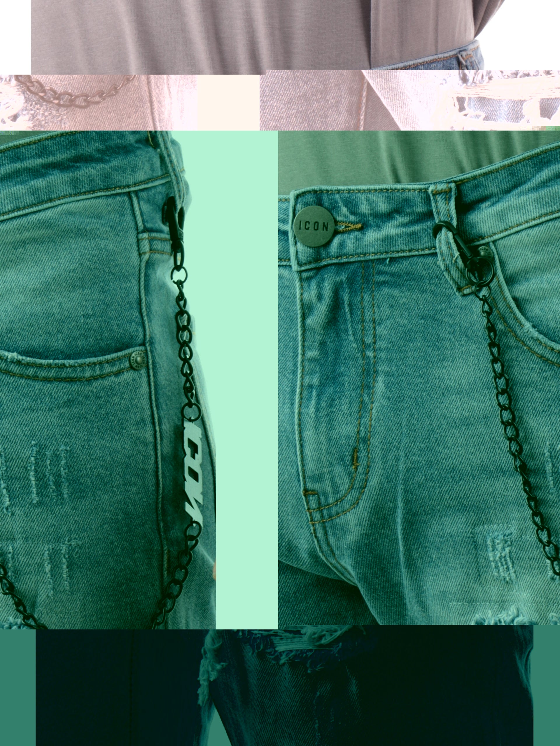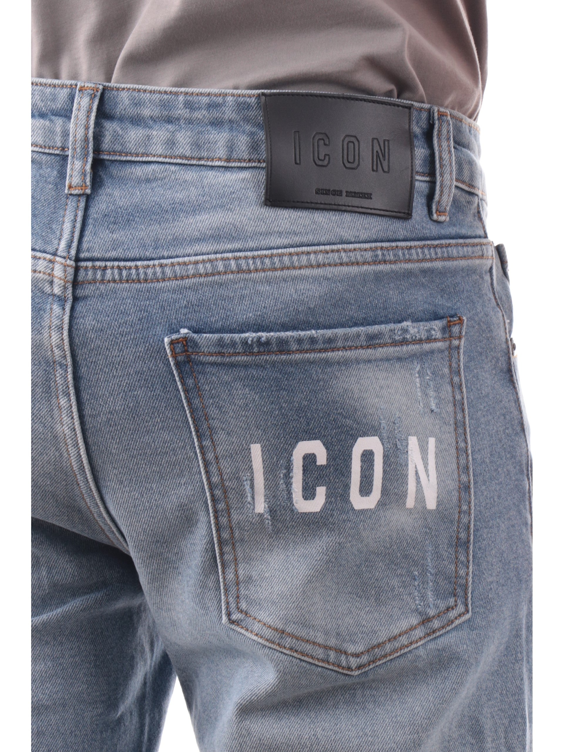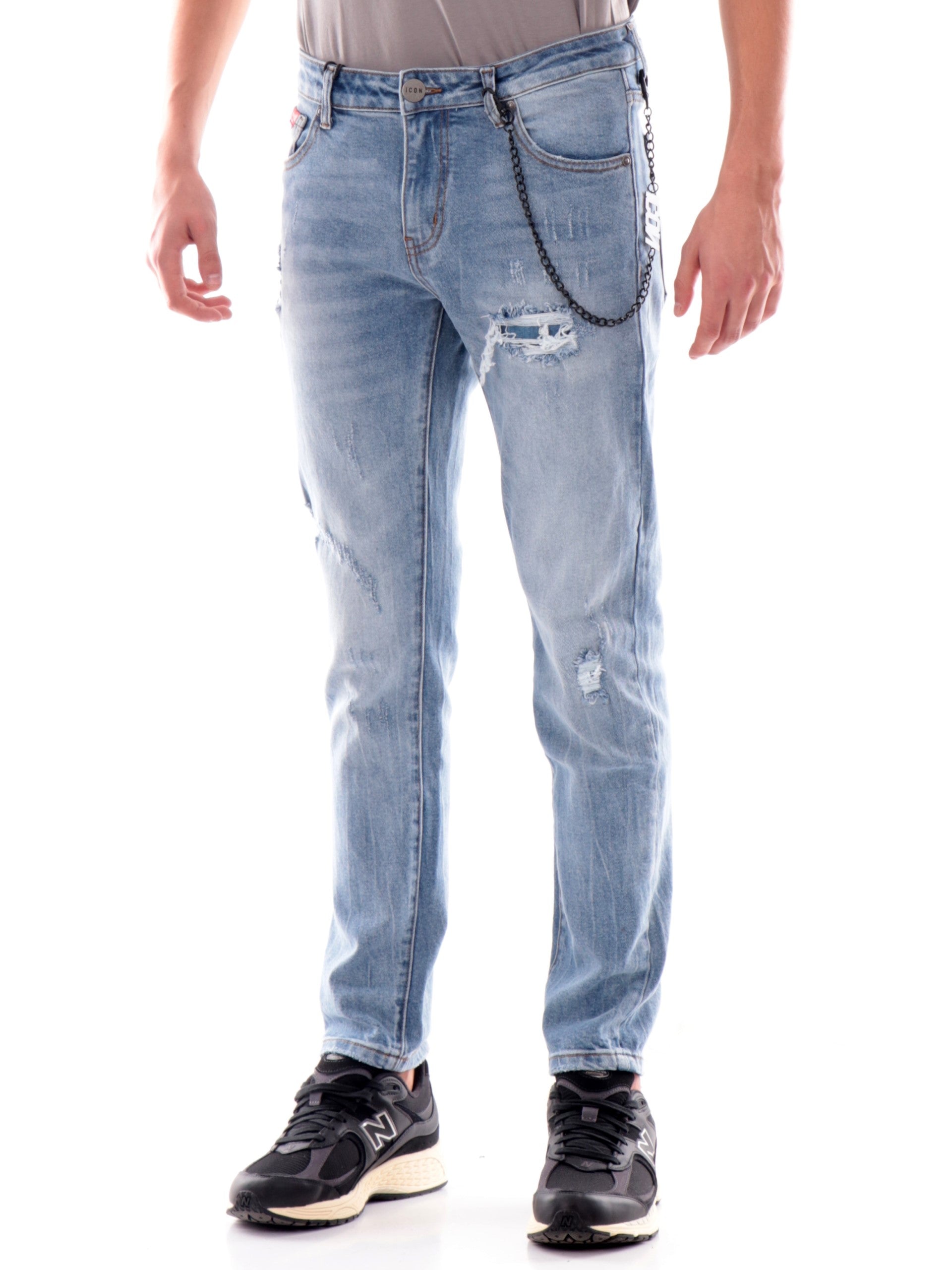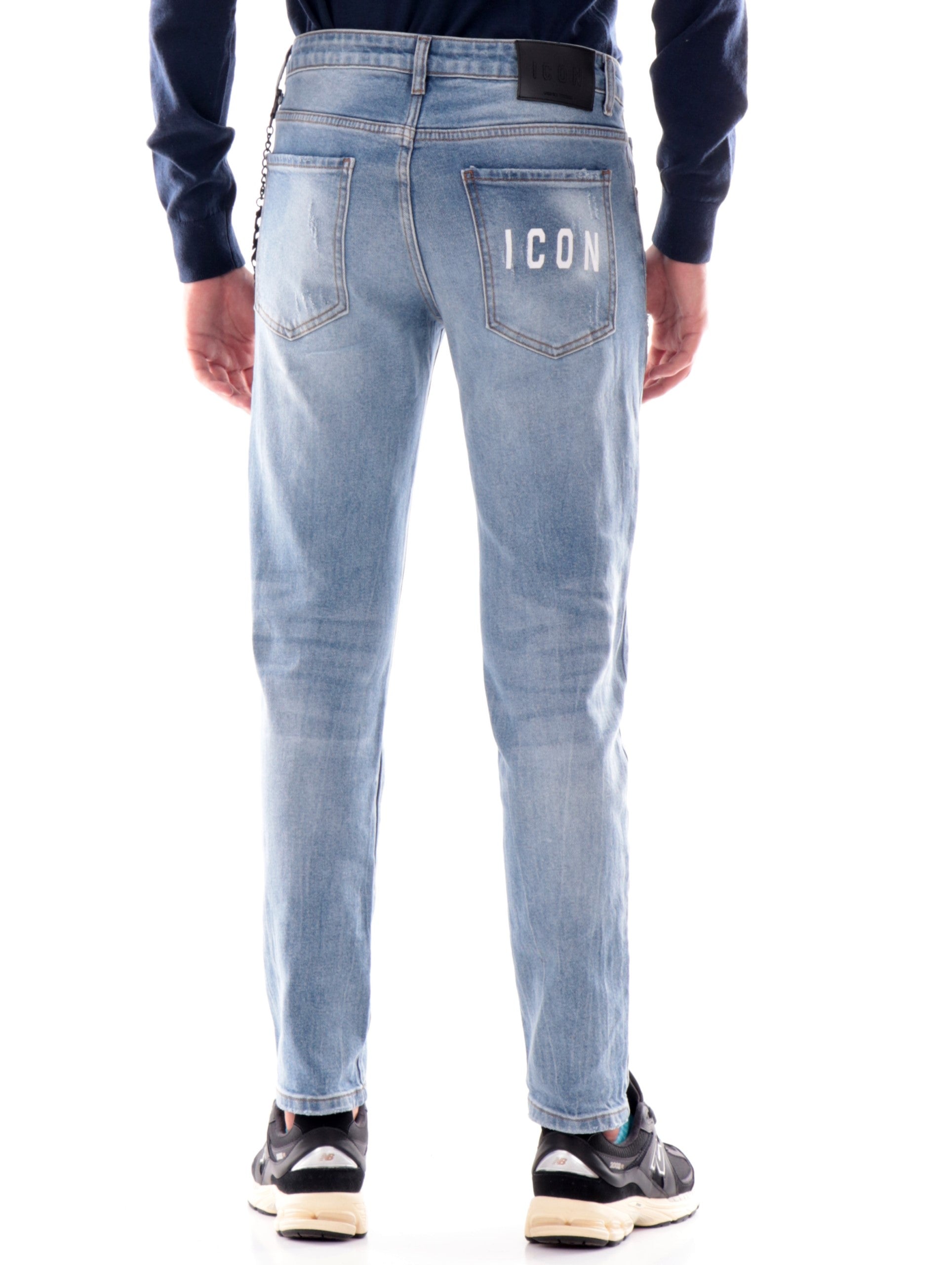 Jeans slim fit blu Icon strappati da uomo, realizzati 100% in cotone puro. Questi pantaloni jeans Icon blu hanno la chiusura con bottone più zip, cinque comode tasche, sul retro troviamo il logo del brand applicatto sulla tasca e inserti in tessuto strappato. Questi Jeans Icon blu sono caratterizzata da una catena removibile e sono perfetti su un look casual e sportivo