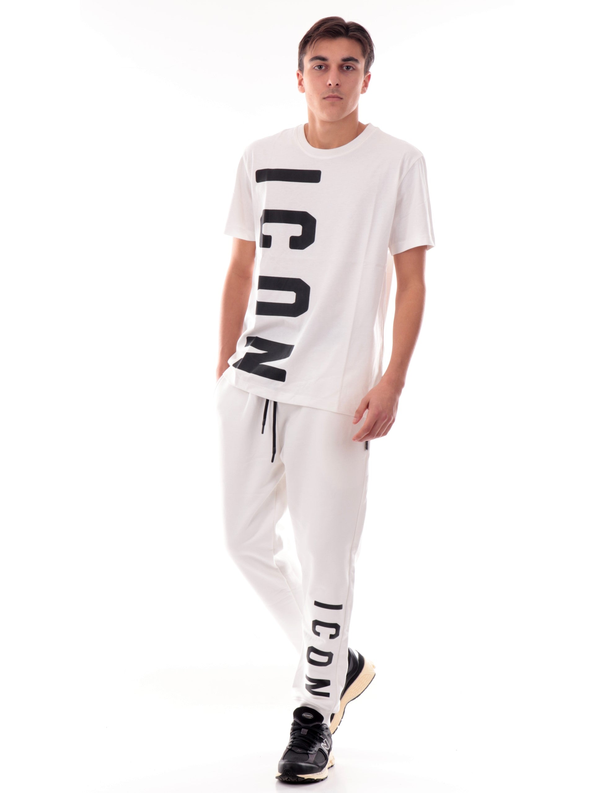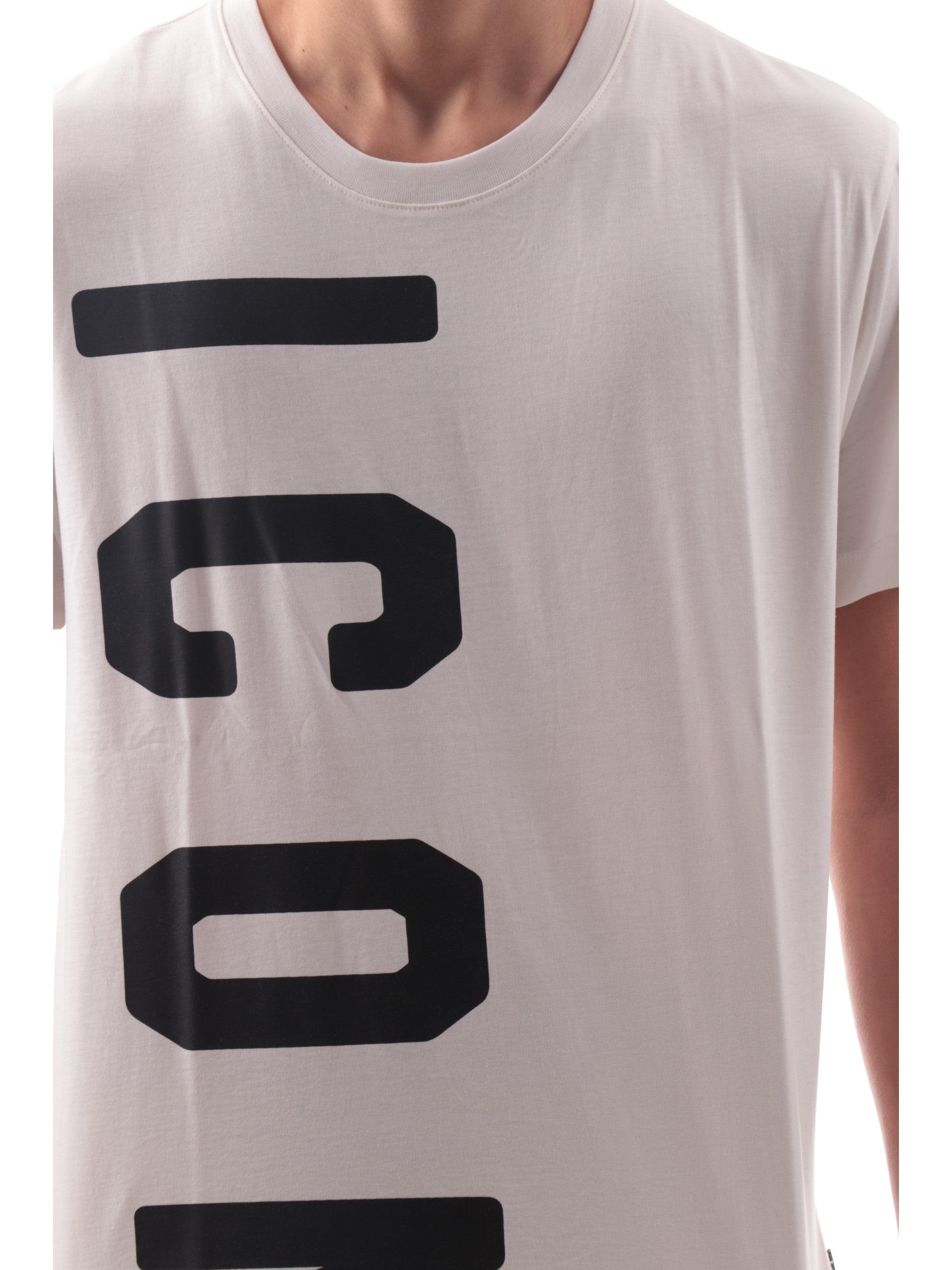 T-shirt Icon bianca girocollo da uomo. Questa t-shirt Icon bianca a girocollo a maniche corte è caratterizzata da un maxi logo nero laterale sul lato destro ed è realizzata in cotone puro, perfetto su tutti gli outfit