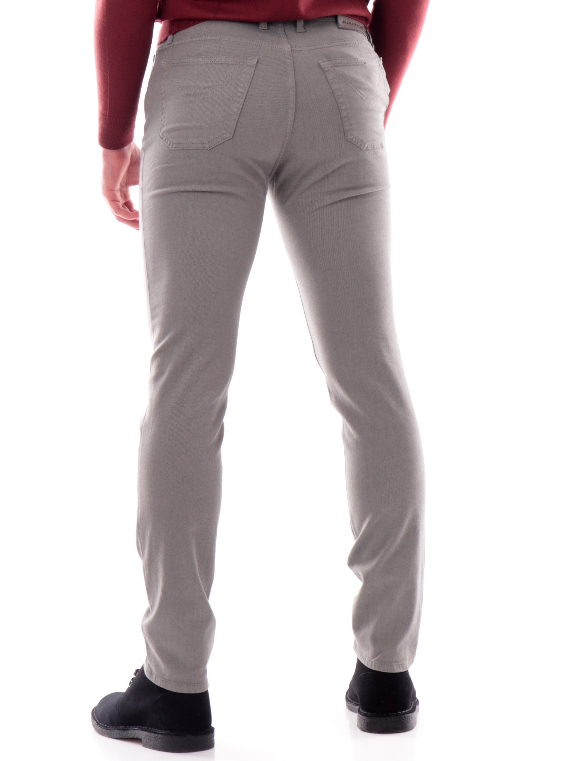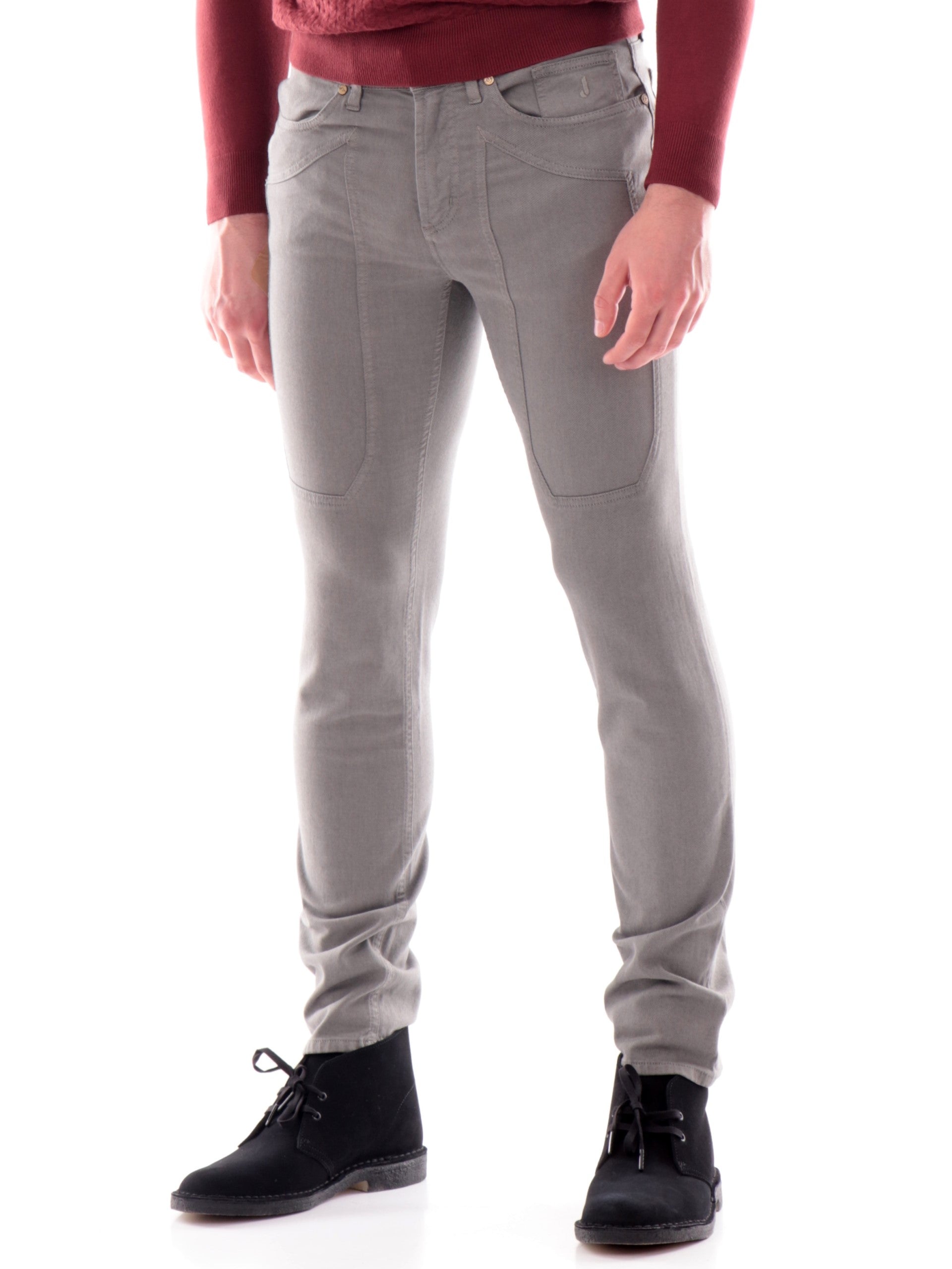 Pantaloni Jeans Jeckerson grigi da uomo. Questi jeans Jeckerson grigi da uomo realizzati in cotone hanno la chiusura con bottone logato più zip, due tasche laterali aperte, l'iconica toppa sul davanti, due tasche posteriori a filo e la vestibilità Slim.