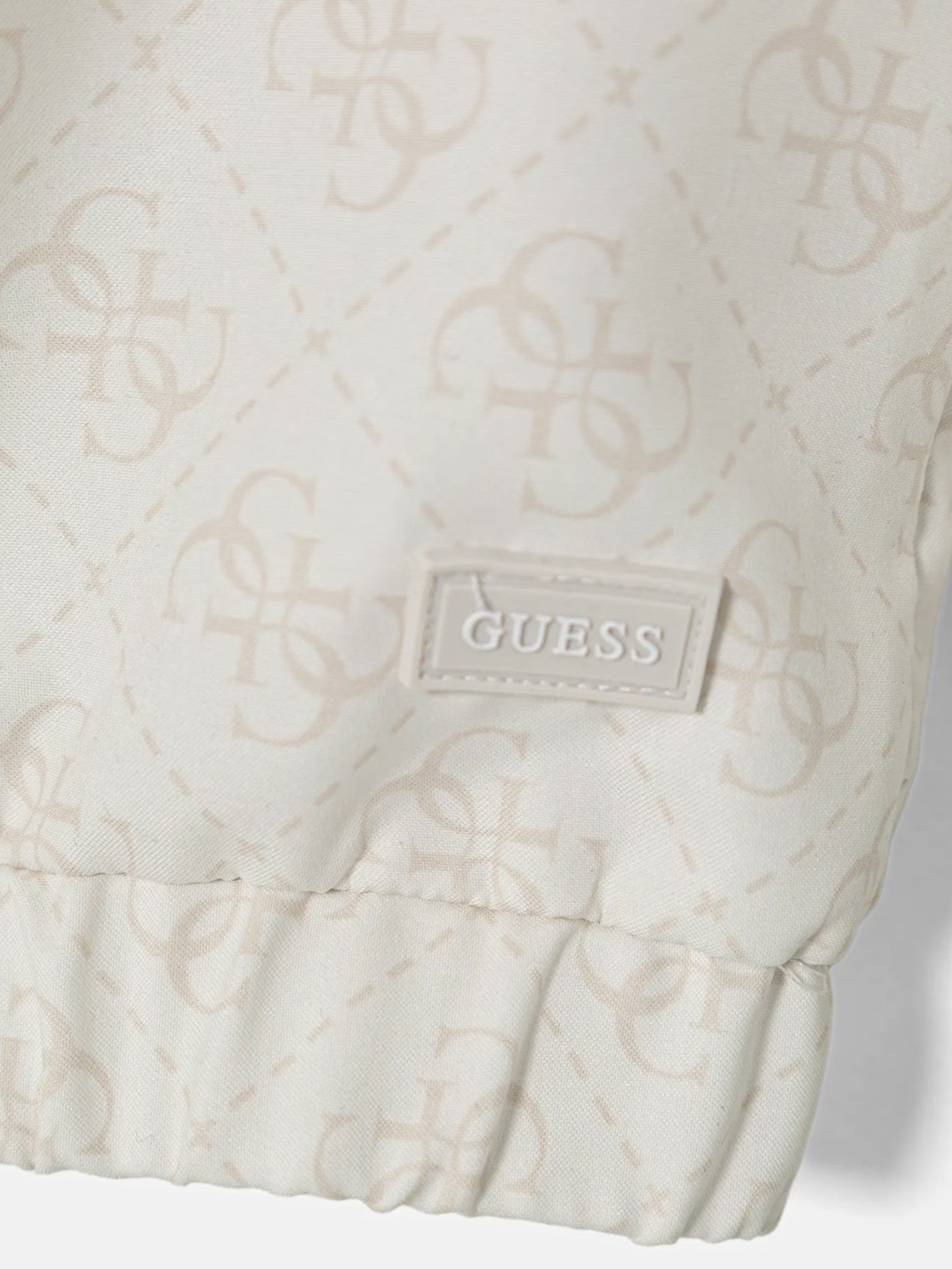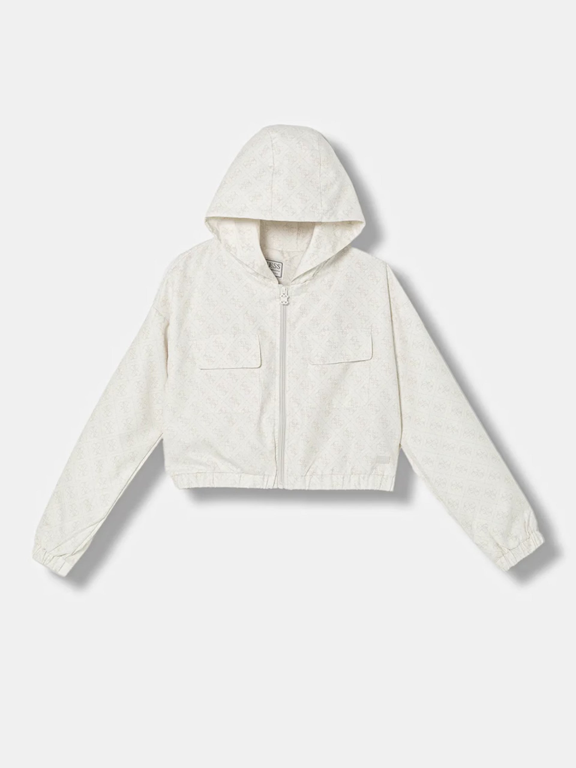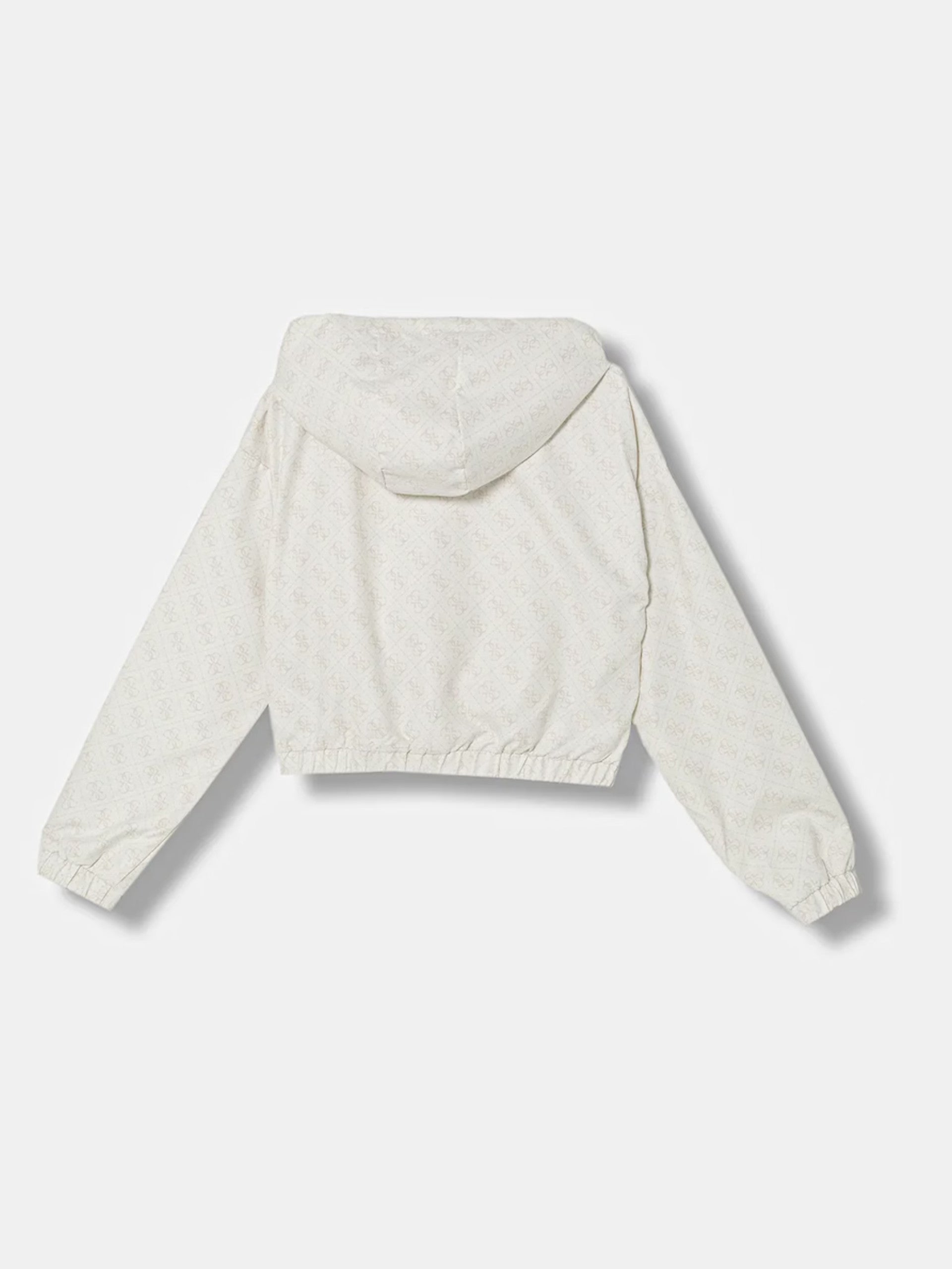 Giacca impermeabile beige Guess da bambina logo all over. Questa giacca Guess, realizzata da un tessuto impermeabile resistente all'acqua, perfetta per le giornate di pioggia, è caratterizzzata dal cappuccio fisso, chiusura centrale full zip, due tasche con patta altezza petto, logo Guess all over, polsini e fondo elasticizzati