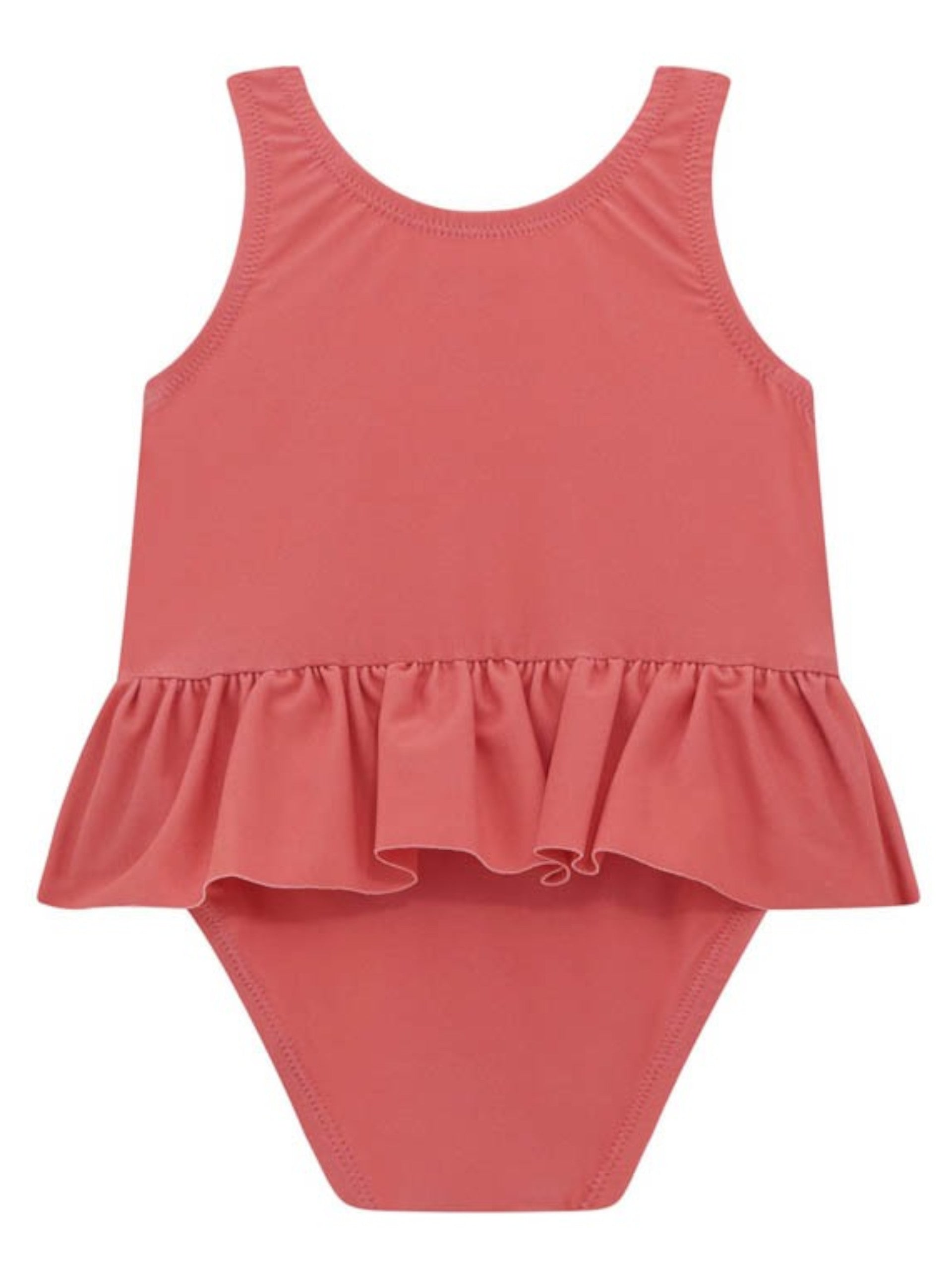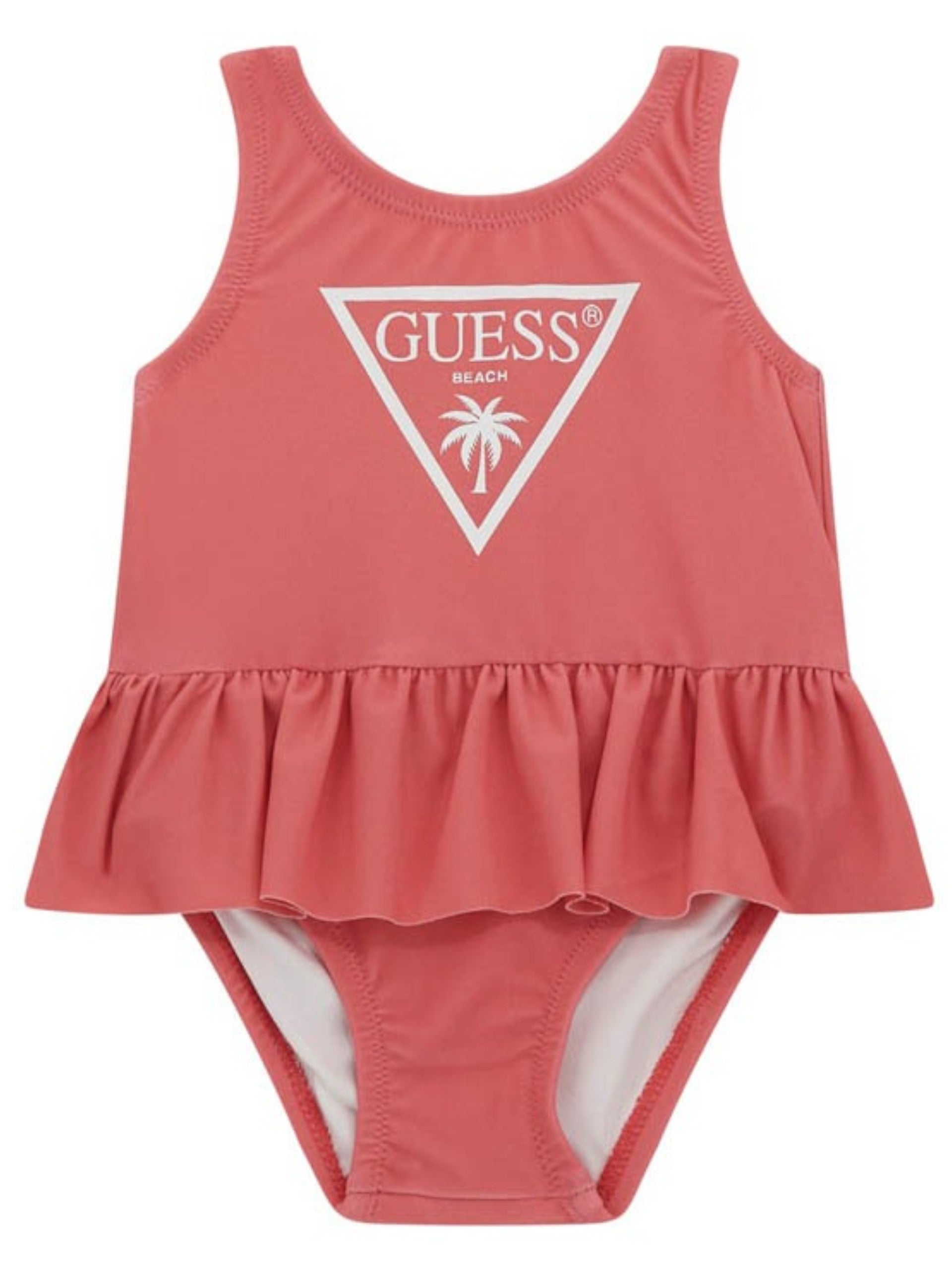 Costume mare Guess intero rosa da neonata A5GZ02KCA60. Questo costume Guess rosa ha le bretelline fisse, il fondo con gonnellina e il logo Guess stampato sul davanti.