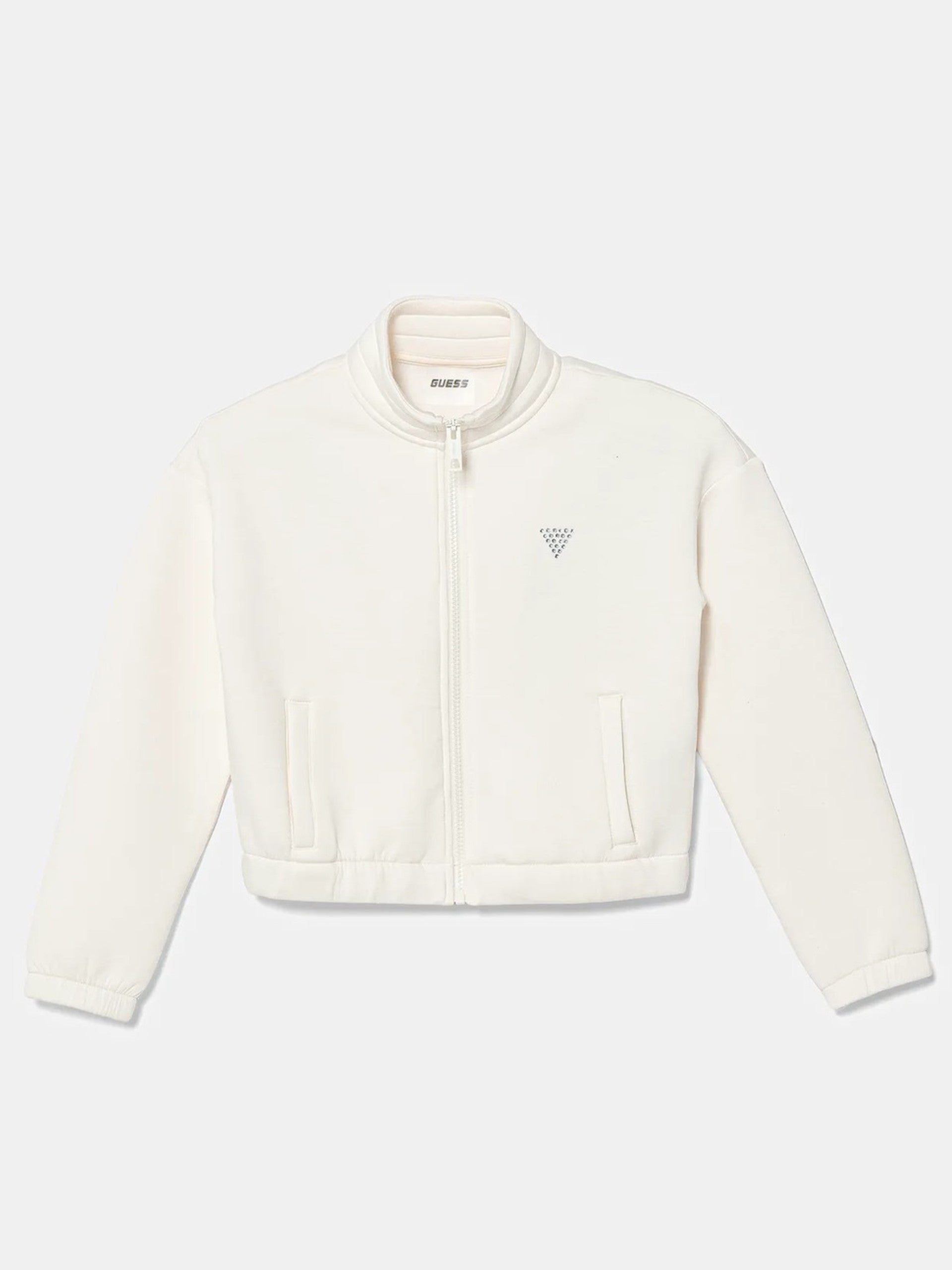 Felpa Guess bianca full zip da bambina logo con strass J5YQ31K7UW2. Questa felpa Guess bianca girocollo ha la chiusura full zip centrale, due tasche laterali aperte, polsini elasticizzati e il maxi logo Guess sul lato posteriore con strass.