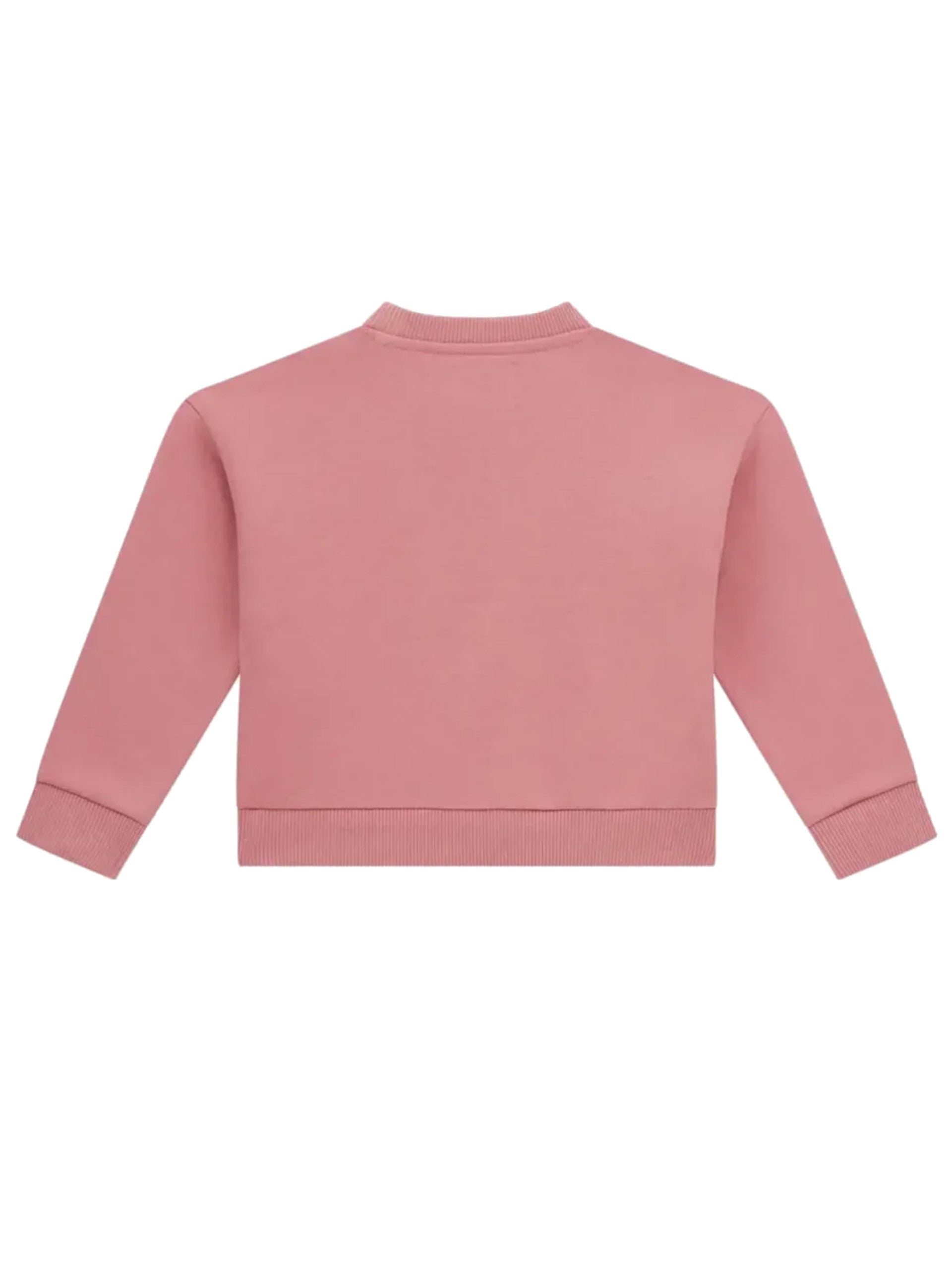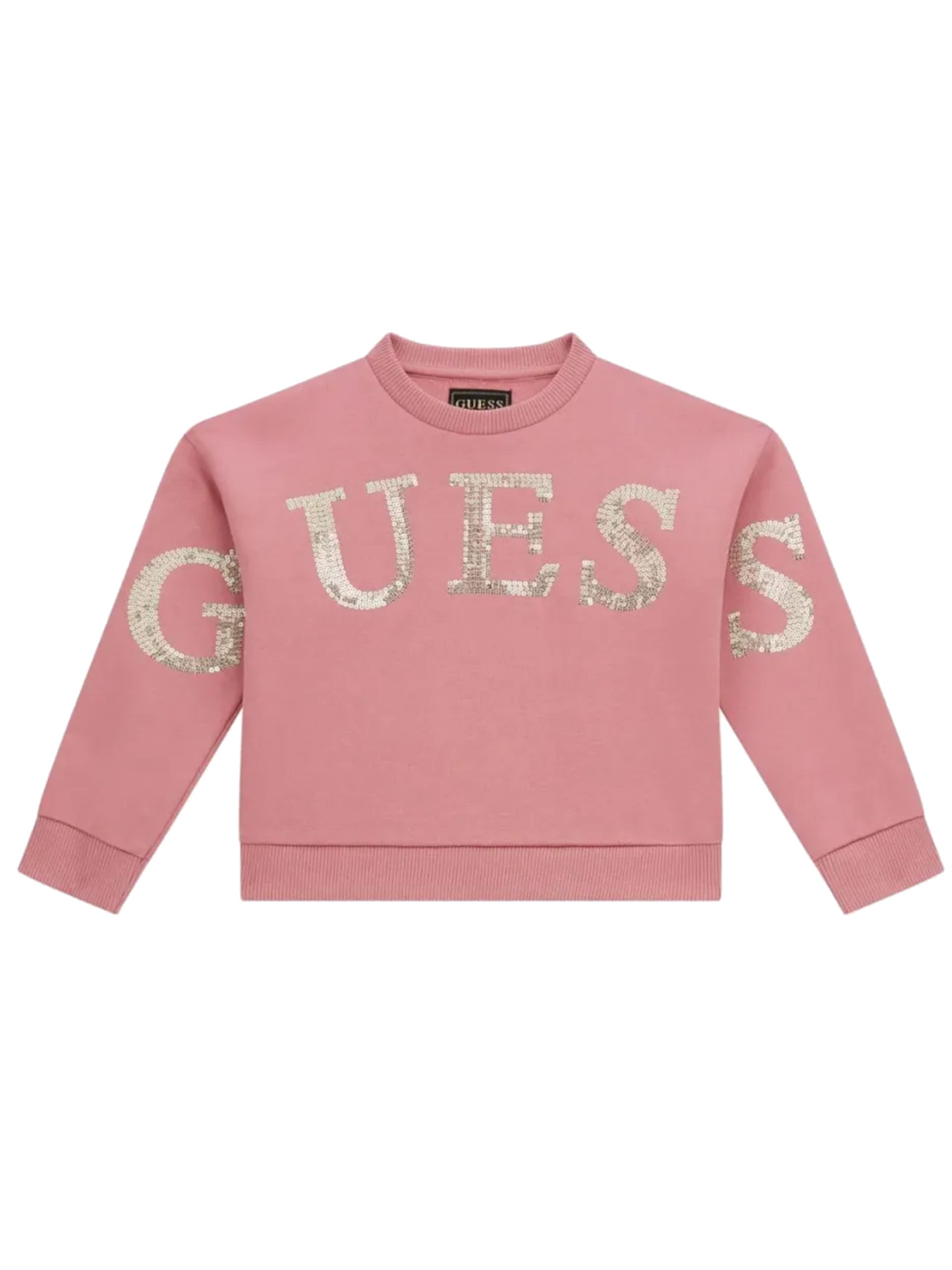 Felpa Guess rosa da bambina logo con paillettes K5YQ09KAV34, realizzata in cotone felpato. Questa felpa Guess rosa girocollo ha le maniche lunghe, il maxi logo Guess sul davanti con paillettes, polsini e fondo elasticizzati.