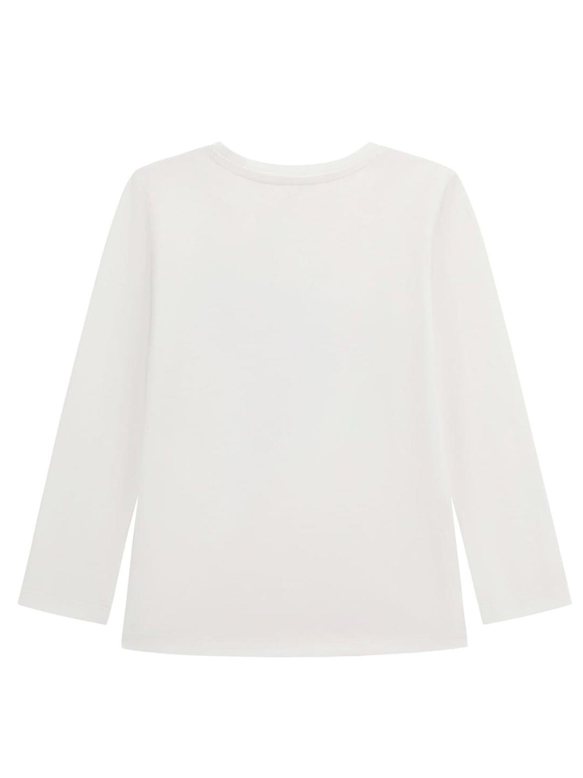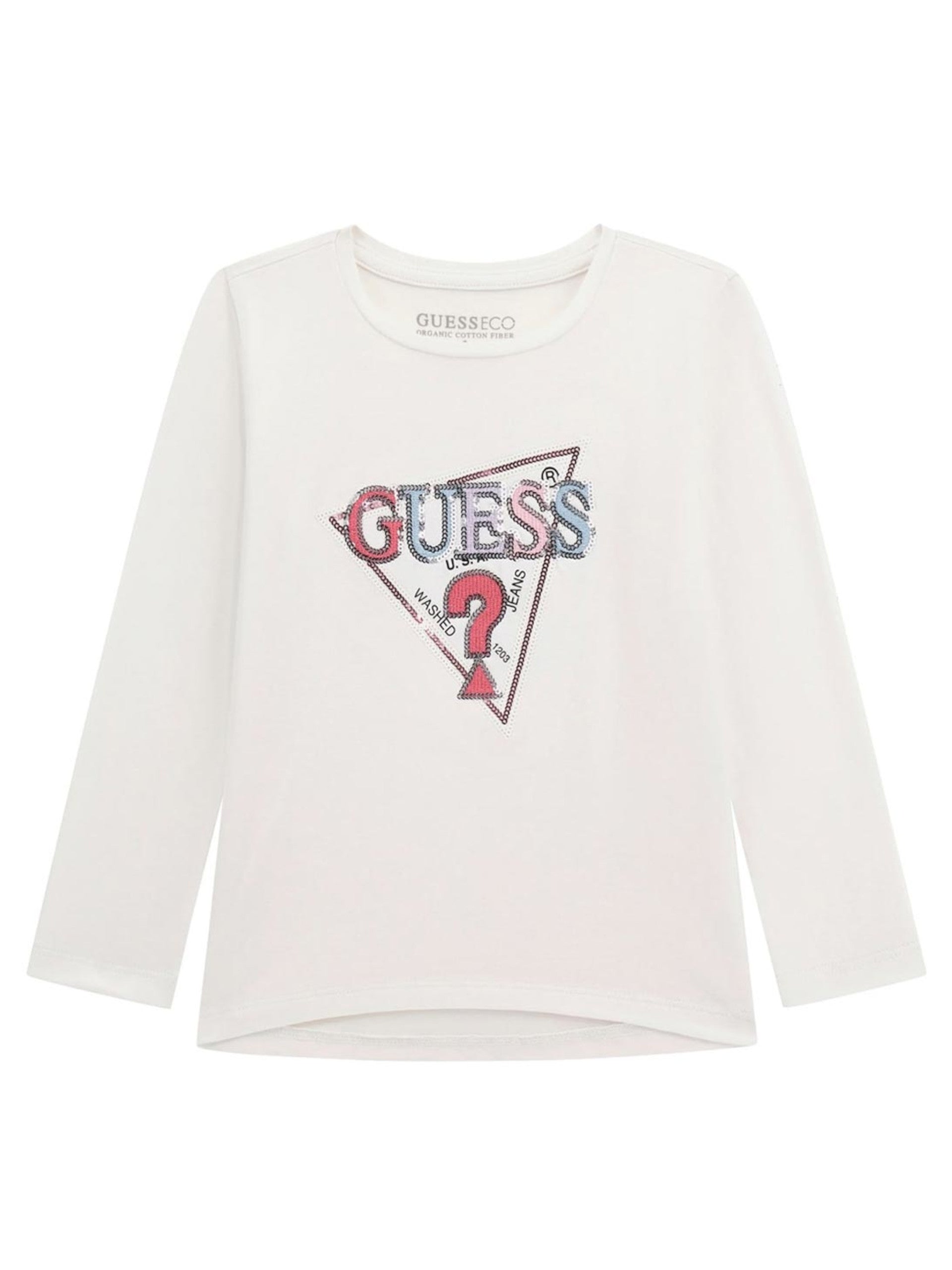 Maglia Guess bianca da bambina logo Guess con paillettes K5YI10K6YW4, realizzata in cotone. Questa t-shirt Guess girocollo ha le maniche lunghe e il logo Guess sul davanti con paillettes.
