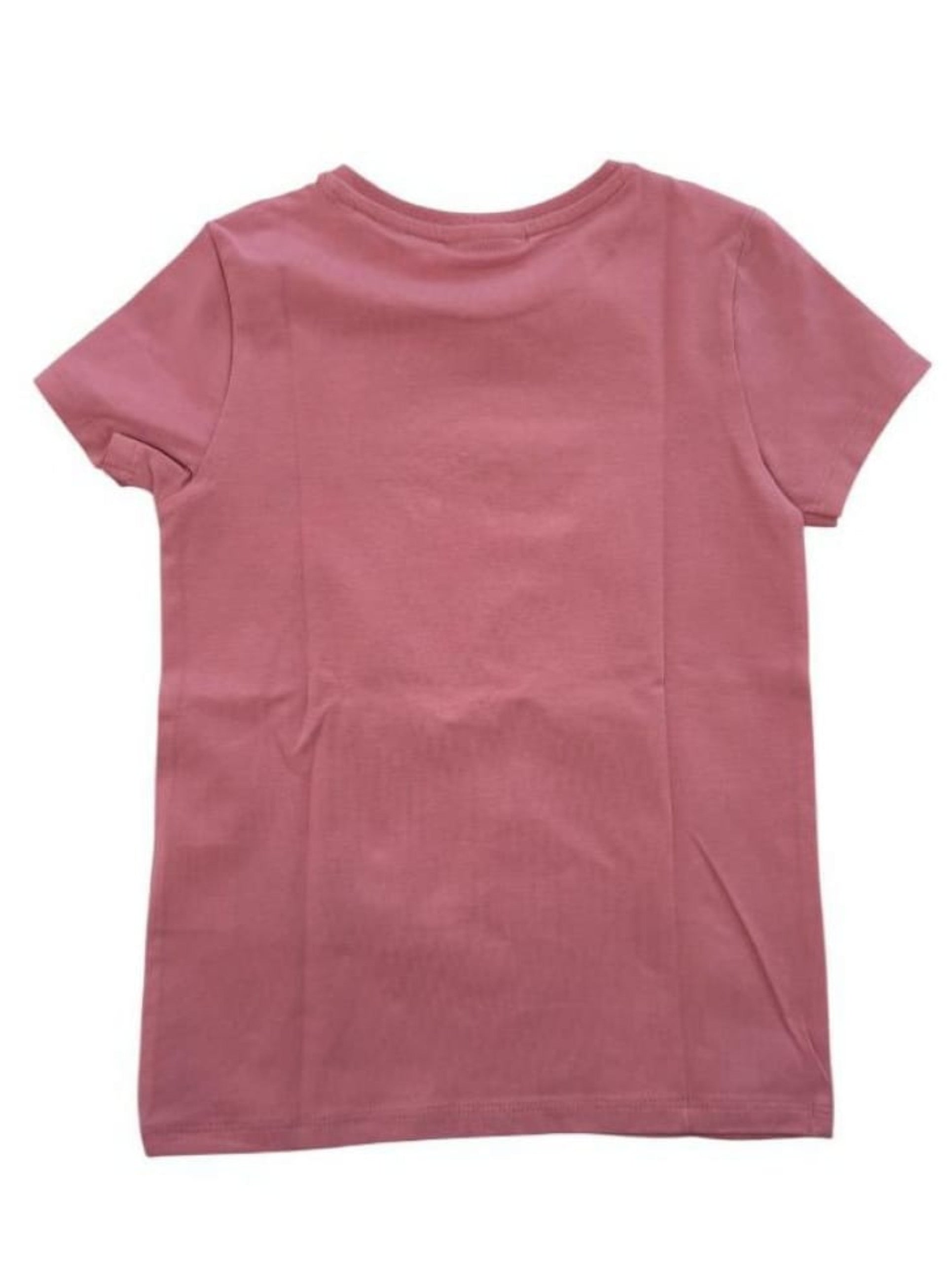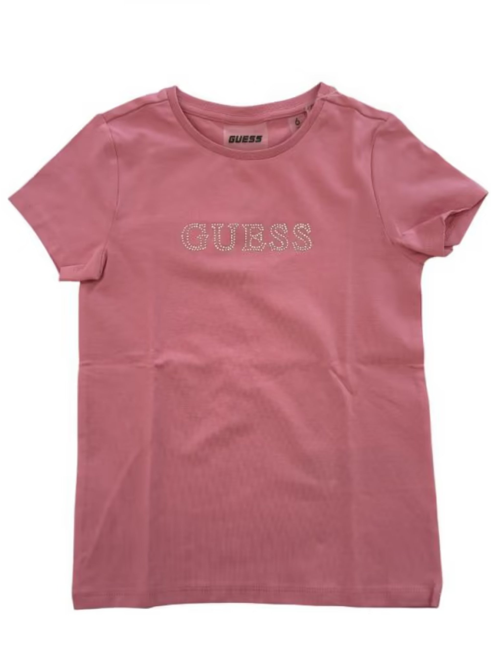 Maglia Guess rosa da bambina logo con strass J4RI49J1314, realizzata in cotone. Questa t-shirt Guess rosa girocollo ha le maniche corte e il logo Guess sul davanti con strass.