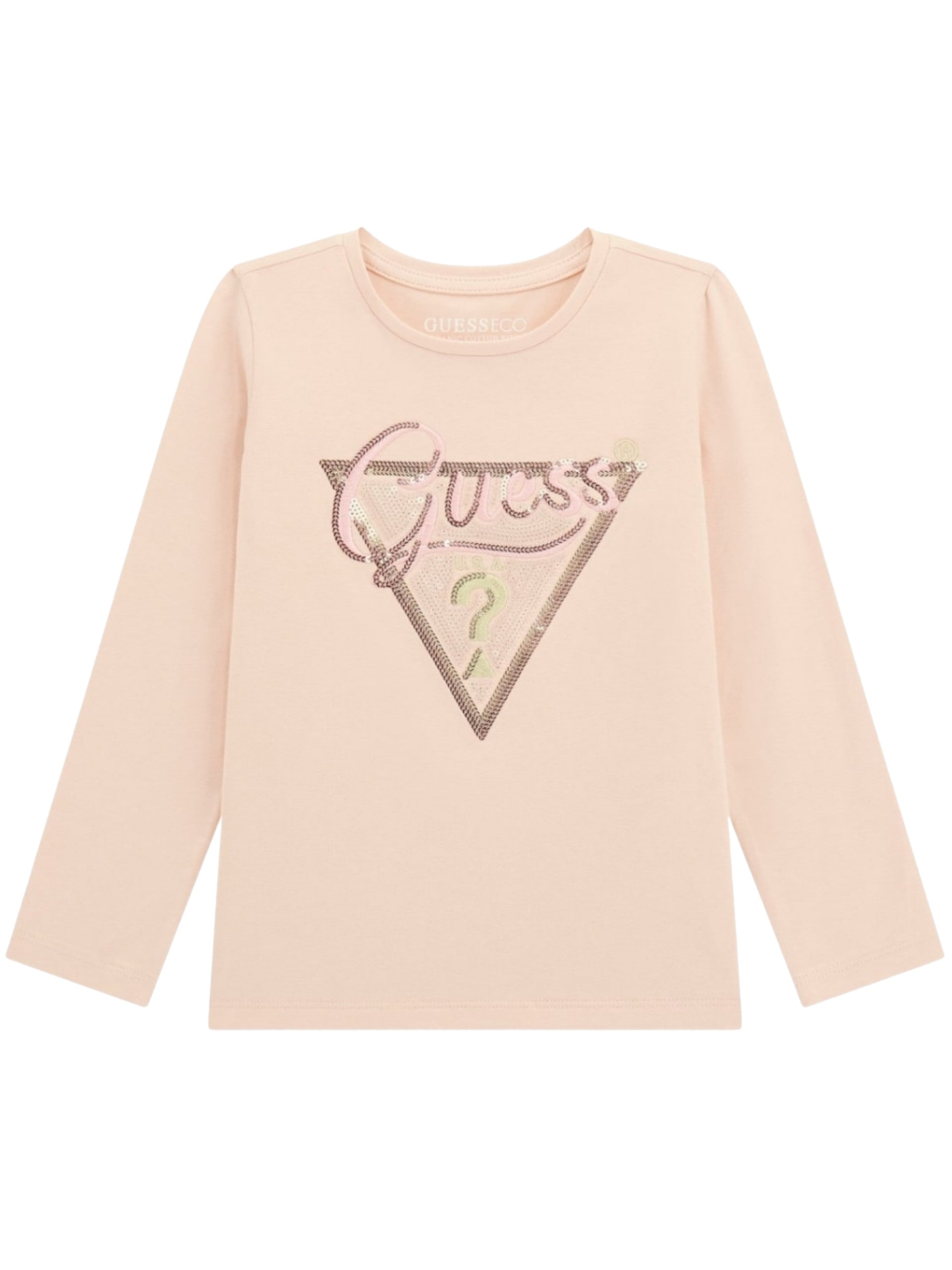 Maglia Guess rosa da bambina maxi logo. Questa maglia Guess rosa è realizzata in cotone ed è caratterizzata dal girocollo, maniche lunghe, polsini e findo regolari e sul davanti troviamo il maxi logoGuess con pilletes