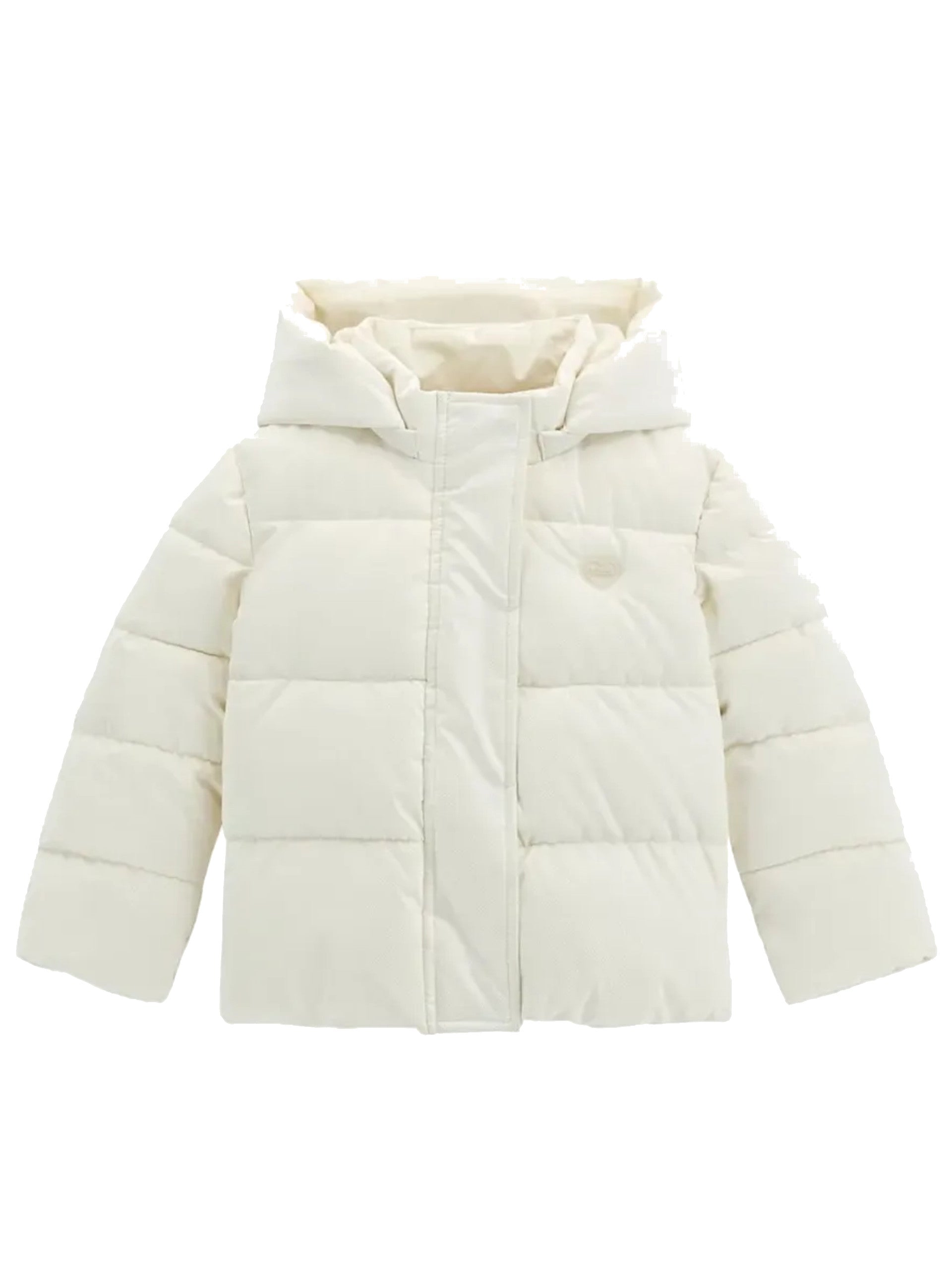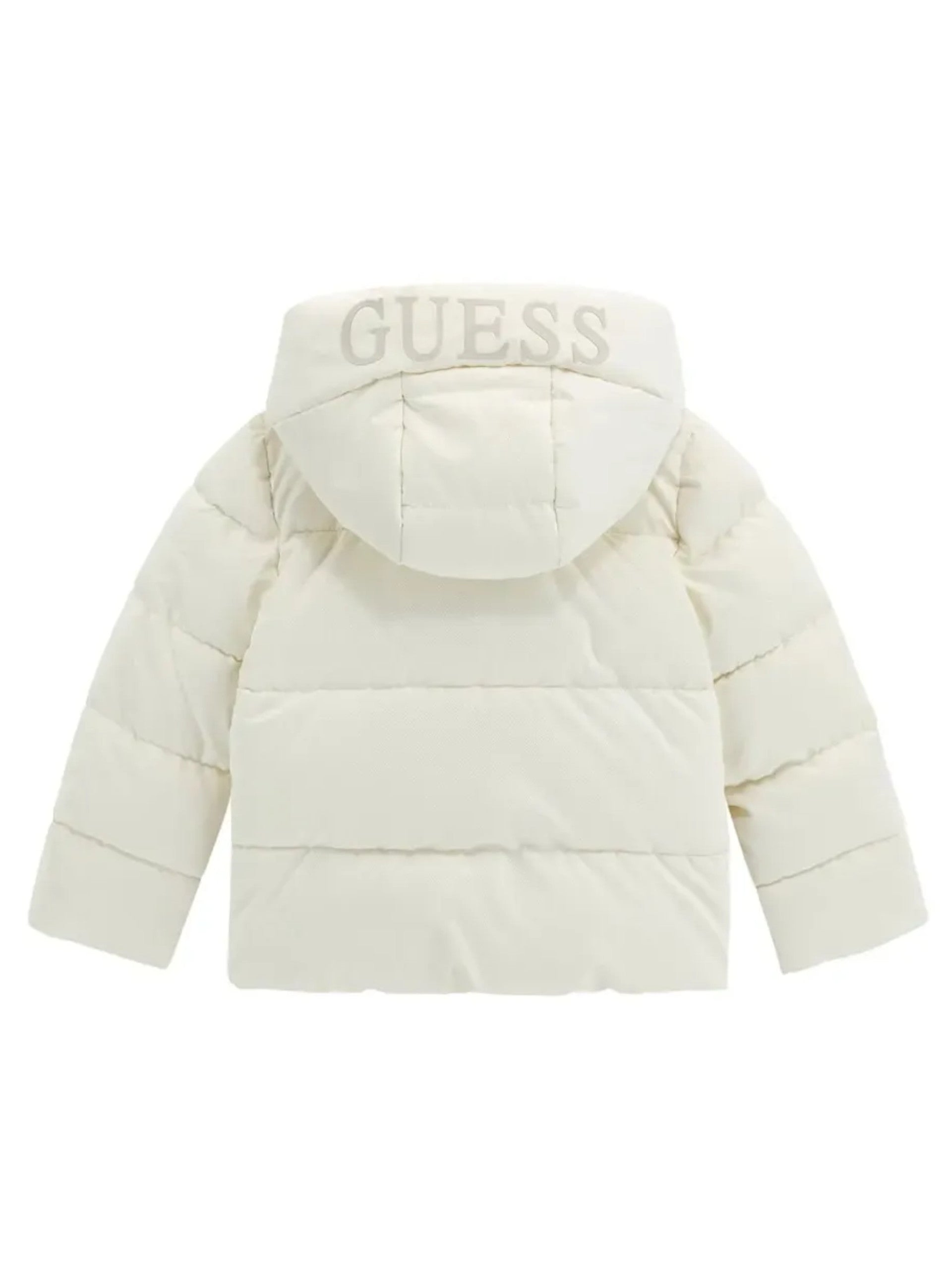 Piumino Guess bianco da neonata con cappuccio full zip K5BL04WGIW0. Questo giubbino neonata Guess ha il cappuccio fisso con logo Guess applicato, la chiusura full zip centrale nascosta da una patta con bottoni automatici e il patch Guess applicato sul cuore.