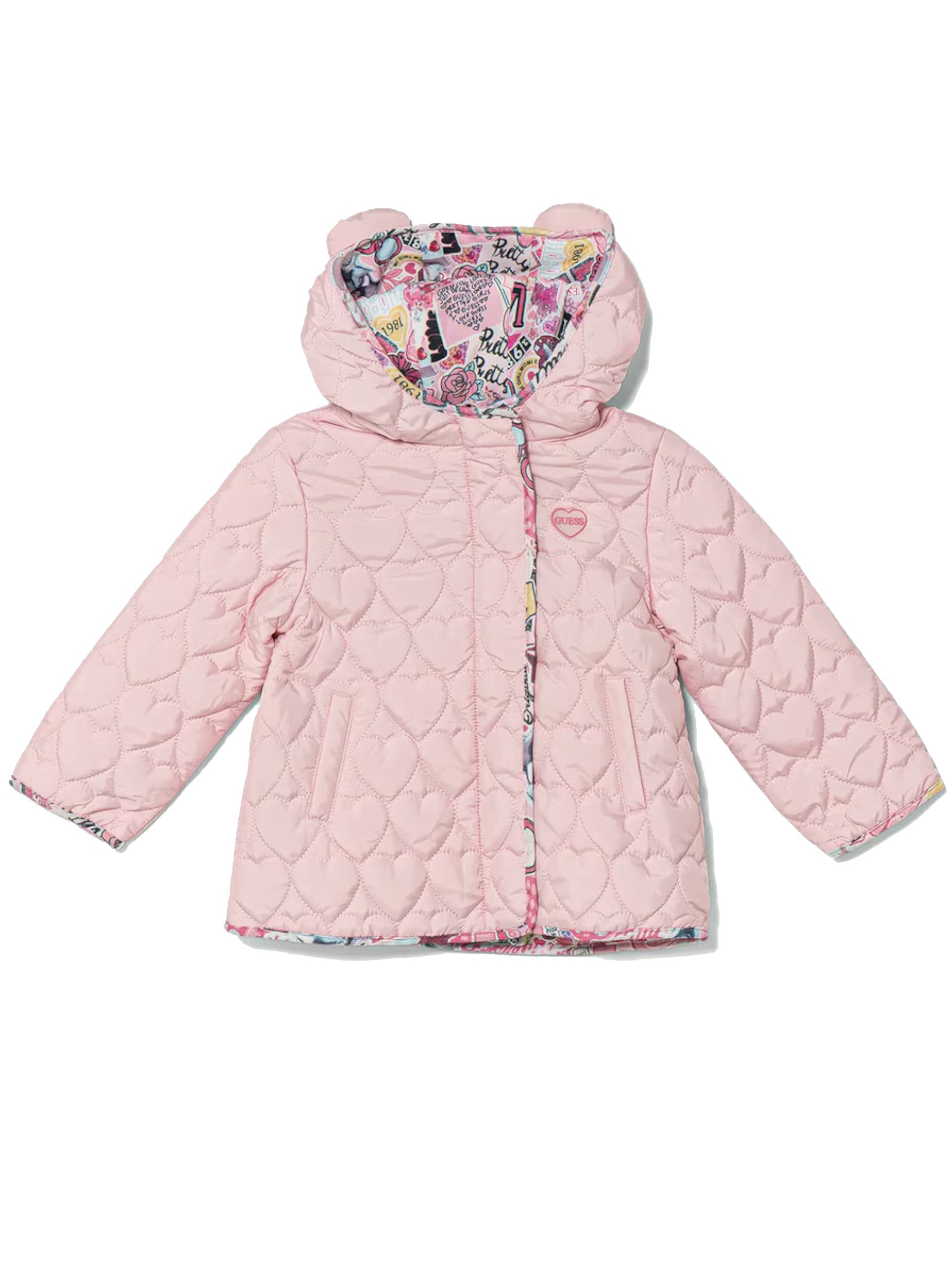 Piumino Guess rosa da bambina trapuntato a cuori A5YL00WCFM0. Questa giacca Guess bambina ha il cappuccio fisso con delle simpatiche orecchie, la chiusura full zip centrale nascosta da una patta con bottoni automatici, due tasche laterali aperte e il patch Guess applicato lato cuore.