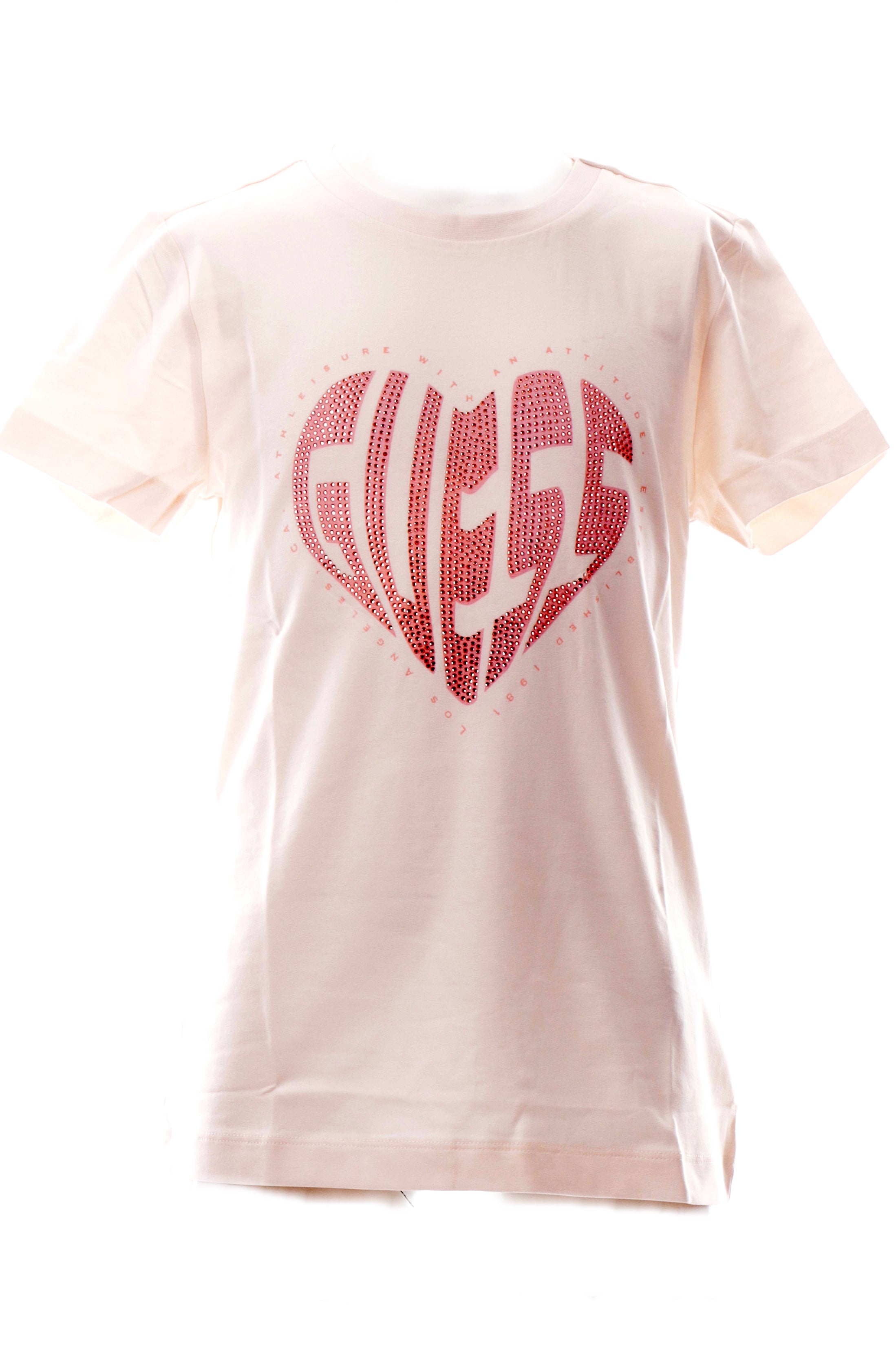 T-shirt Guess rosa da bambina con strass Minime J5RI46J1314, realizzata in cotone. Questa maglia Guess girocollo ha le maniche corte e il logo del brand a forma di cuore con strass.